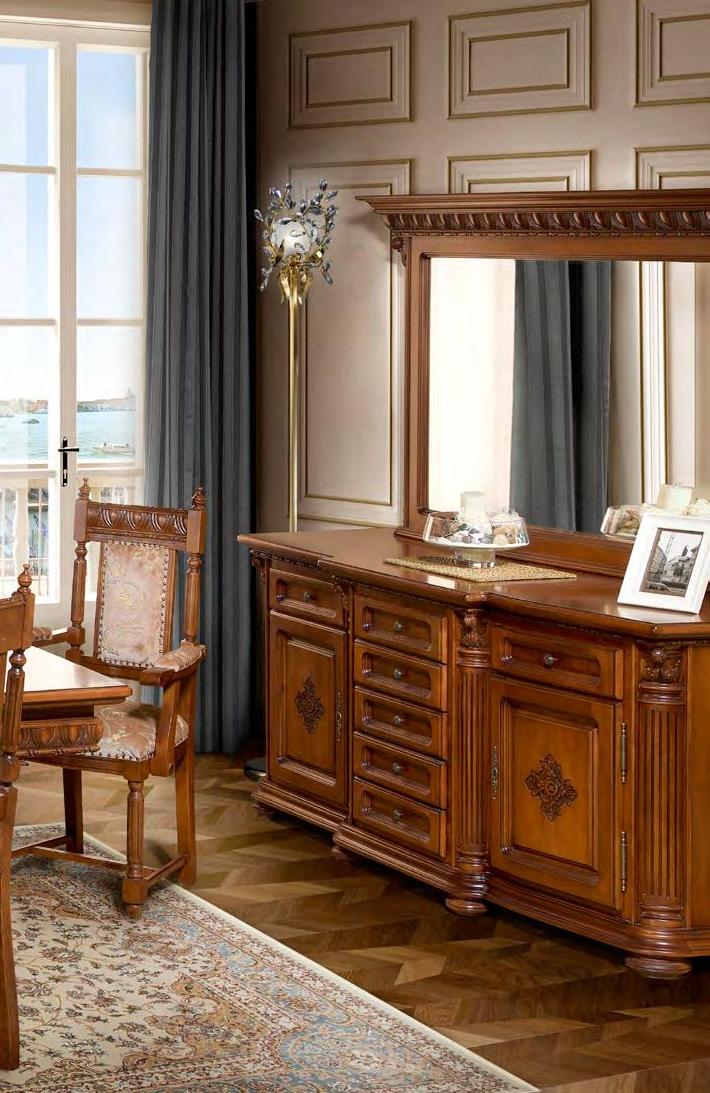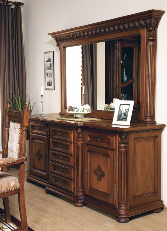 Комплект мебели для гостиной из коллекции Венеция Люкс от фабрики Simex состоит из 2-х предметов и включает: буфет для хранения столового белья и большое прямоугольное зеркало.