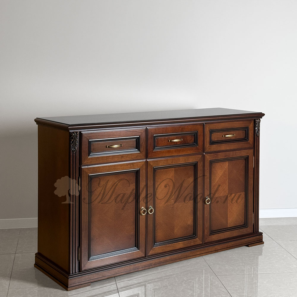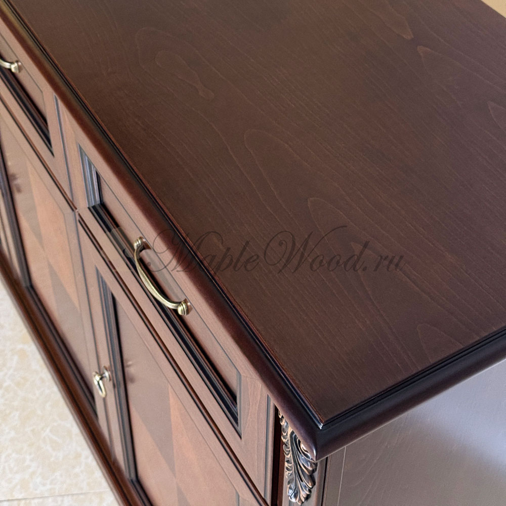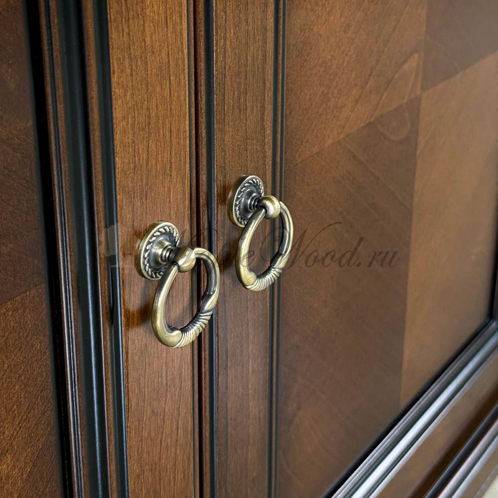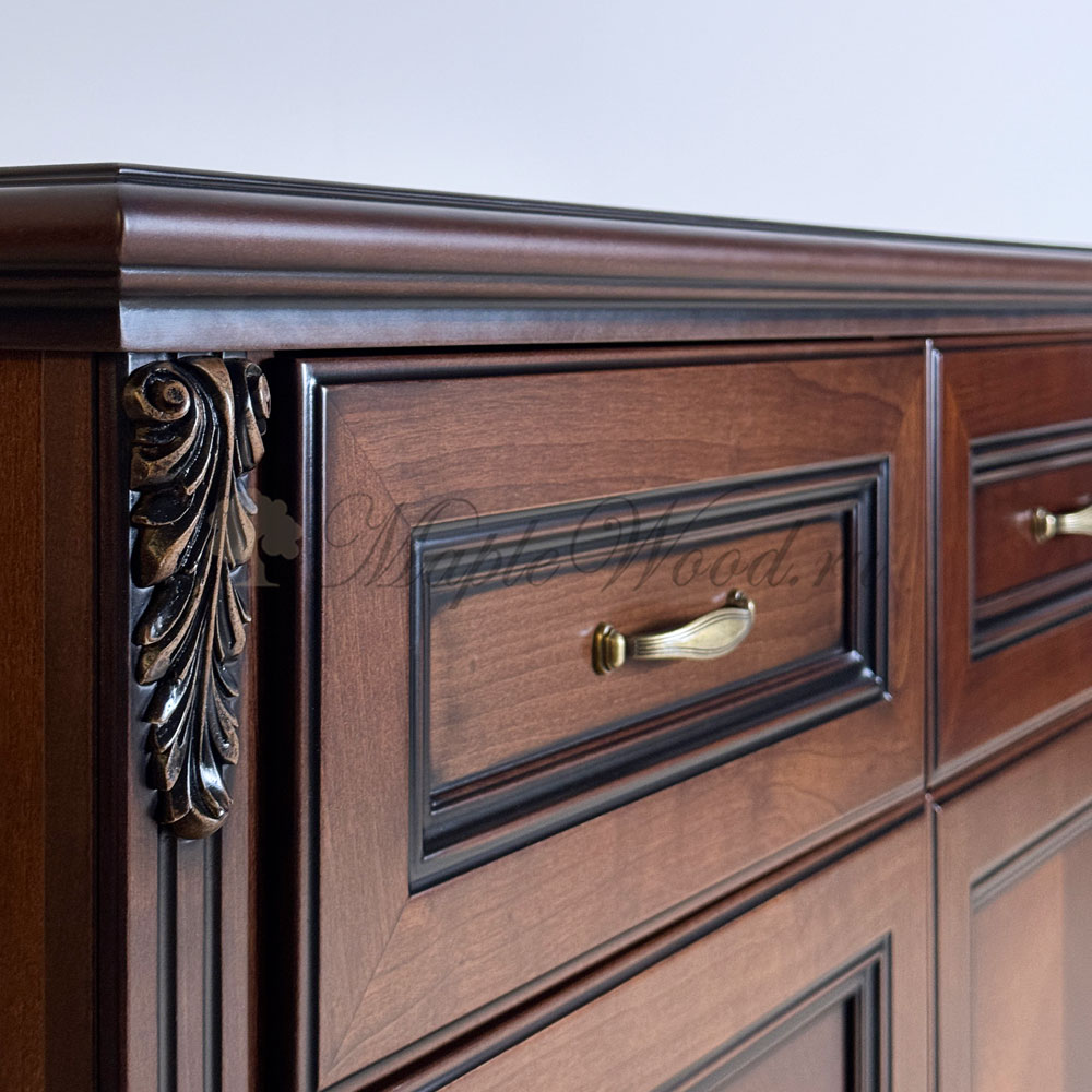 Буфет выполнен в благородном оттенке из шпонированного МДФ с элементами из массива дерева и декорирован контрастной патиной, которая подчеркивает акцентные элементы изделия.