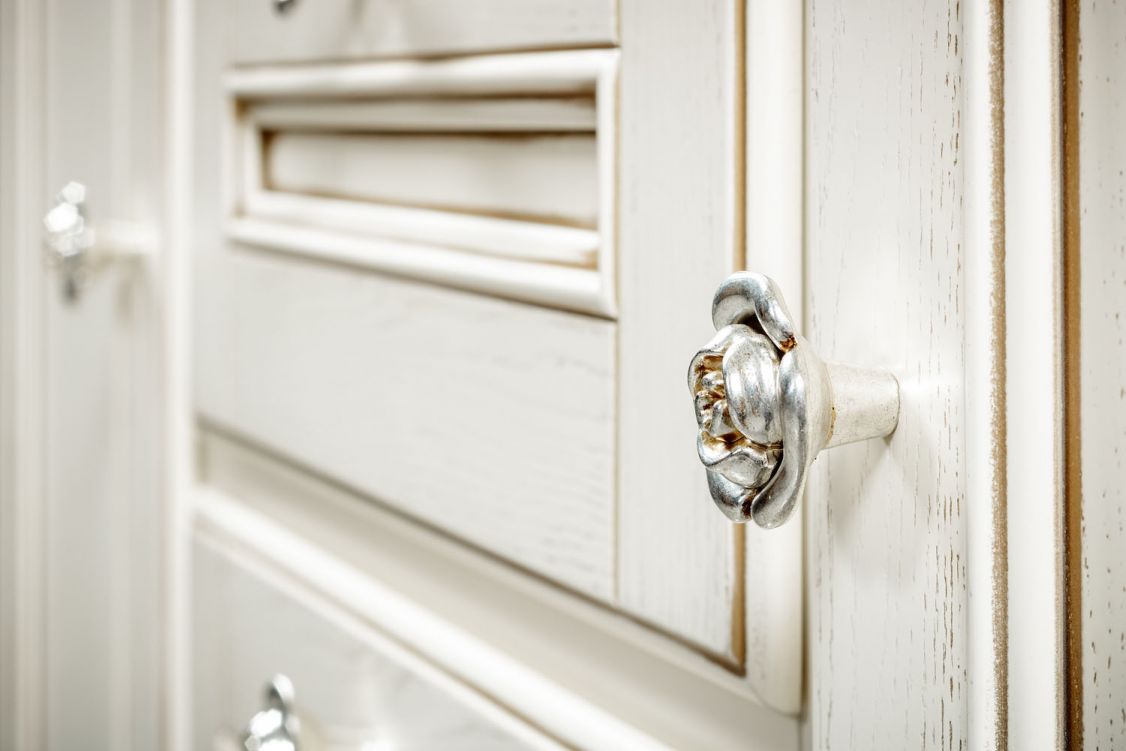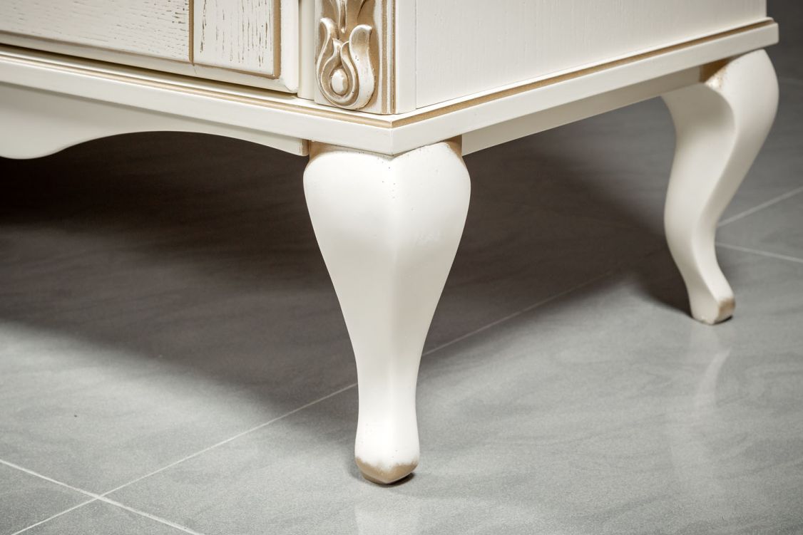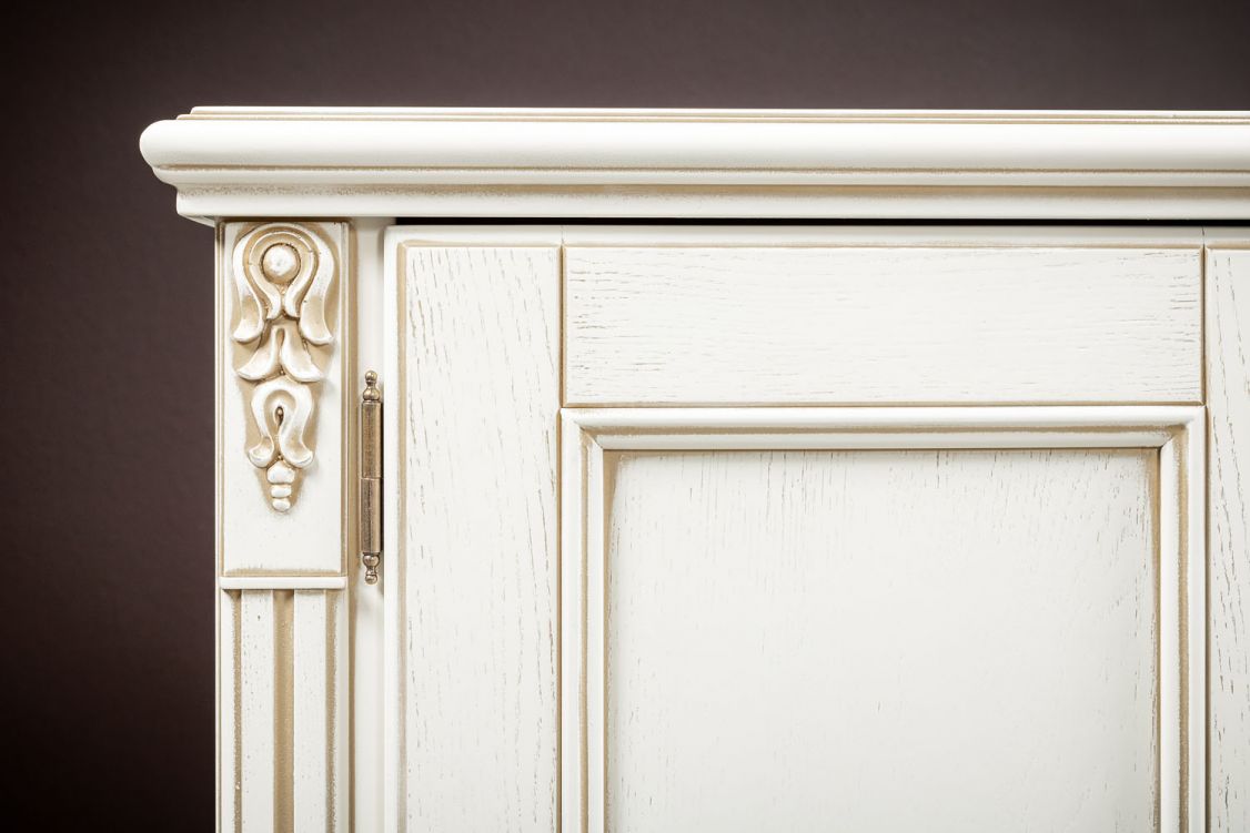 Изделие выполнено в классическом стиле из шпонированного МДФ с элементами из массива дерева и декорировано контрастной патиной, которая подчеркивает акцентные элементы изделия.