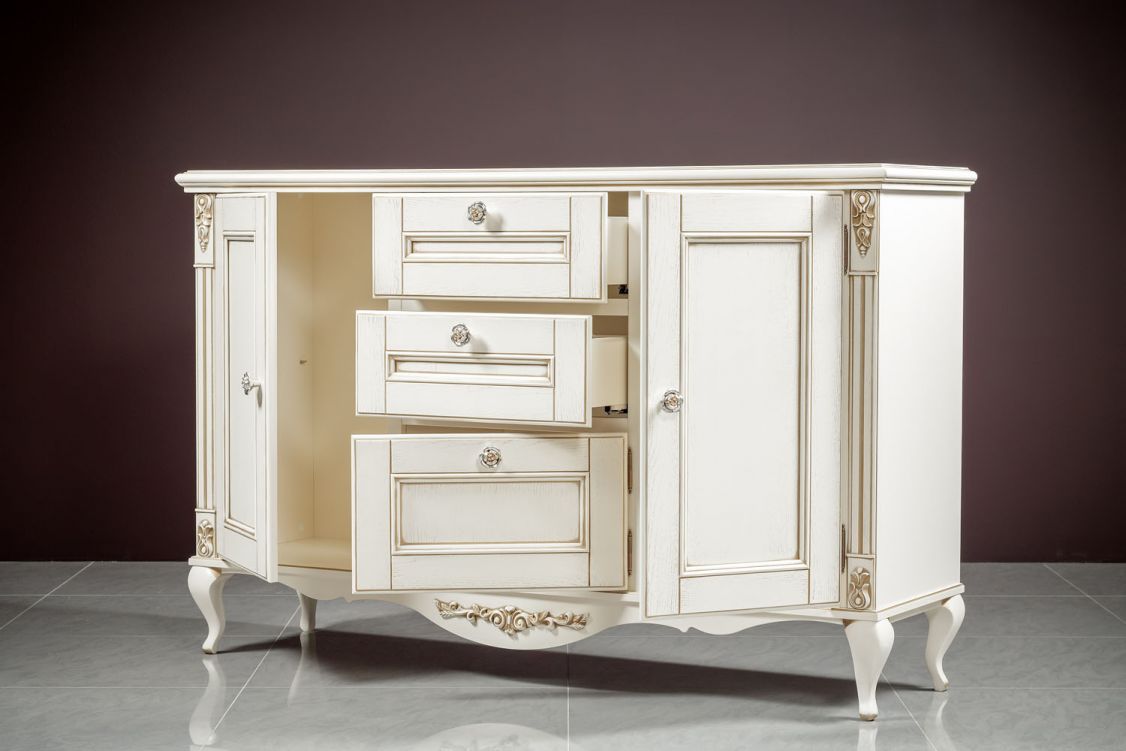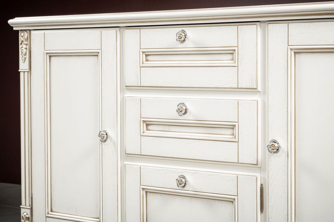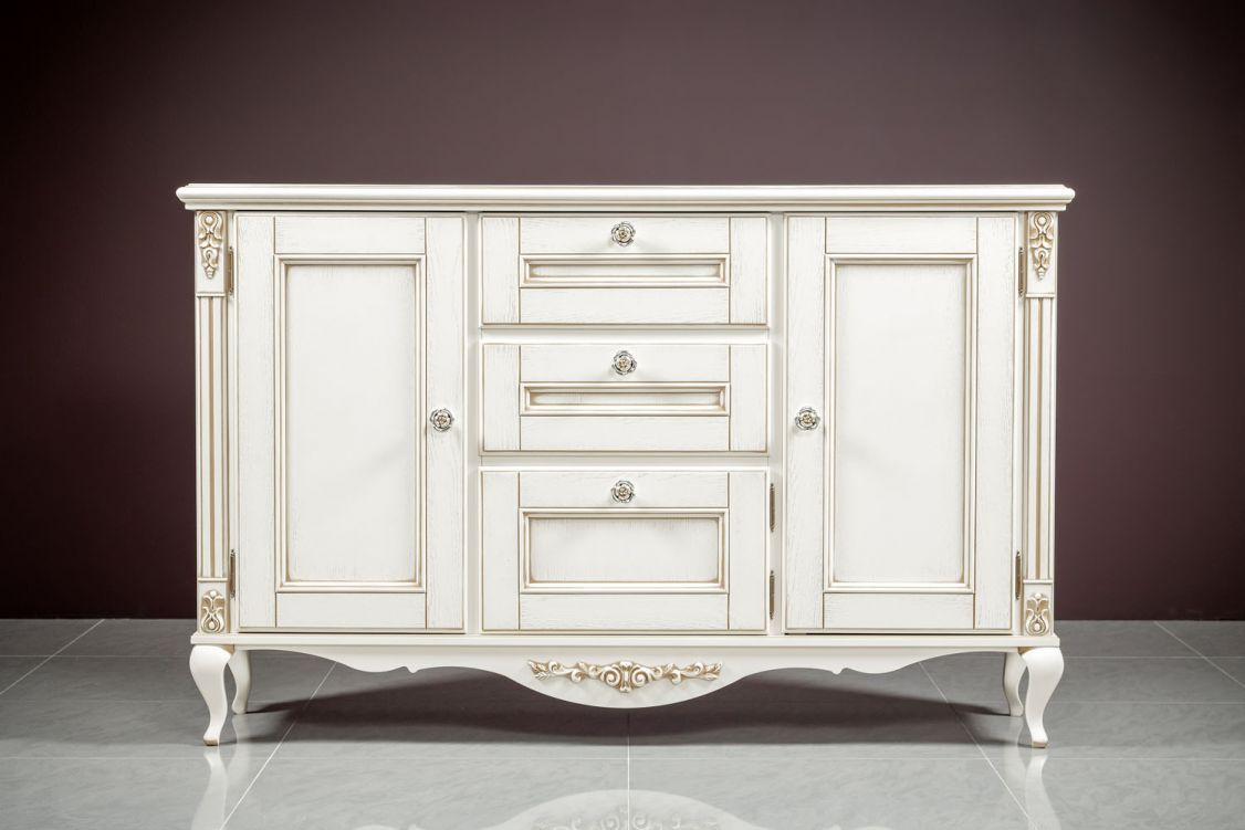 Изящный буфет для гостиной из коллекции Неаполь от фабрики Тимбер оборудован полками за распашными дверцами и тремя выдвижными ящиками, которые оснащены системой плавного закрывания.