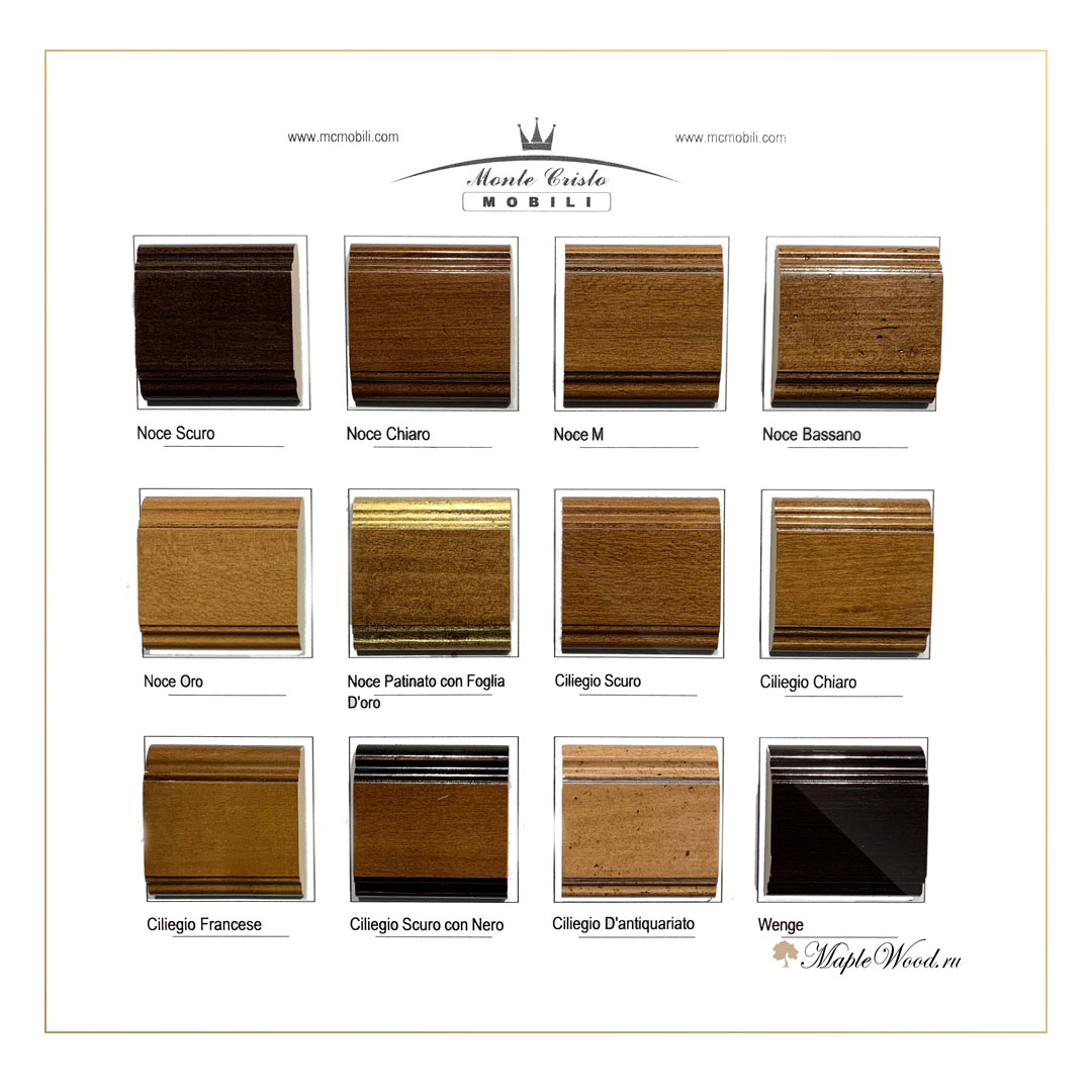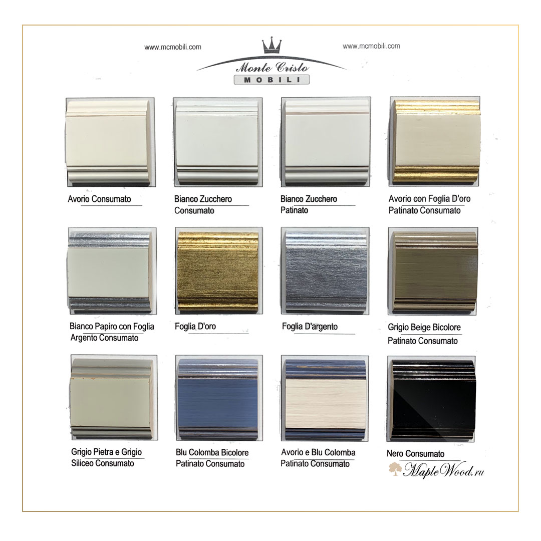 Светлый орех | Тёмный орех | Золотой орех | Орех Bassano | Орех + Патина | Тёмная черешня | Светлая черешня | Венге | Слоновая кость | Белый + Патина | Чёрный | Серый | Серо-зелёный | Серо-бежевый | Голубой | Голубой + Бежевый