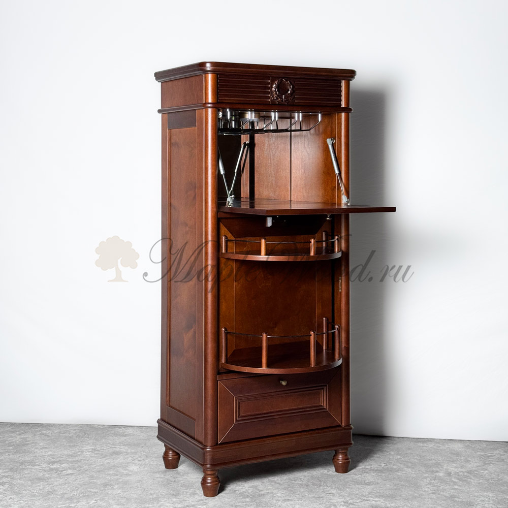Оригинальный барный комод для гостиной и рабочего кабинета, выполненный из массива карельской березы и произведённый в Беларуси, является репликой известной коллекции Мария Сильва от румынского производителя Monte Cristo Mobili.