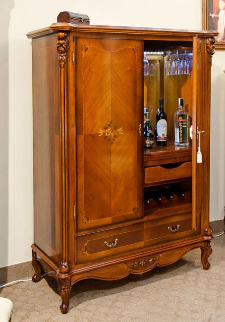 Наполнение: полки и выдвижные ящики для хранения барных аксессуаров, и держатели для бокалов и бутылок.