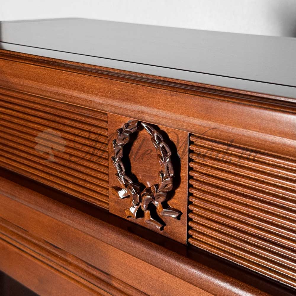 Изделие выполнено из массива дерева и декорировано акцентной фрезеровкой и фирменной эмблемой.
