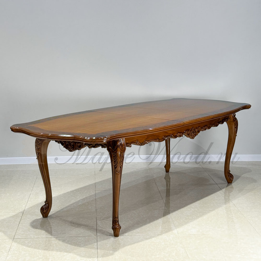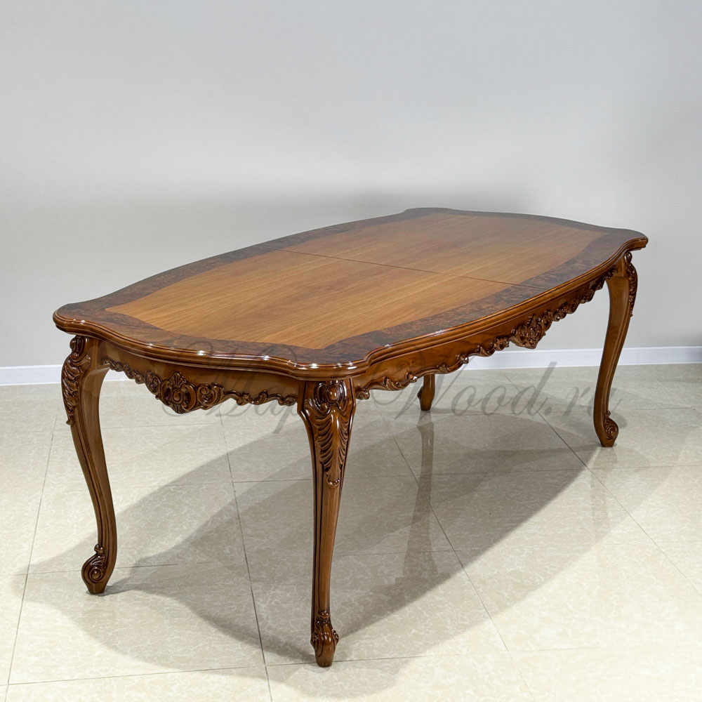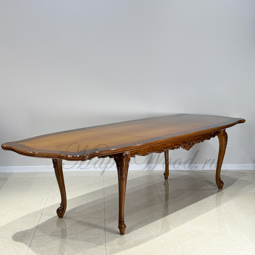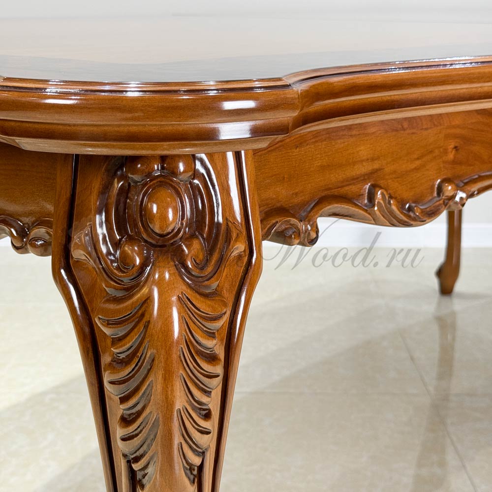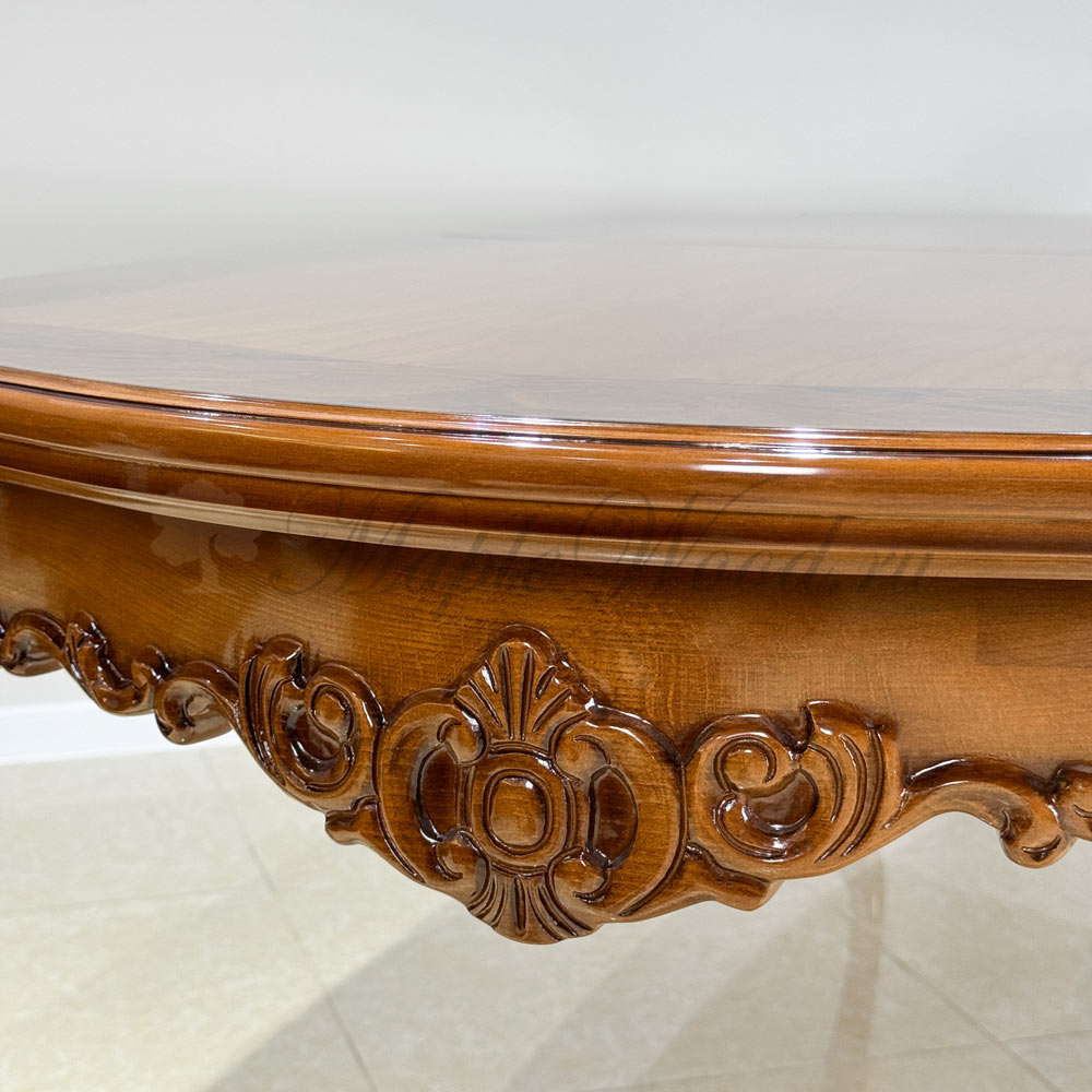 Стол выполнен из массива дерева и декорирован эффектной резьбой, которая подчеркивает роскошный внешний вид изделия.