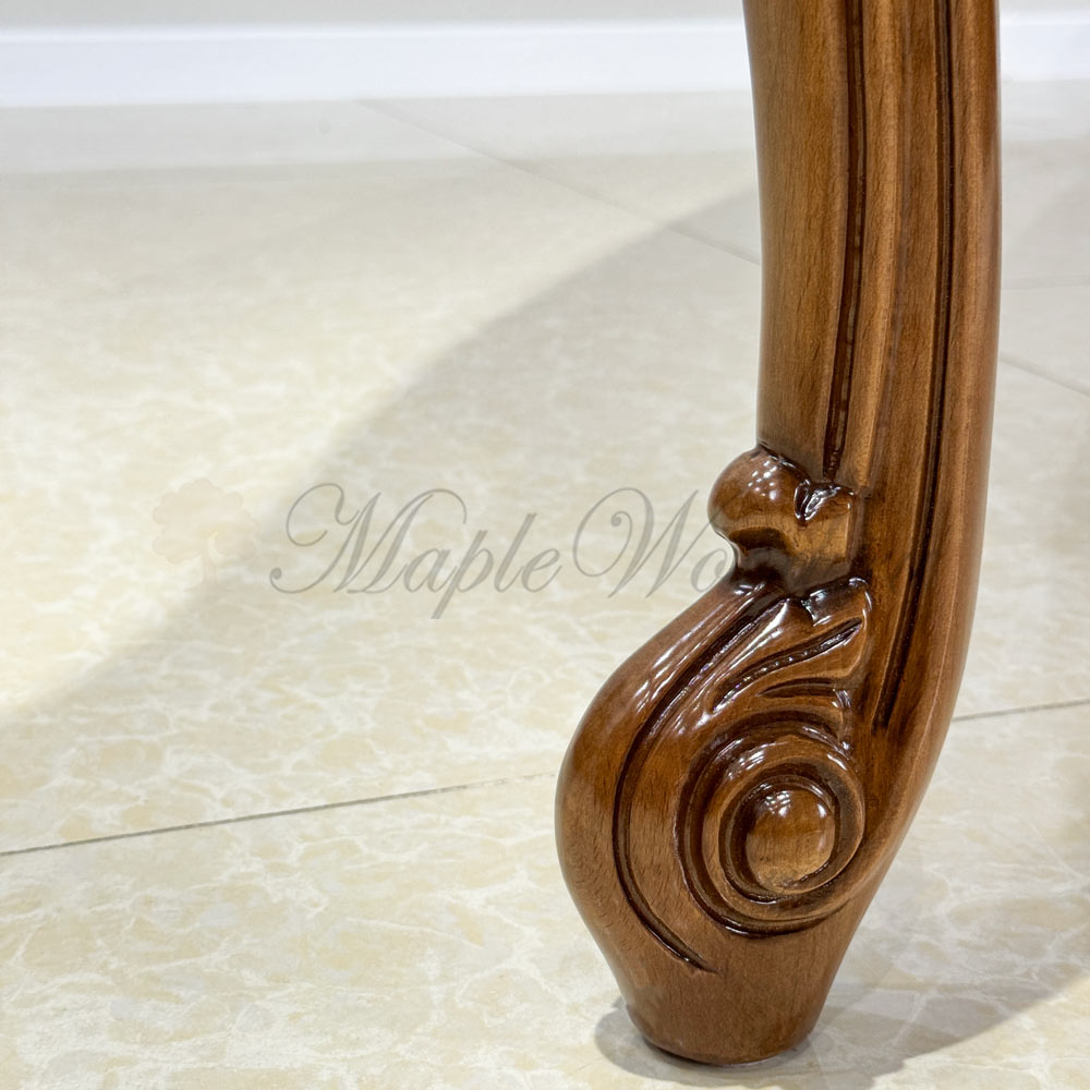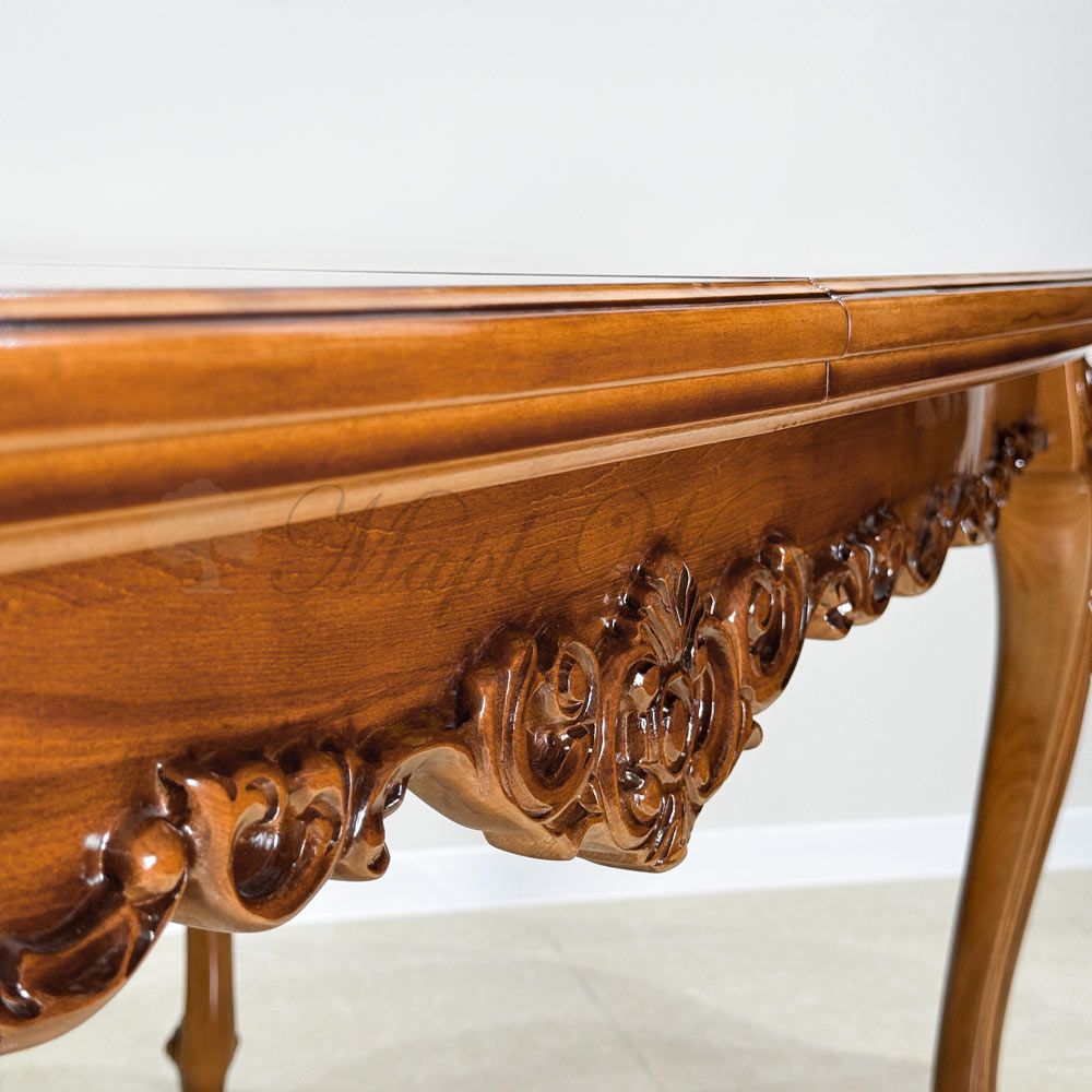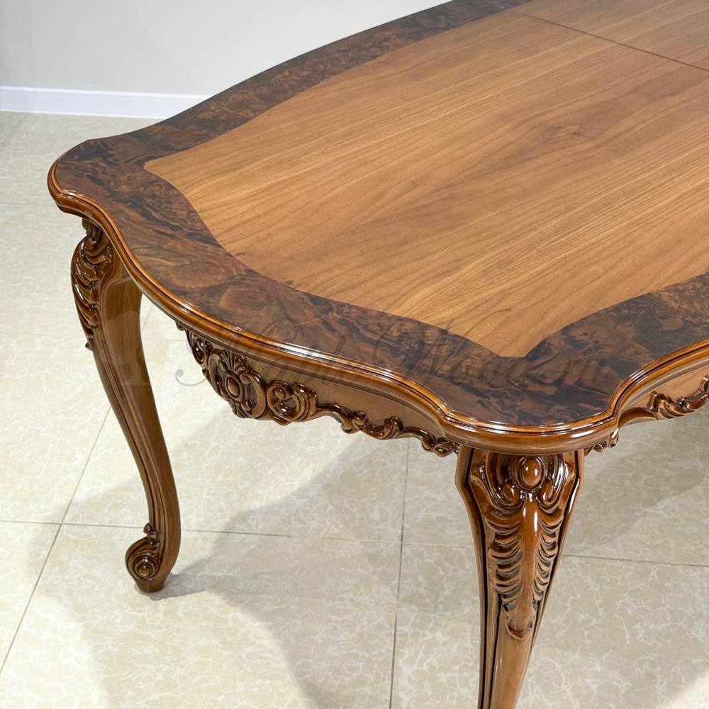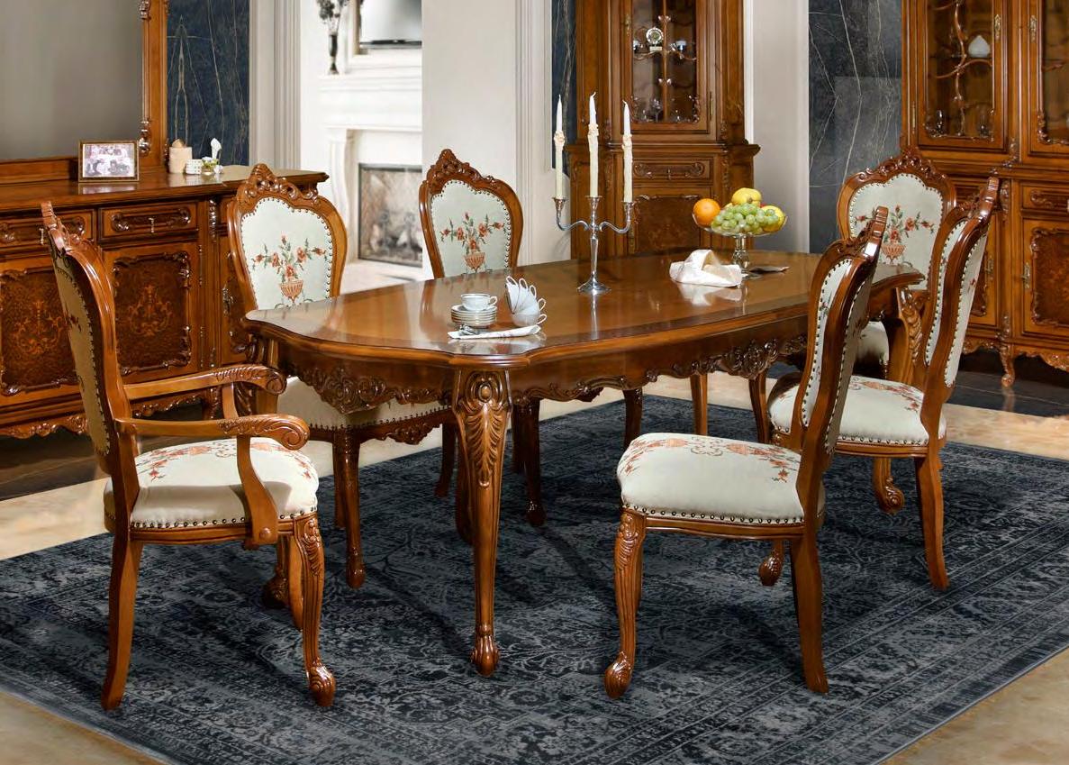 Стол выполнен из массива дерева и декорирован эффектной резьбой, которая подчеркивает роскошный внешний вид изделия.