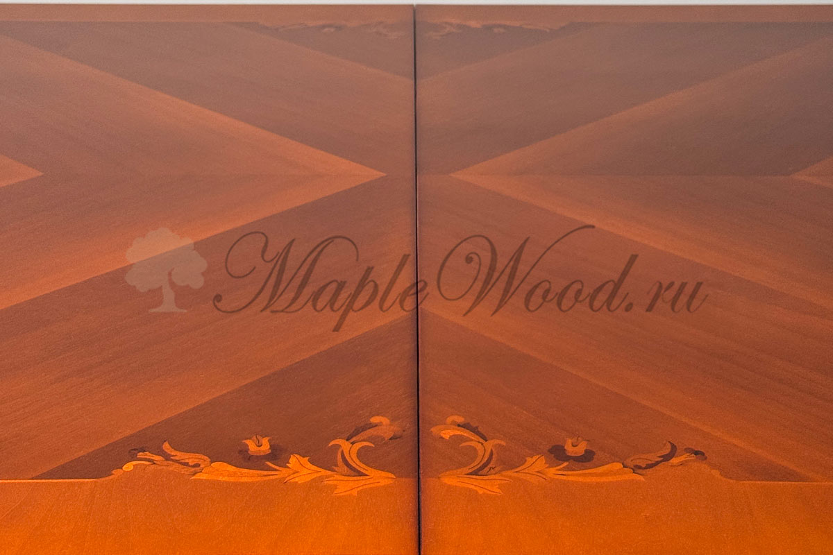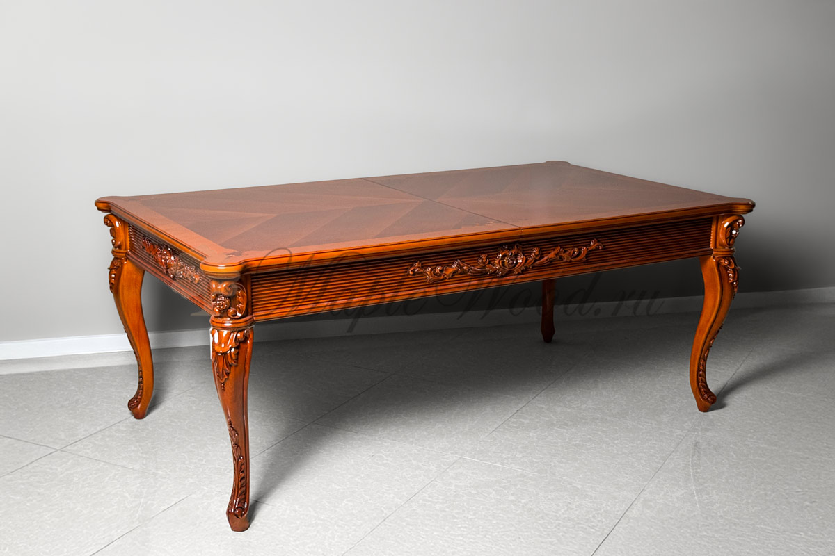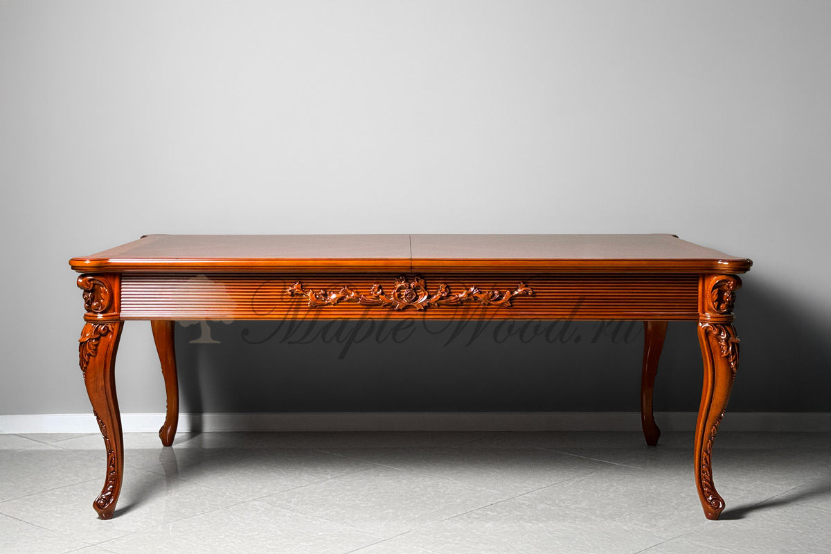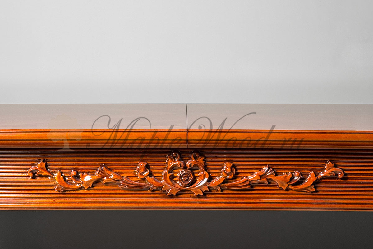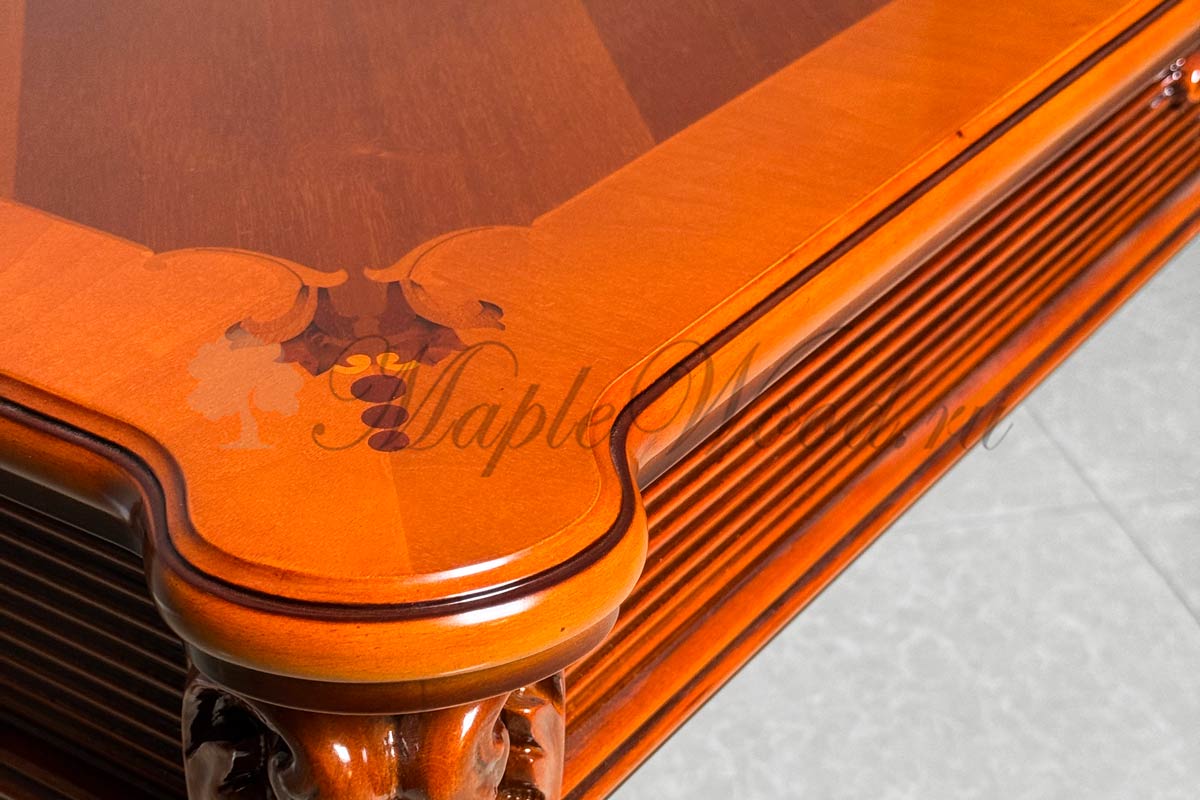 Стол выполнен из массива дерева ореха и бука и декорирован эффектной резьбой и инкрустацией из шпона.