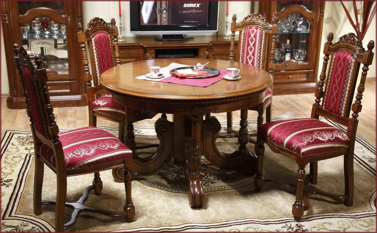Круглый стол для гостиной и столовой из коллекции Кристина от фабрики Simex создан в лучших традициях классического стиля, сочетая натуральный массив дерева и богатую отделку ручной работы, которая демонстрирует роскошь изделия в каждой детали.