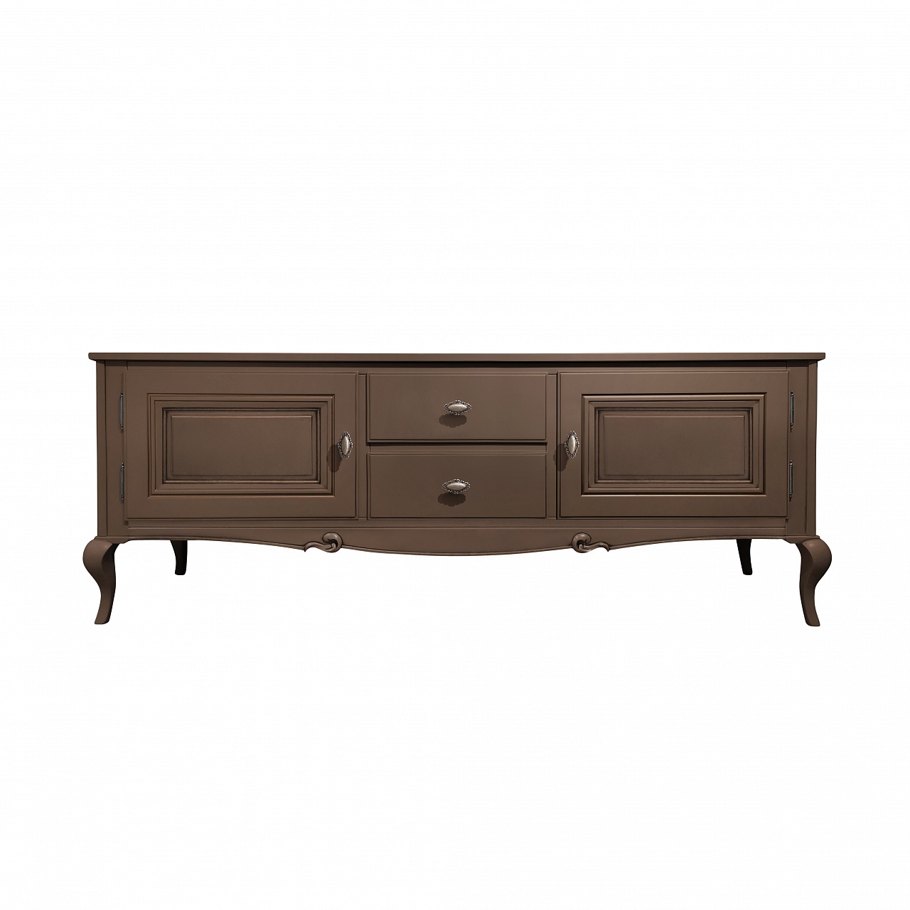 Тумба под ТВ на фигурных ножках кабриоль из коллекции Портофино от фабрики Тимбер выполнена из крашенного МДФ с гладкой фактурой и матовым типом покрытия, которое отличается практичностью и простотой в уходе.