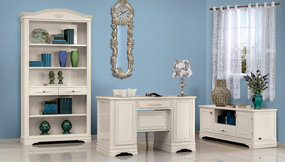 Кабинет из коллекции Артемида от фабрики Monte Cristo Mobili состоит из 4-х предметов и включает: книжный шкаф, тумбу под ТВ и письменный стол