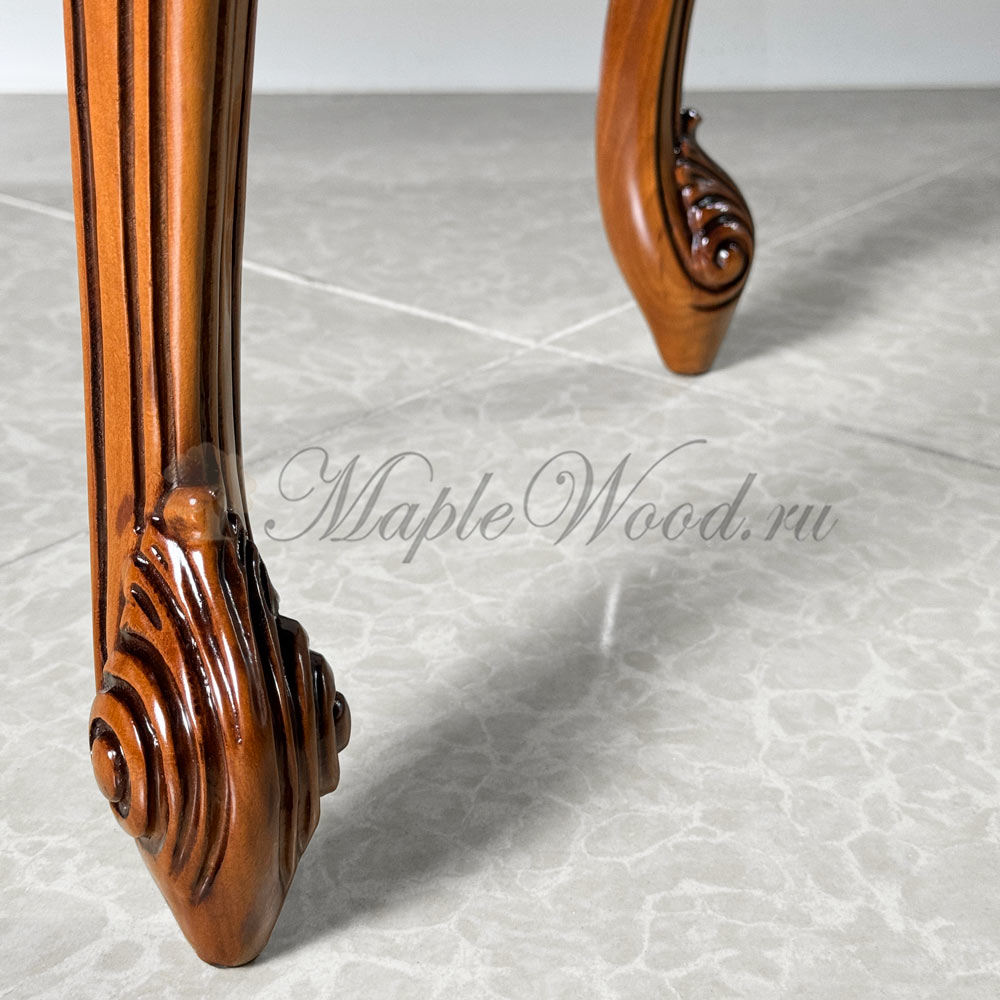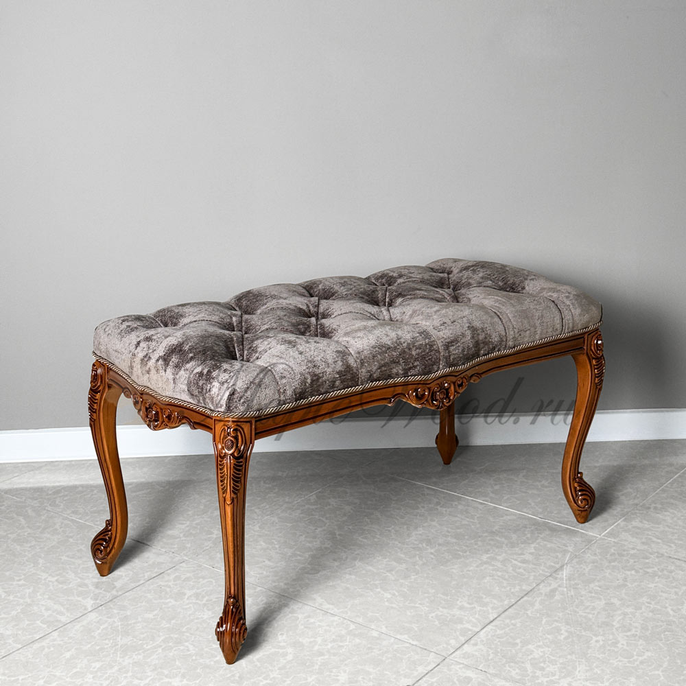 Резной каркас изделия выполнен из массива дерева, а в качестве обивочного материала использована мягкая ткань в коричневом оттенке.