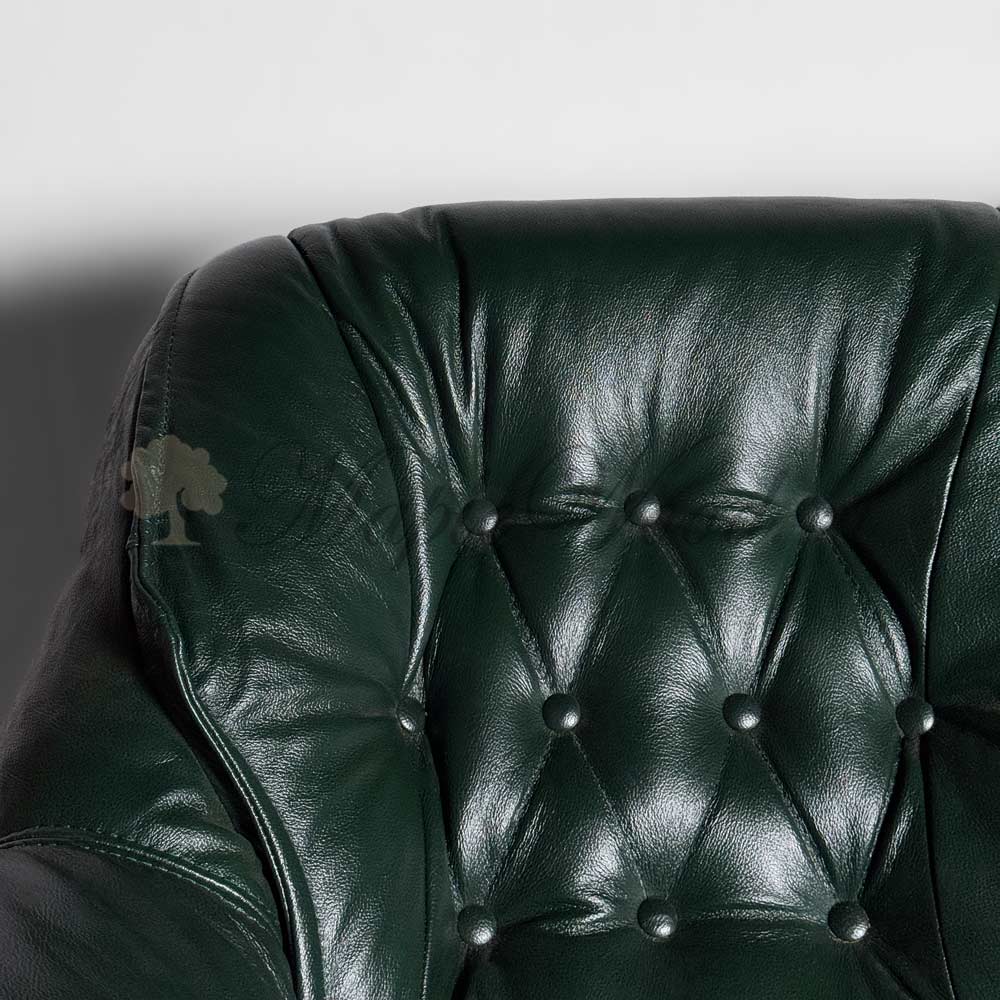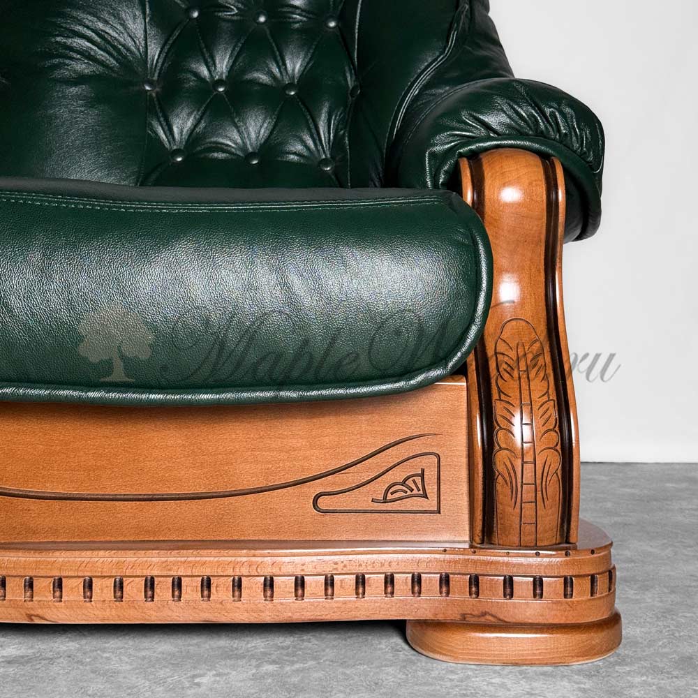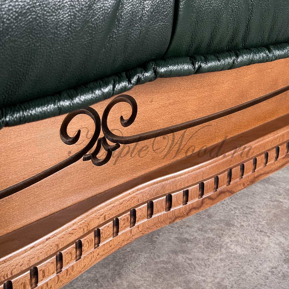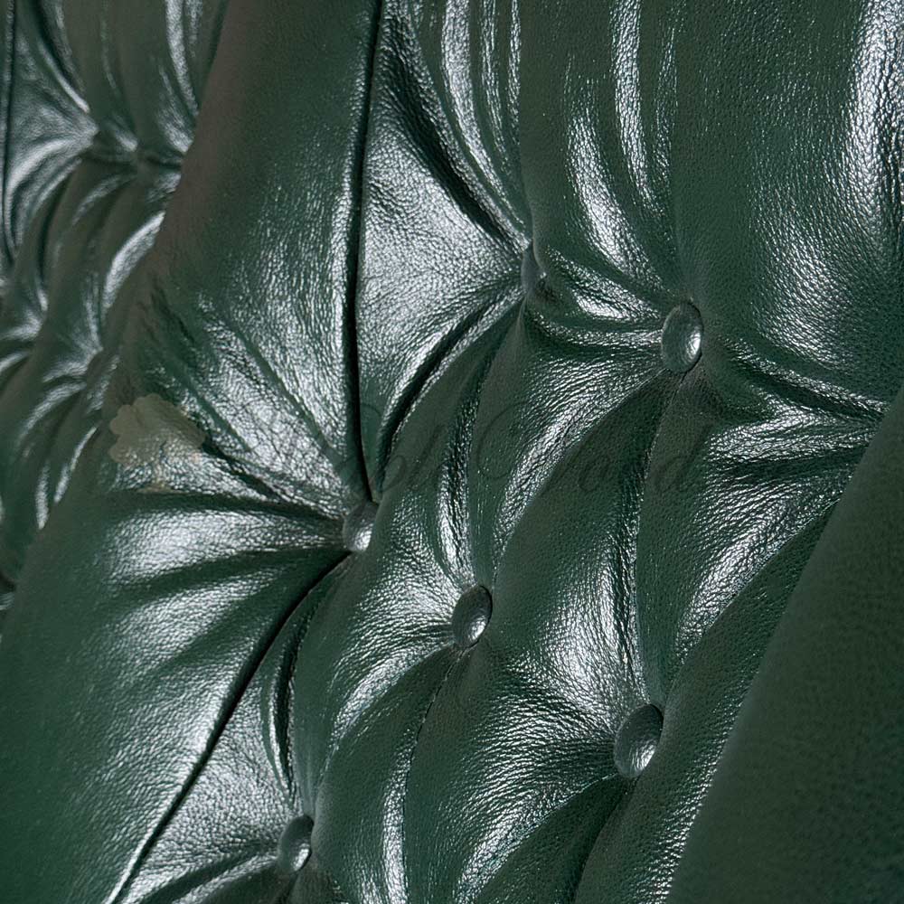 Каркас дивана выполнен из массива дерева, а в качестве обивочного материала использована натуральная кожа в зелёном оттенке.