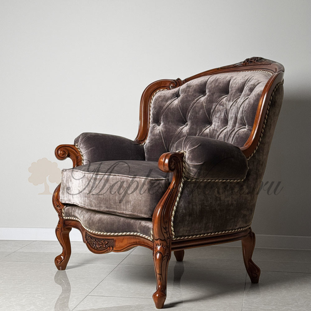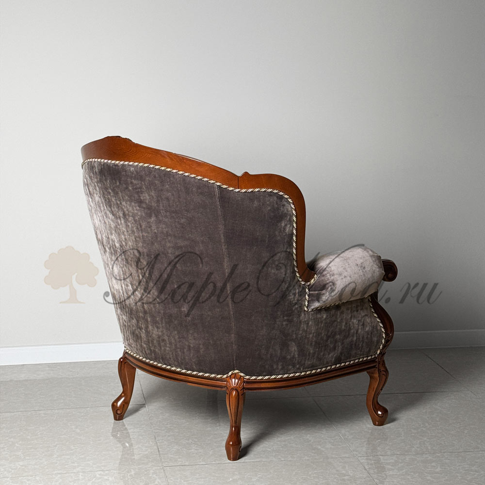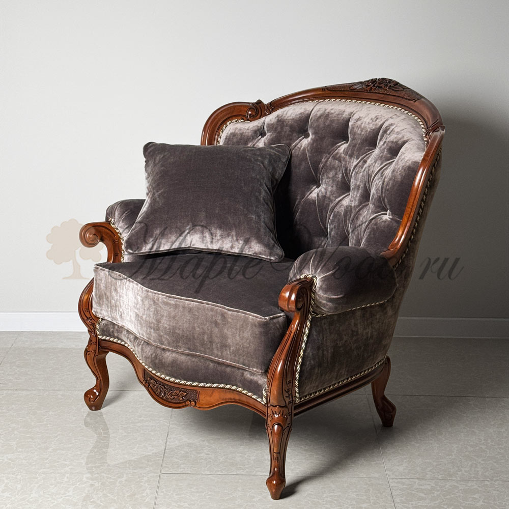 Кресло для гостиной из коллекции Ландерно выполнено на прочном каркасе из массива дерева и обито мягким велюром, что придает ему не только стильный внешний вид, но и комфорт.