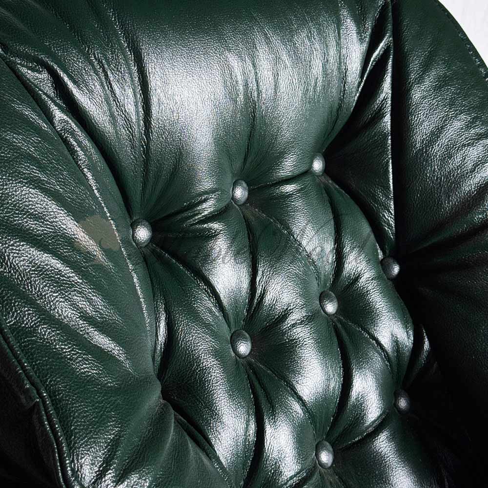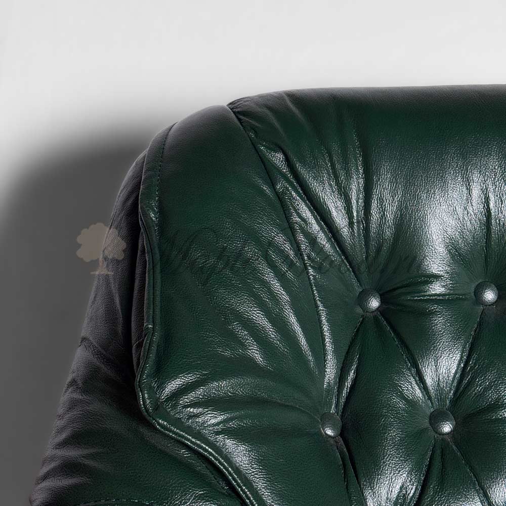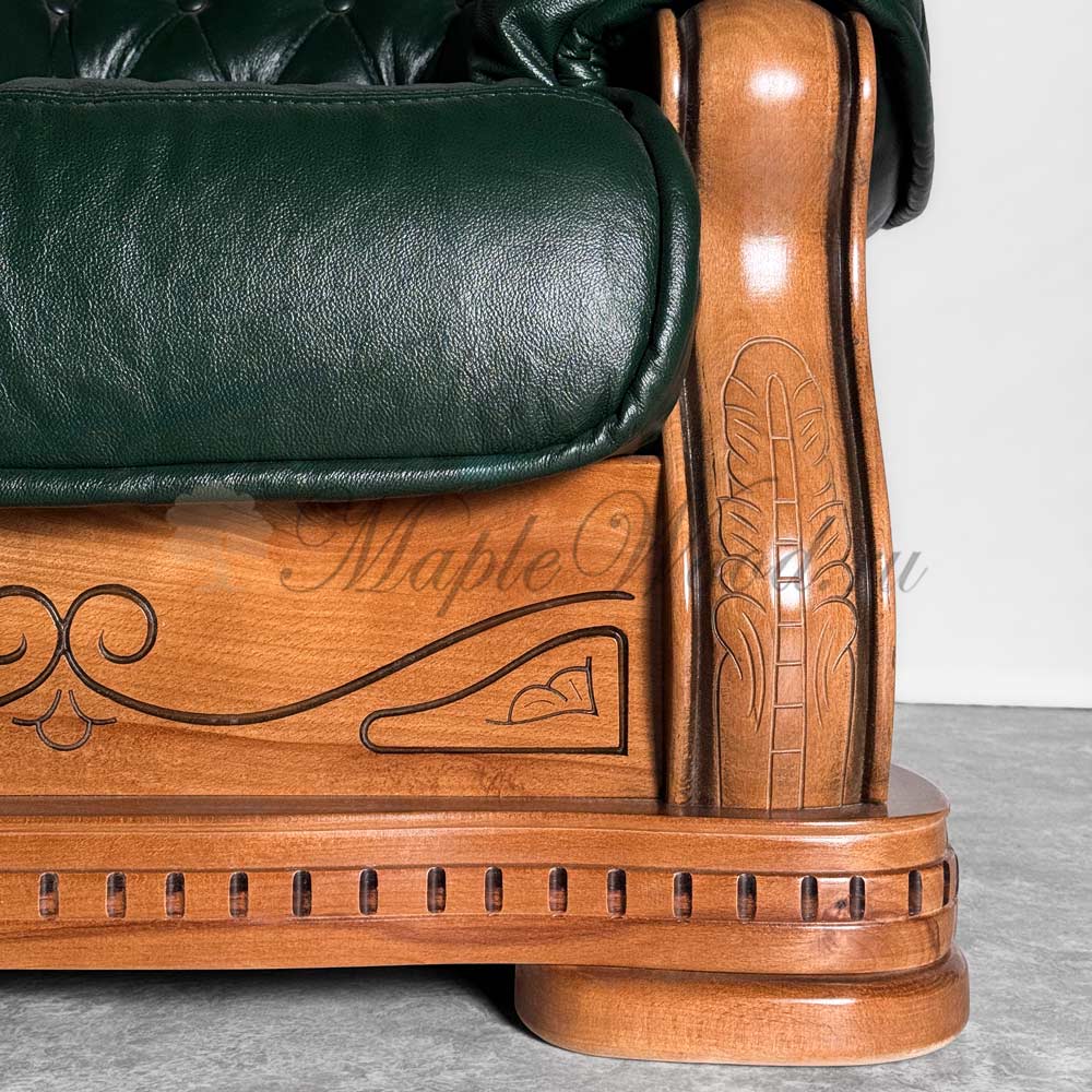 Каркас изделия выполнен из массива дерева, а в качестве обивочного материала использована натуральная кожа в «зелёном» оттенке.
