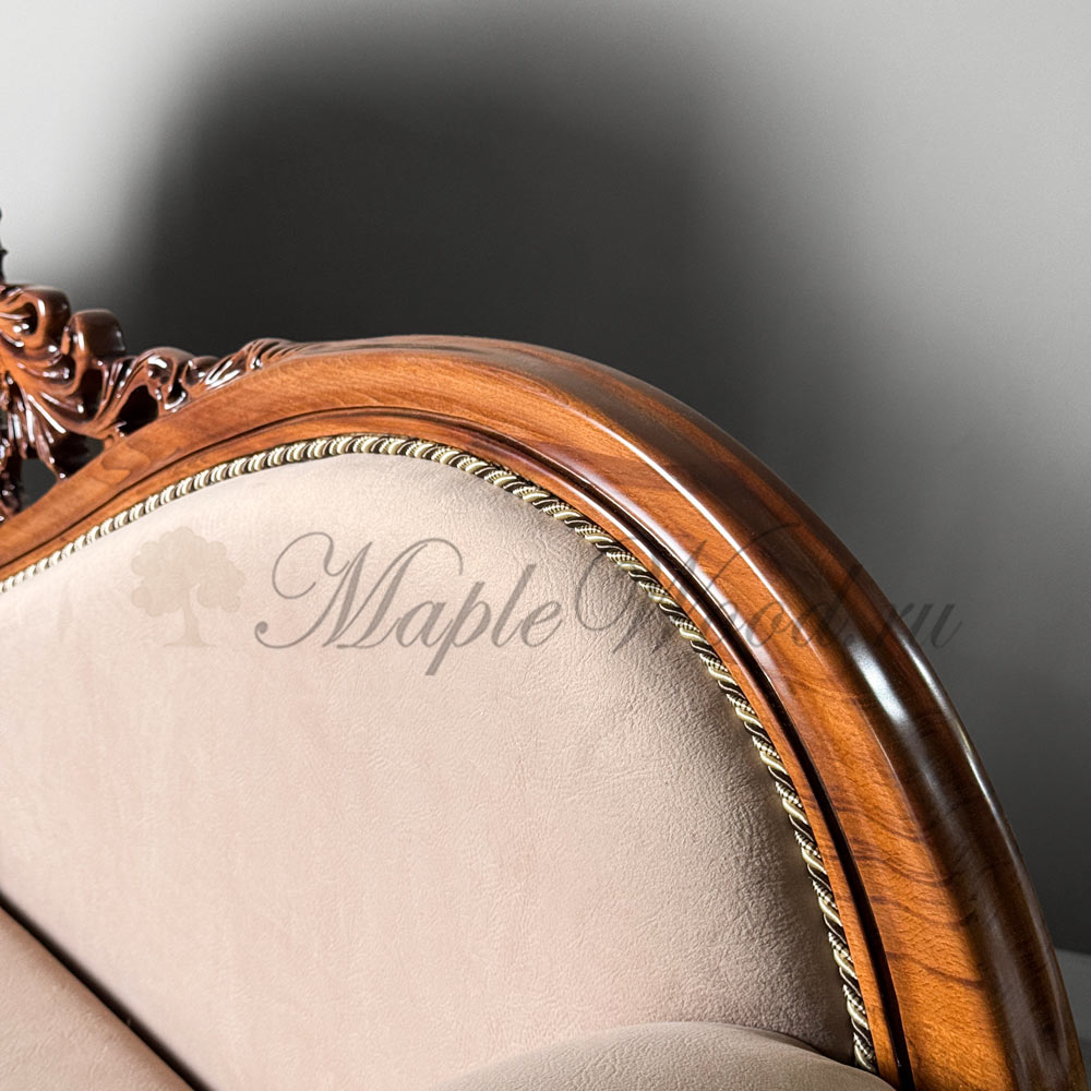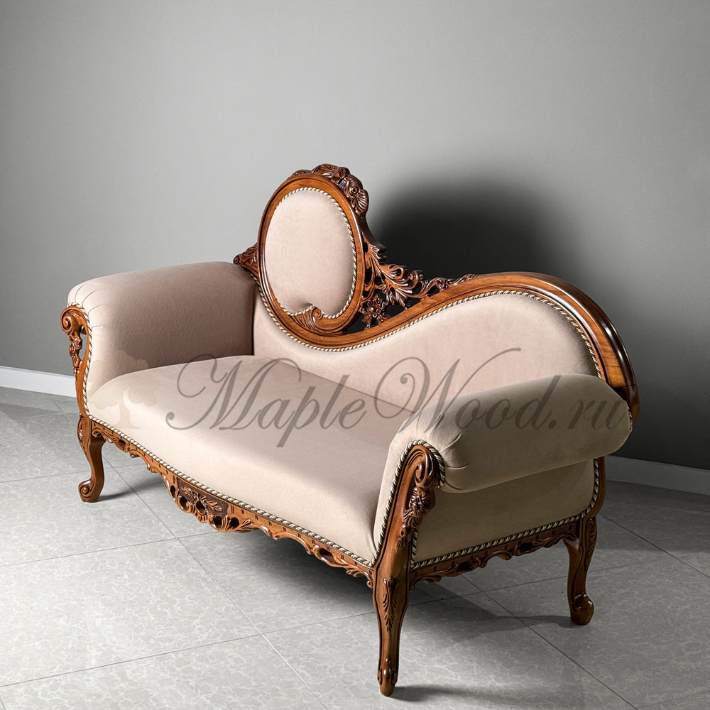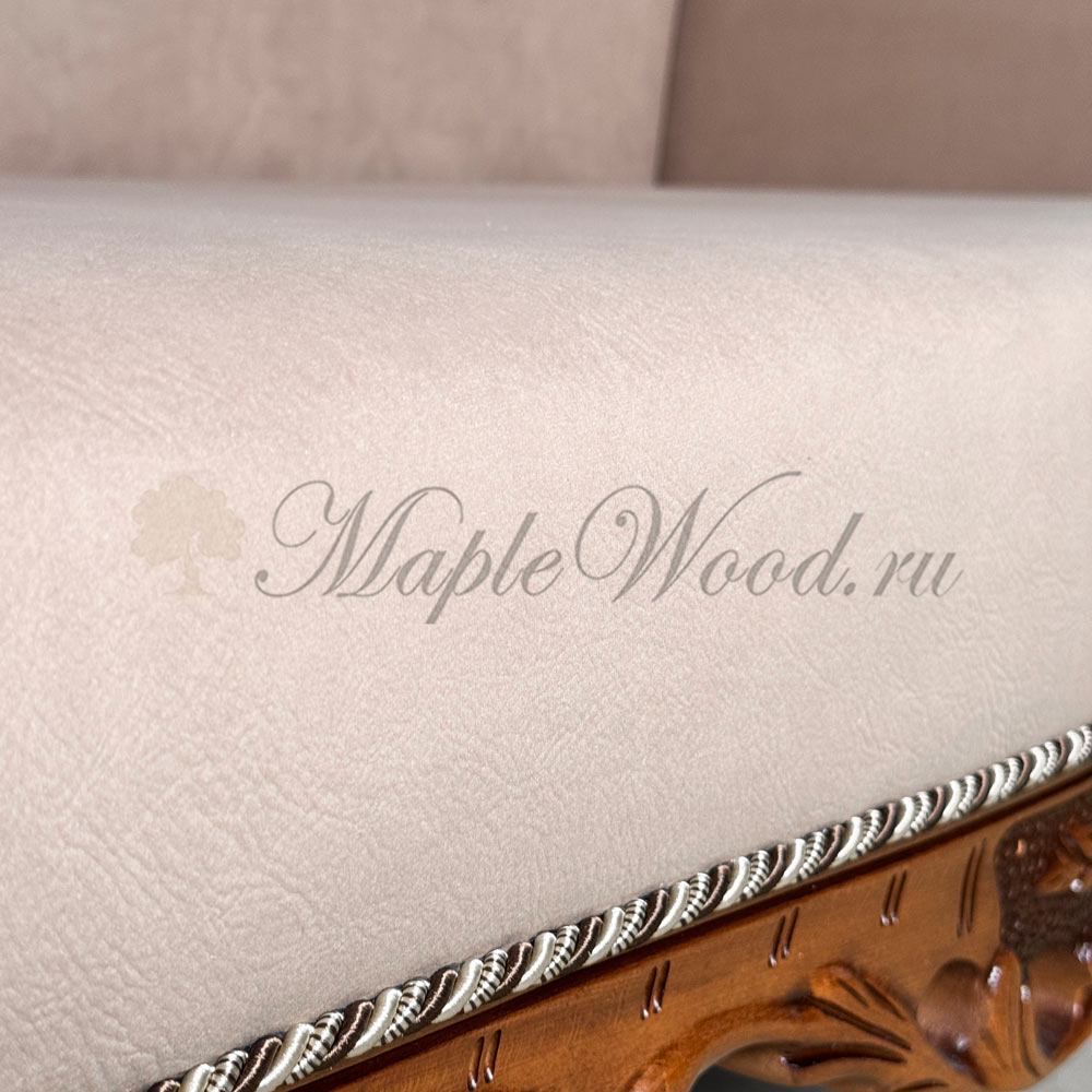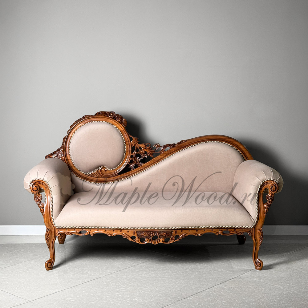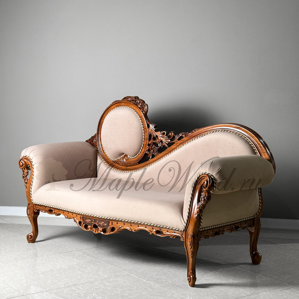 Кушетка из коллекции «Флер» от фабрики Prokess имеет тактильно приятную и эстетически привлекательную обивочную ткань из нубука в бежевом оттенке и каркас из массива дерева, украшенный эффектными резными элементами, которые подчеркивают мастерство и внимание к деталям.