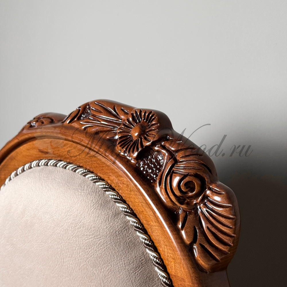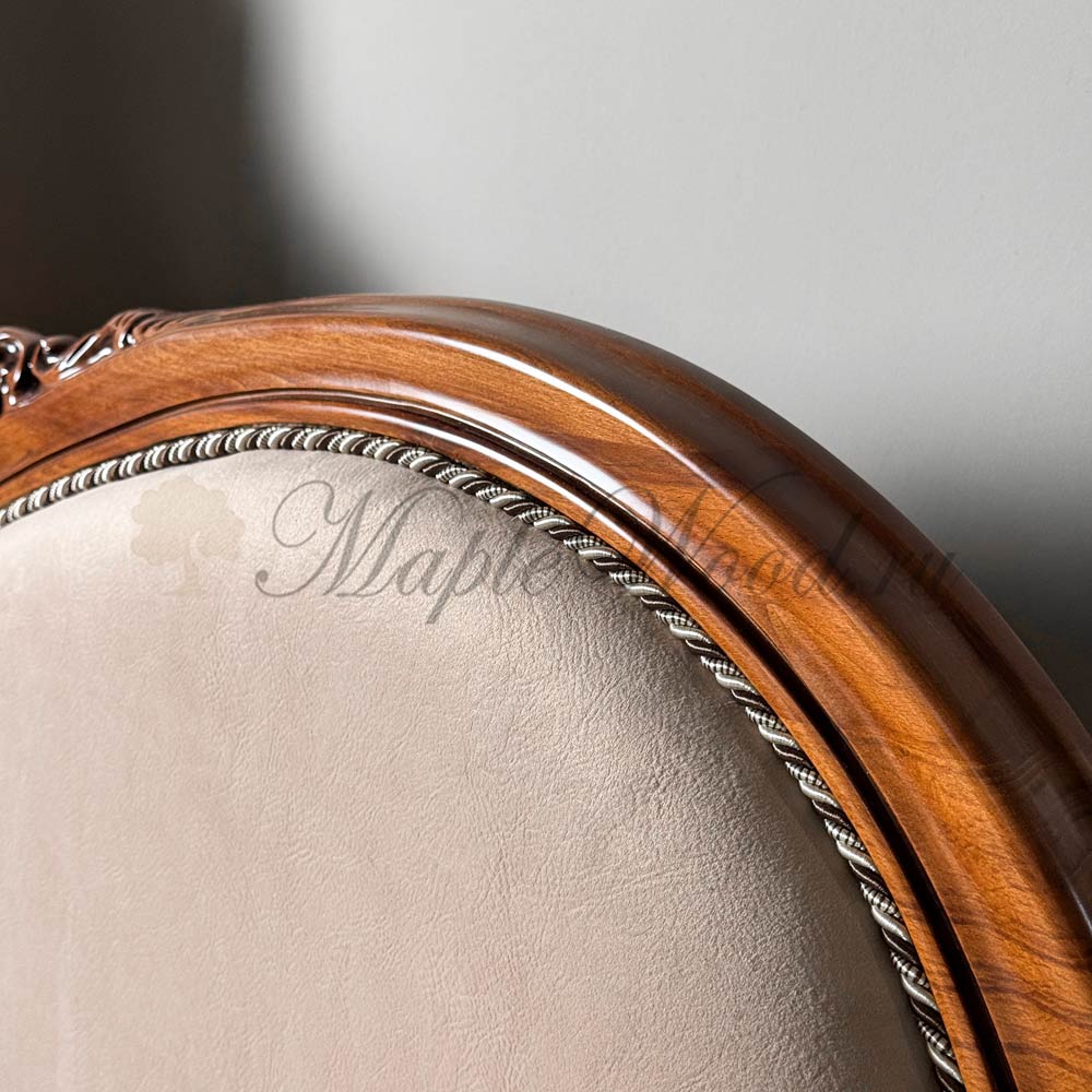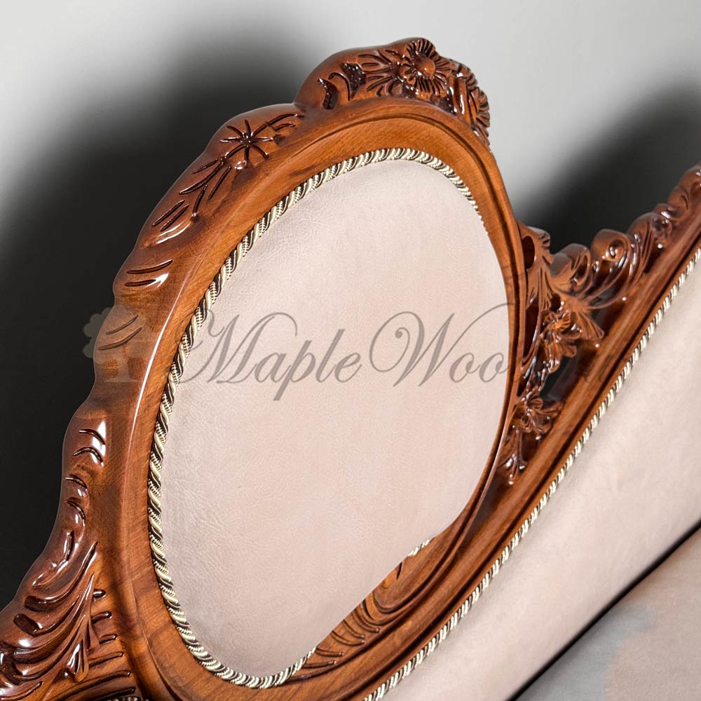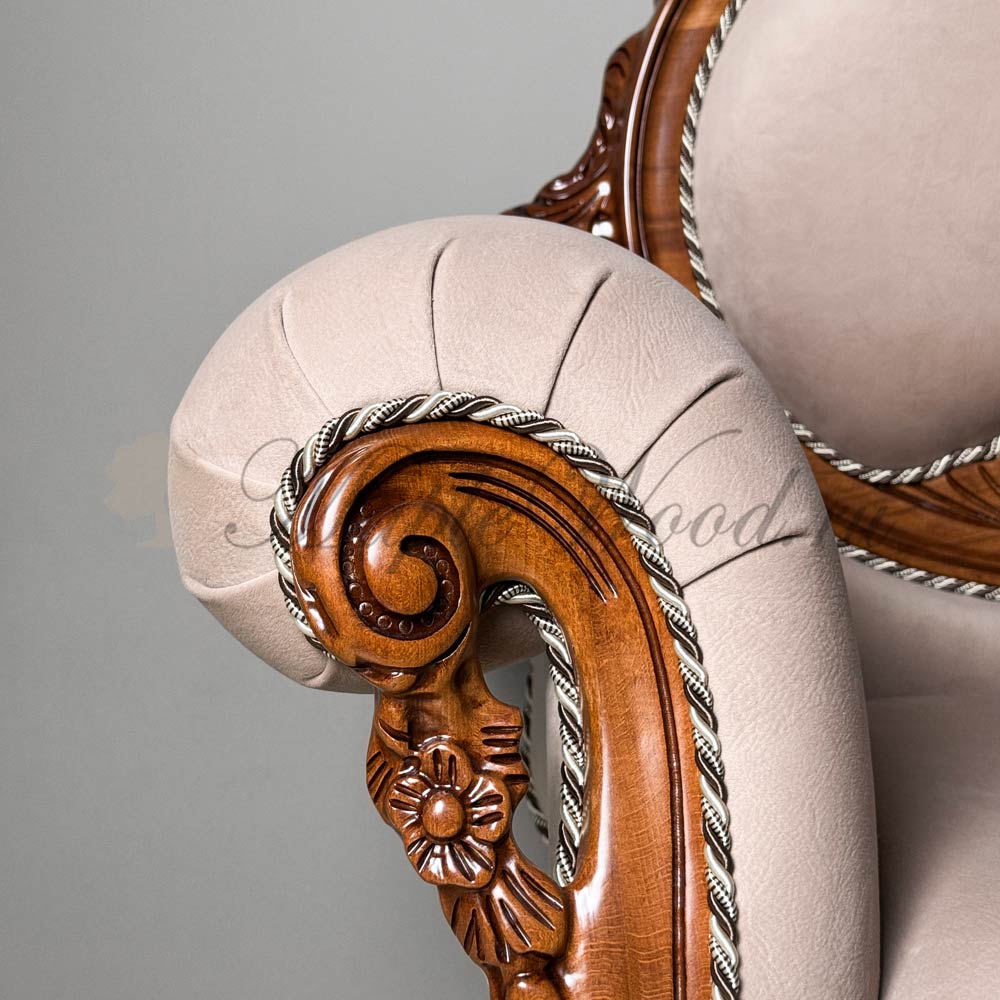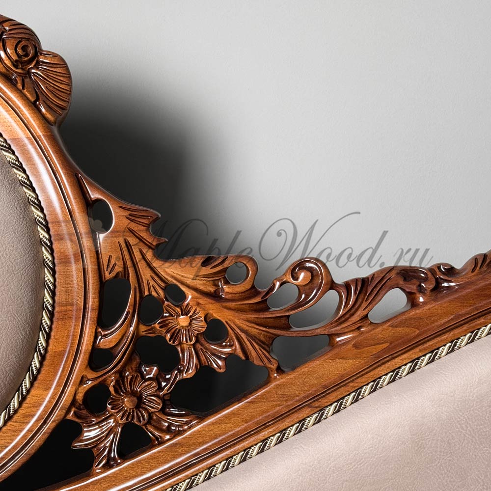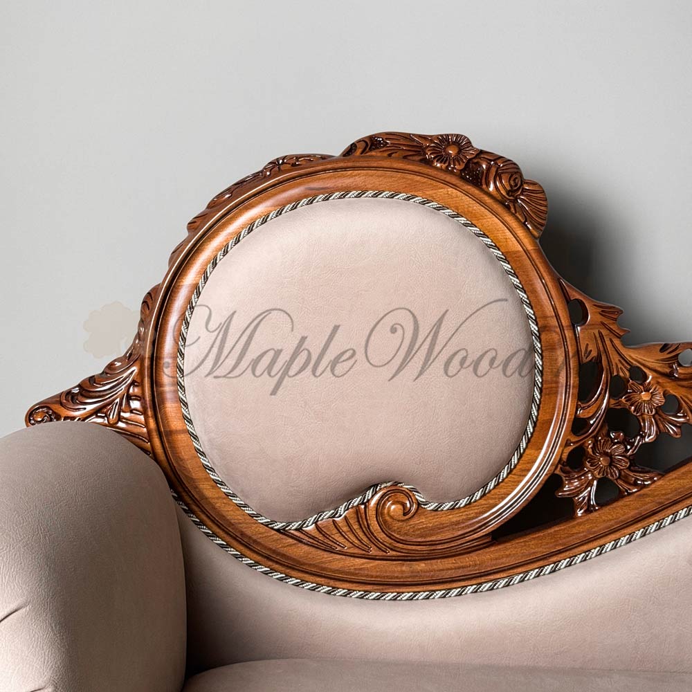 Кушетка из коллекции «Флер» от фабрики Prokess имеет тактильно приятную и эстетически привлекательную обивочную ткань из нубука в бежевом оттенке и каркас из массива дерева, украшенный эффектными резными элементами, которые подчеркивают мастерство и внимание к деталям.