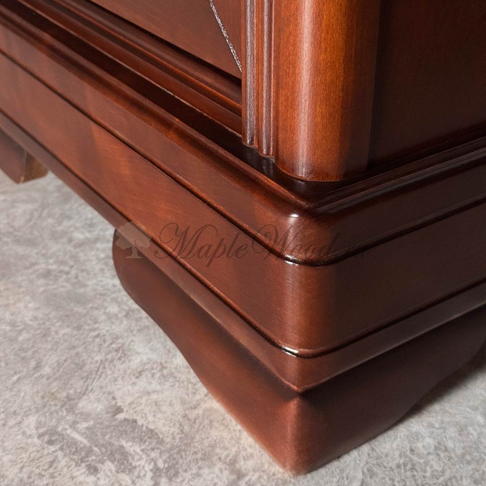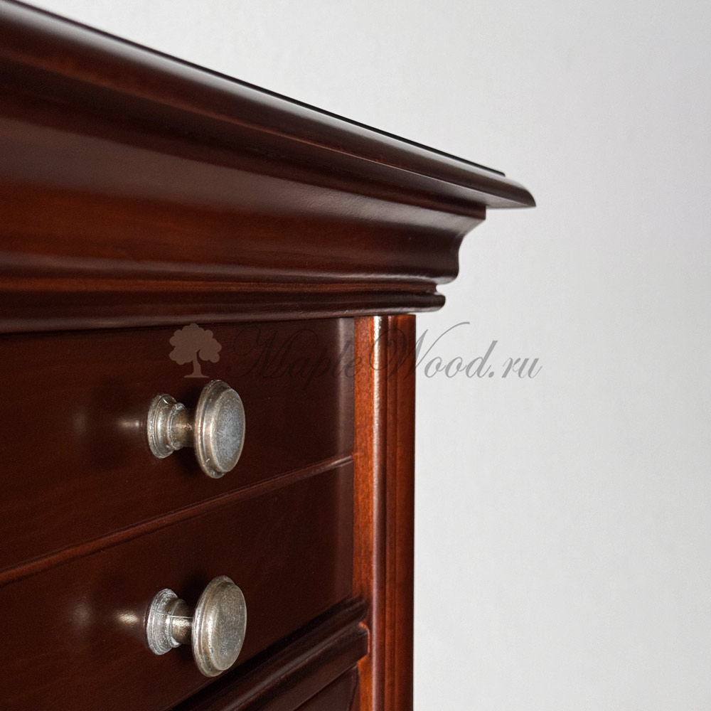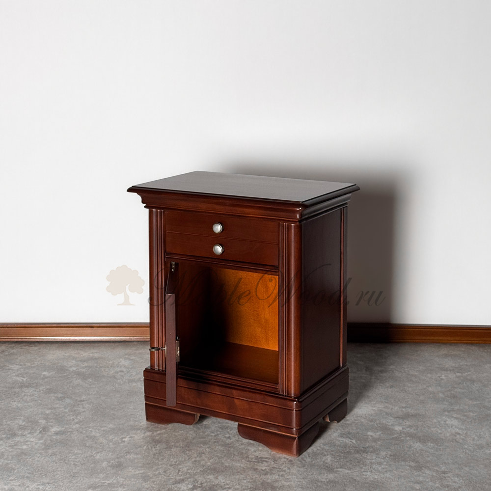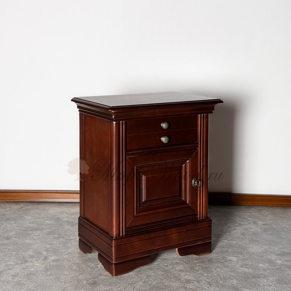 Прикроватная тумба из коллекции Жасмин от фабрики Mobex изготовлена из массива дерева в оттенке «тёмный орех» и отличается лаконичным дизайном без лишних декоративных элементов.