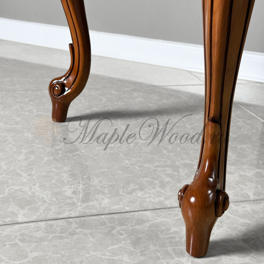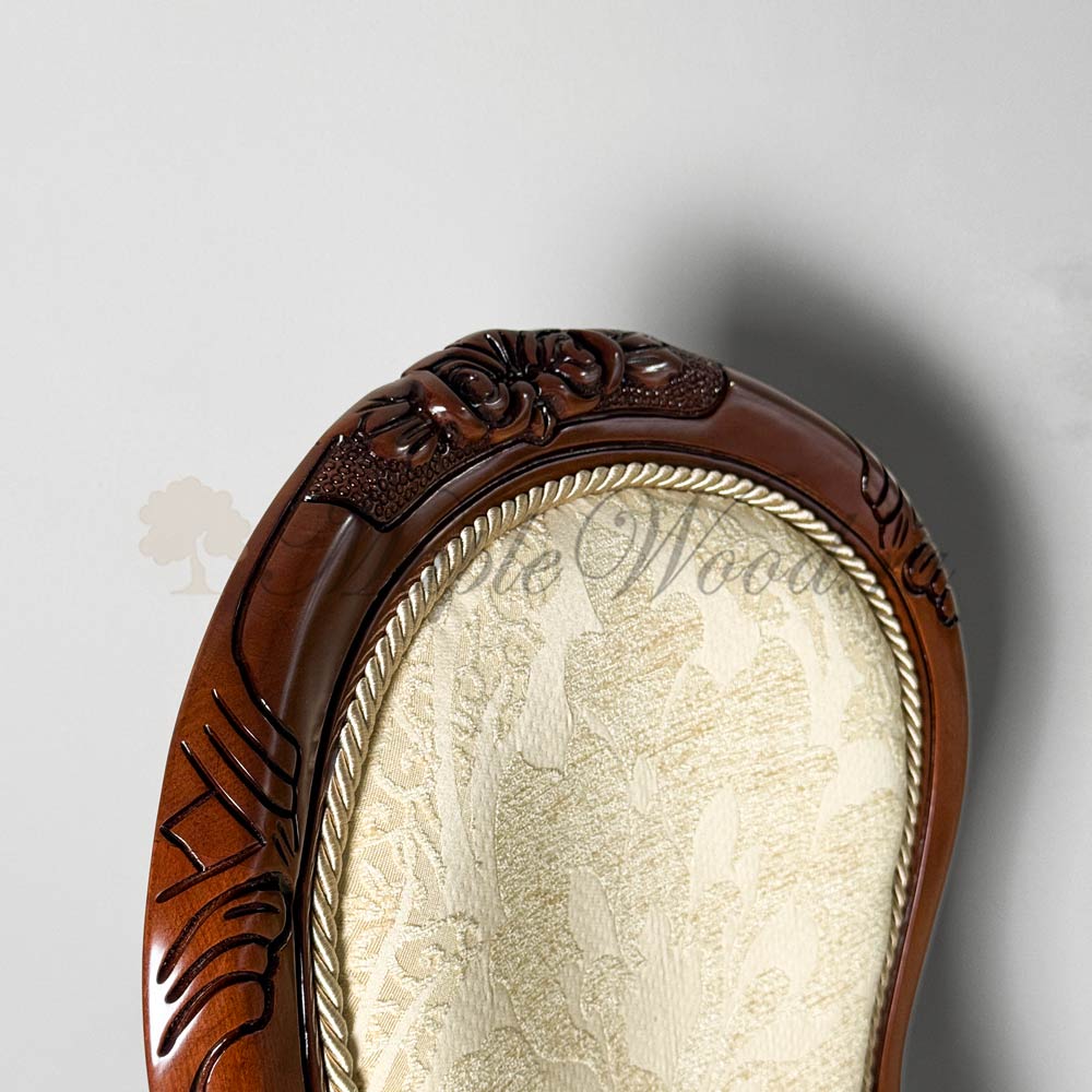 Каркас изделия выполнен из натурального массива дерева и украшен искусной резьбой, в качестве обивочного материала использована ткань.