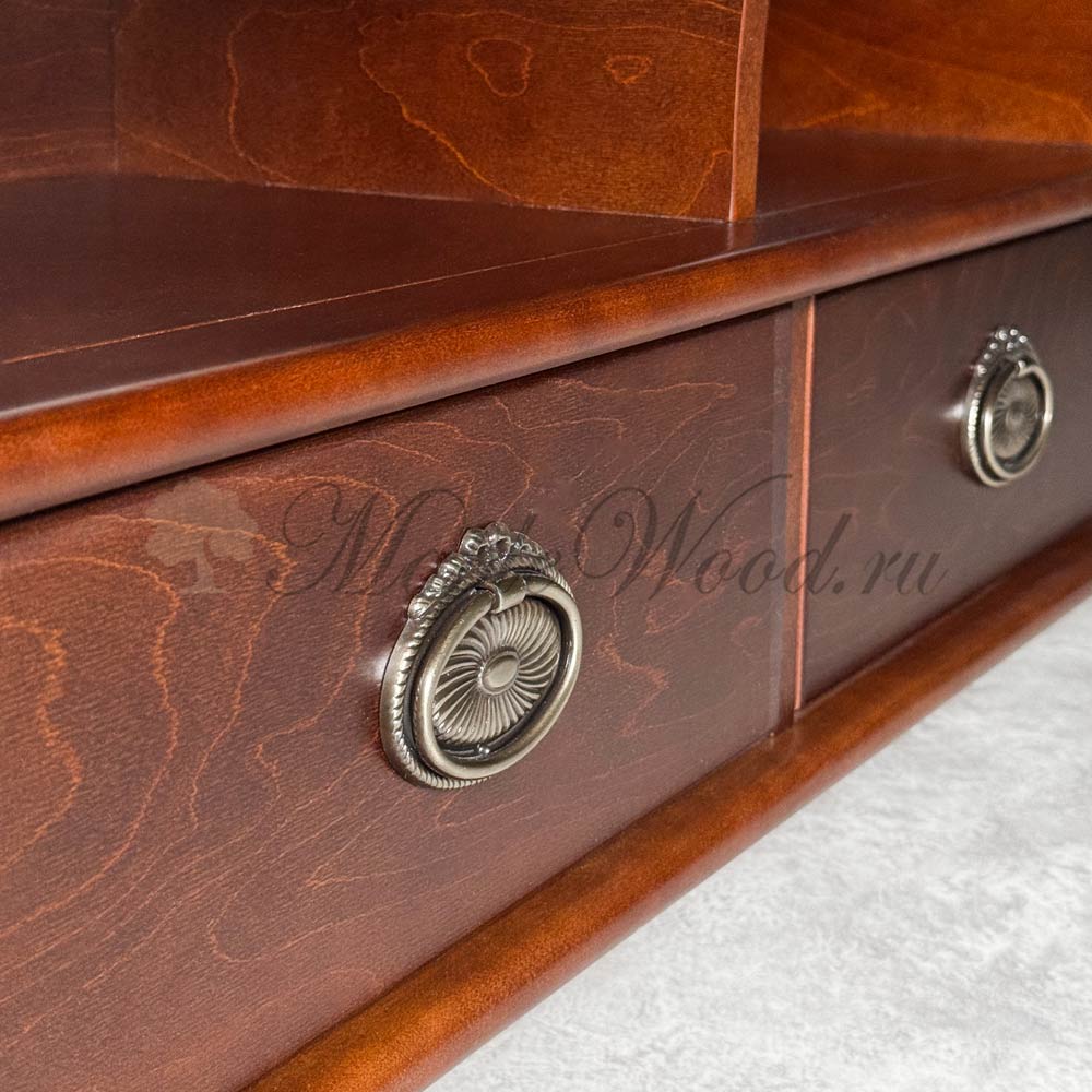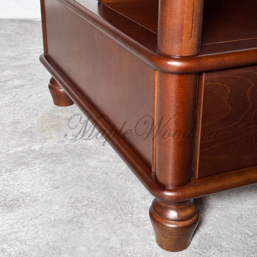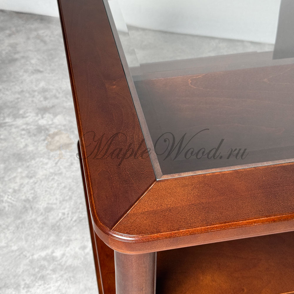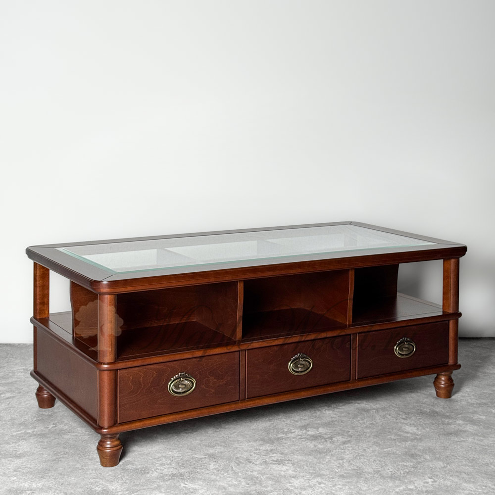Журнальный стол для гостиной, выполненный из массива карельской березы в оттенке «орех»и произведённый в Беларуси, является репликой известной коллекции Мария Сильва от румынского производителя Monte Cristo Mobili.