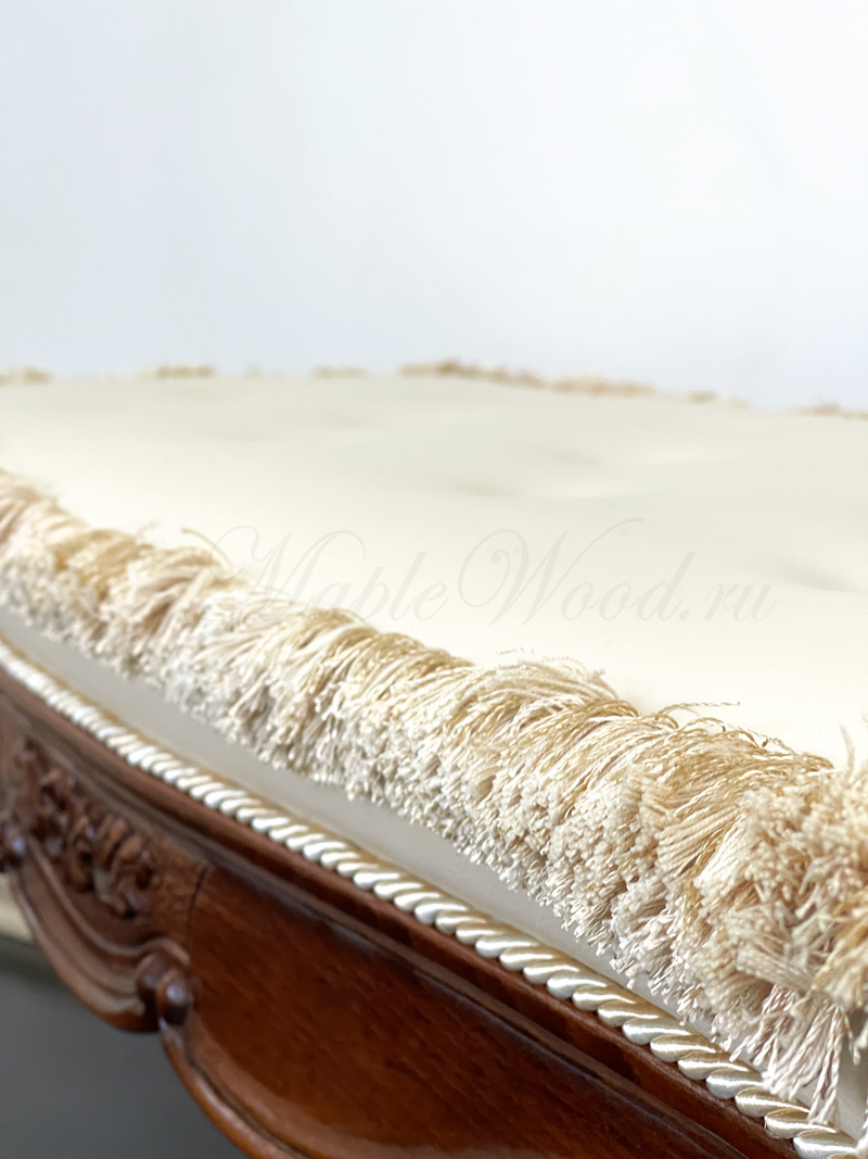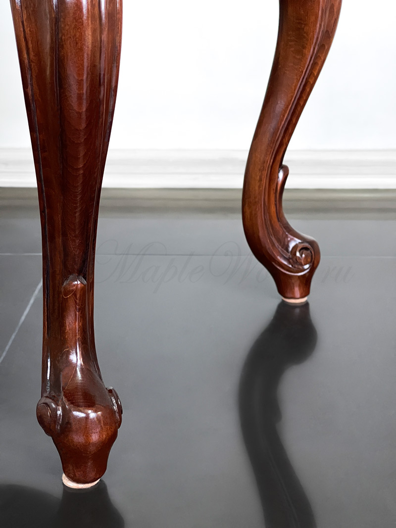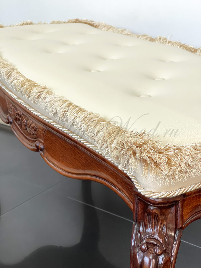 Каркас изделия выполнен из натурального дерева и декорирован эффектной резьбой, а в качестве обивочного материала использована натуральная кожа.