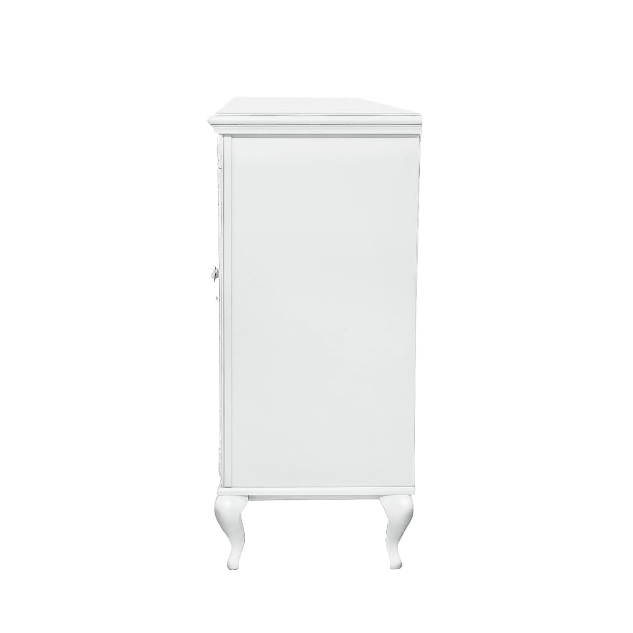 Комод выполнен из шпонированного МДФ с элементами из массива дерева и декорирован серебряной патиной, которая подчеркивает акцентные детали изделия.