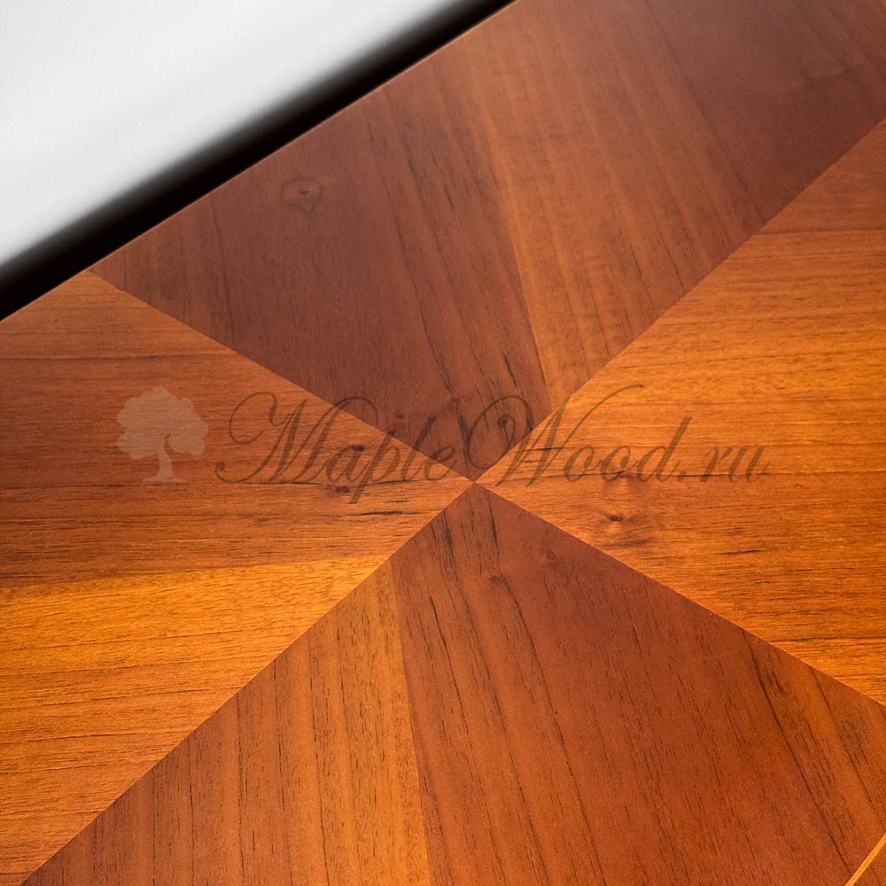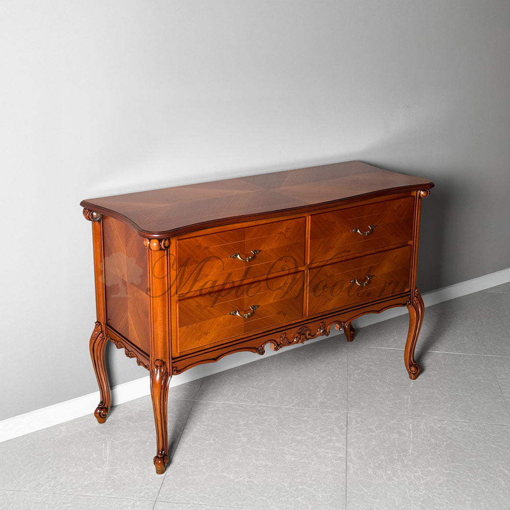 Комод выполнен из массива дерева в оттенке «орех» и оборудован четырьмя вместительными ящиками.