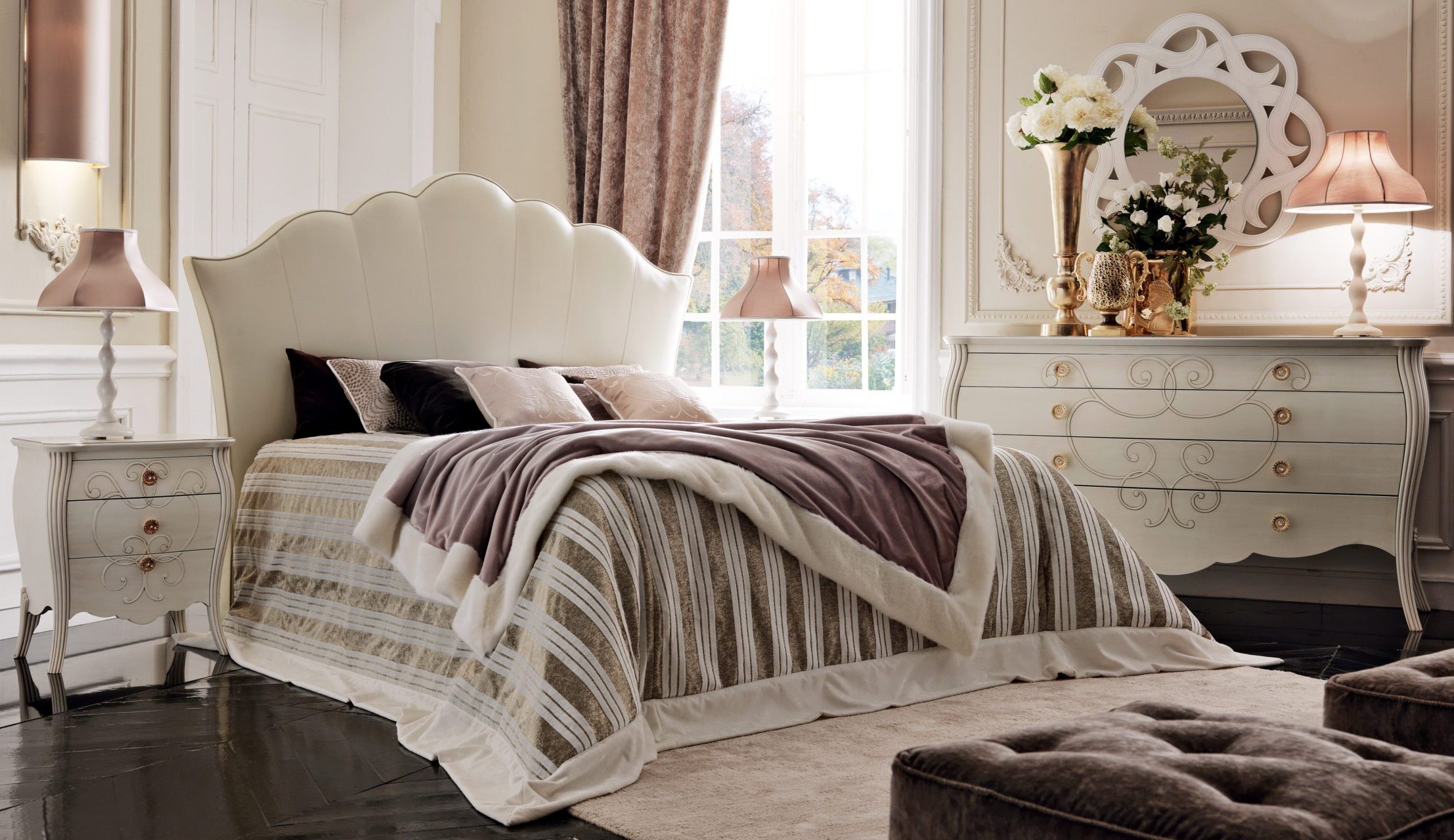 Двуспальная кровать из коллекции Франческо имеет фигурные ножки с лаконичным резным декором и эффектное фигурное изголовье.