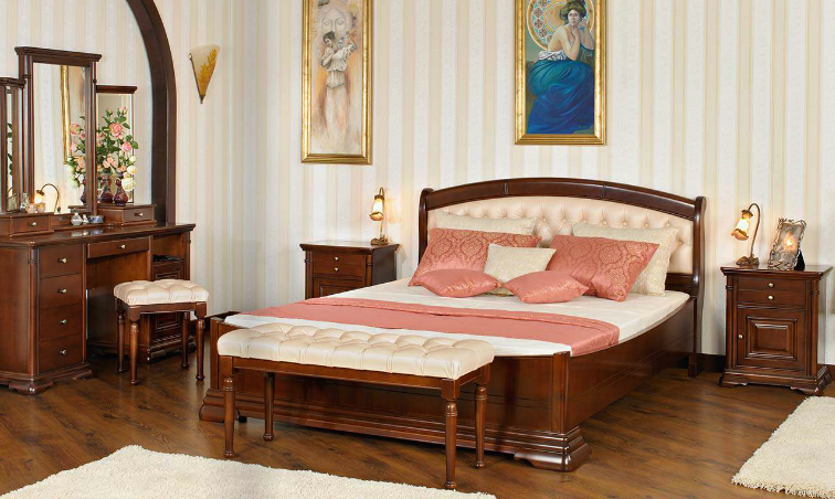 Двуспальная кровать с кожаным изголовьем из коллекции Элеганс от фабрики Mobex выполнена из массива бука в тёмной отделке орех, сочетая в себе элегантную форму и строгий стиль классики.
