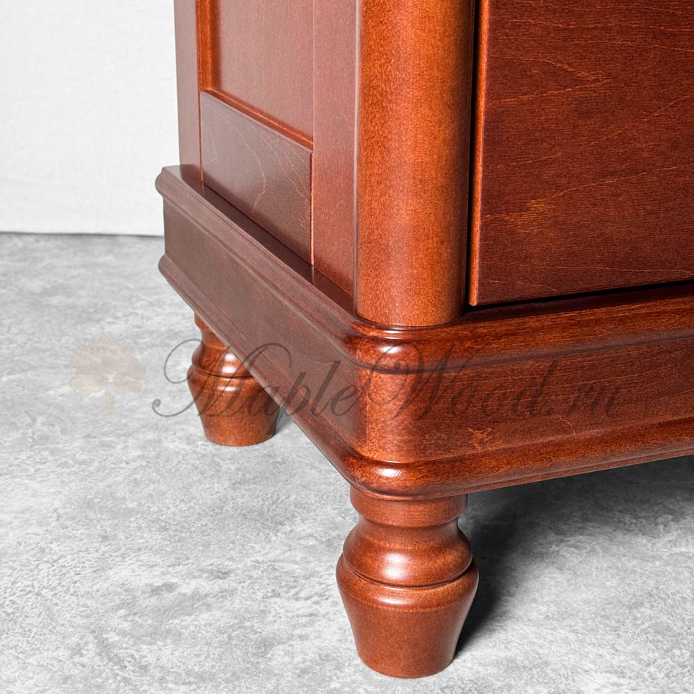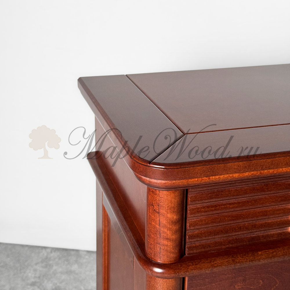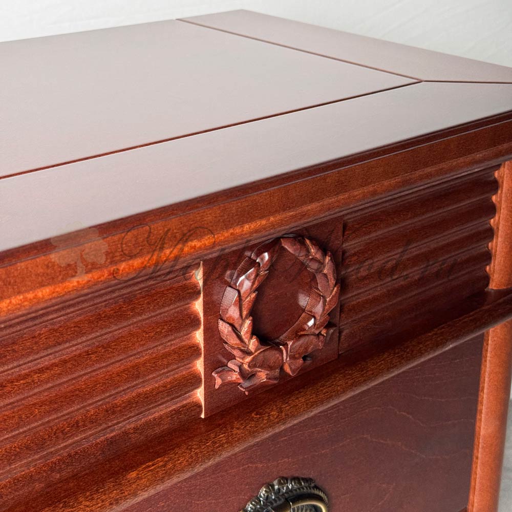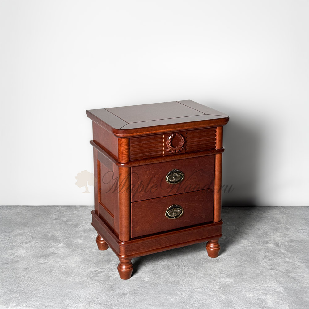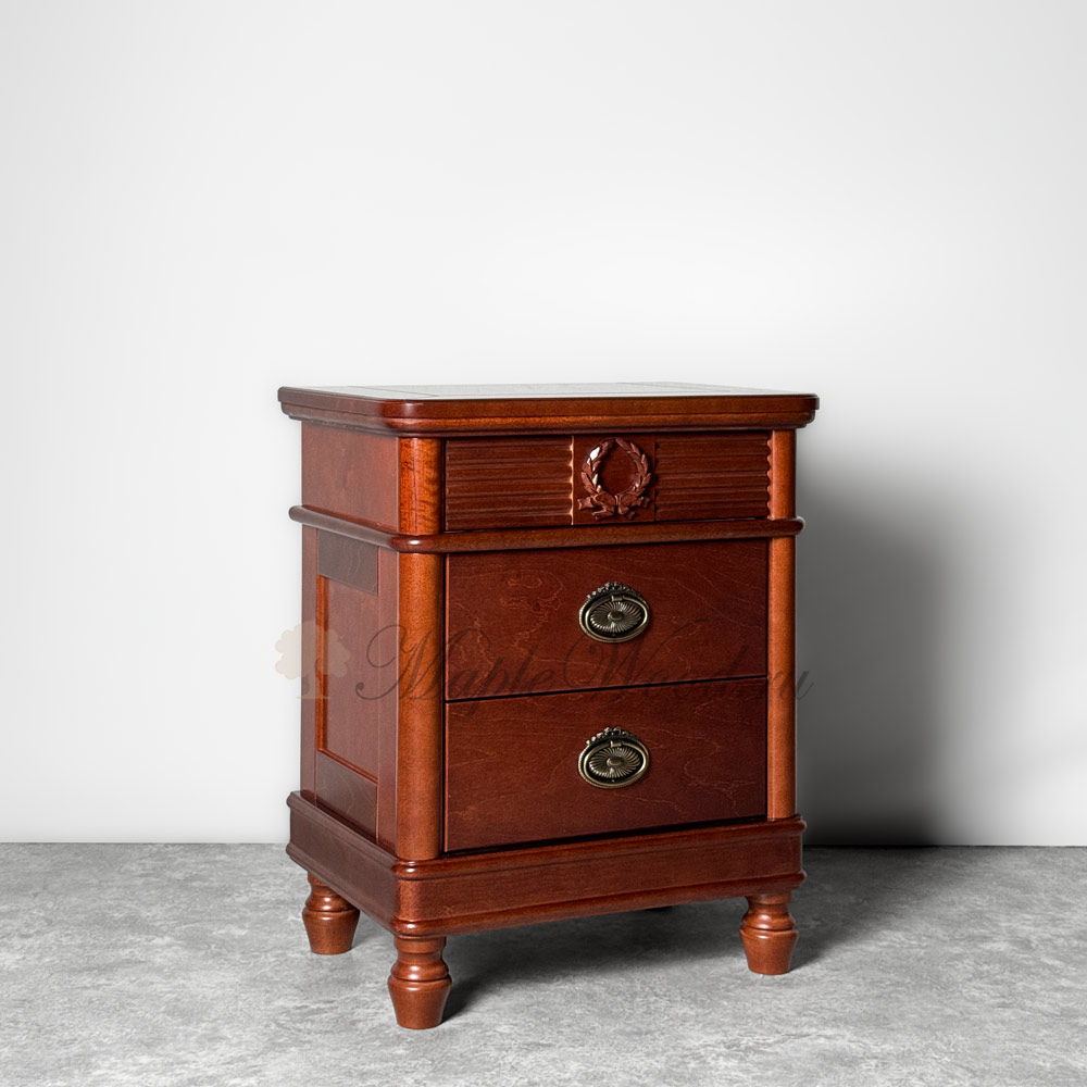 Прикроватная тумба для спальни, выполненная из массива карельской березы и произведённая в Беларуси, является репликой известной коллекции Мария Сильва от румынского производителя Monte Cristo Mobili.