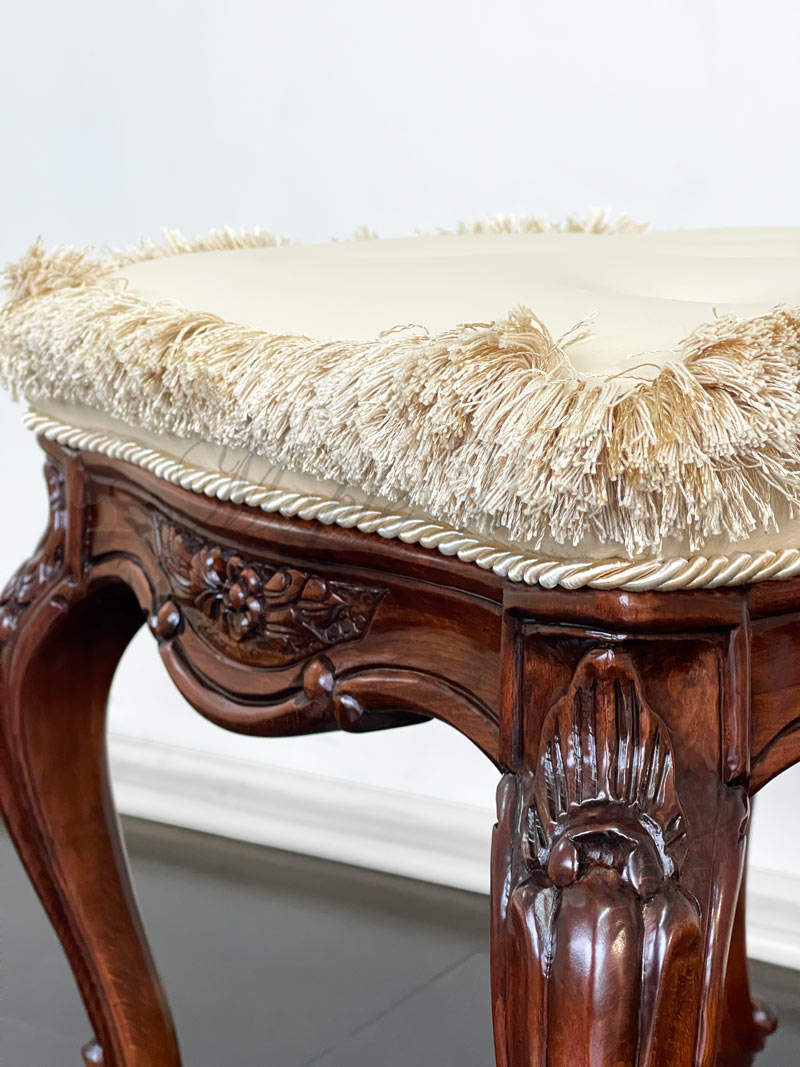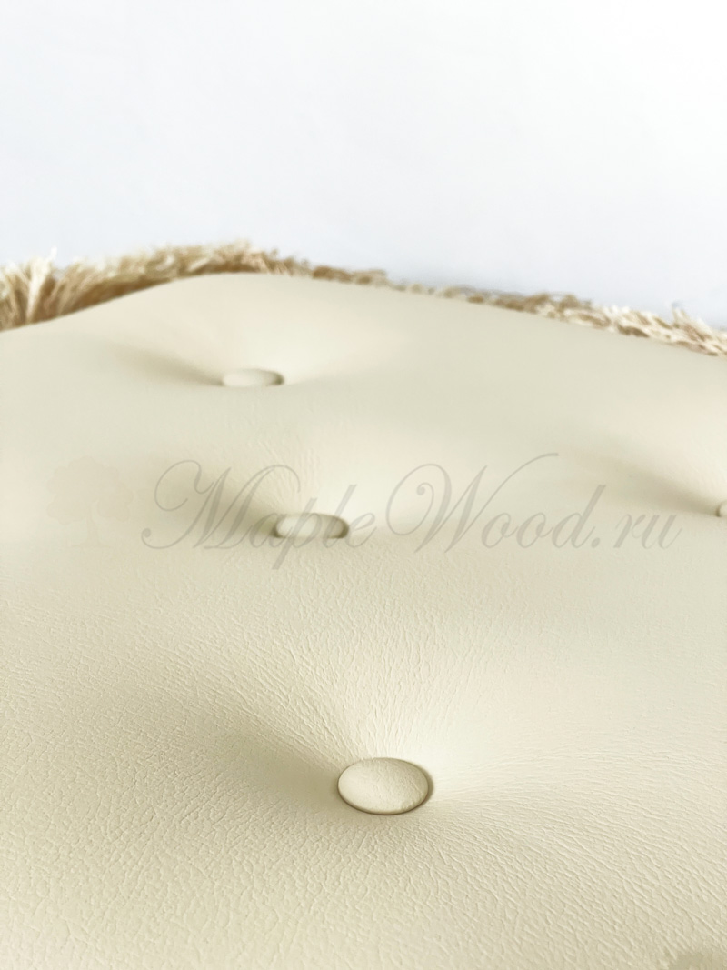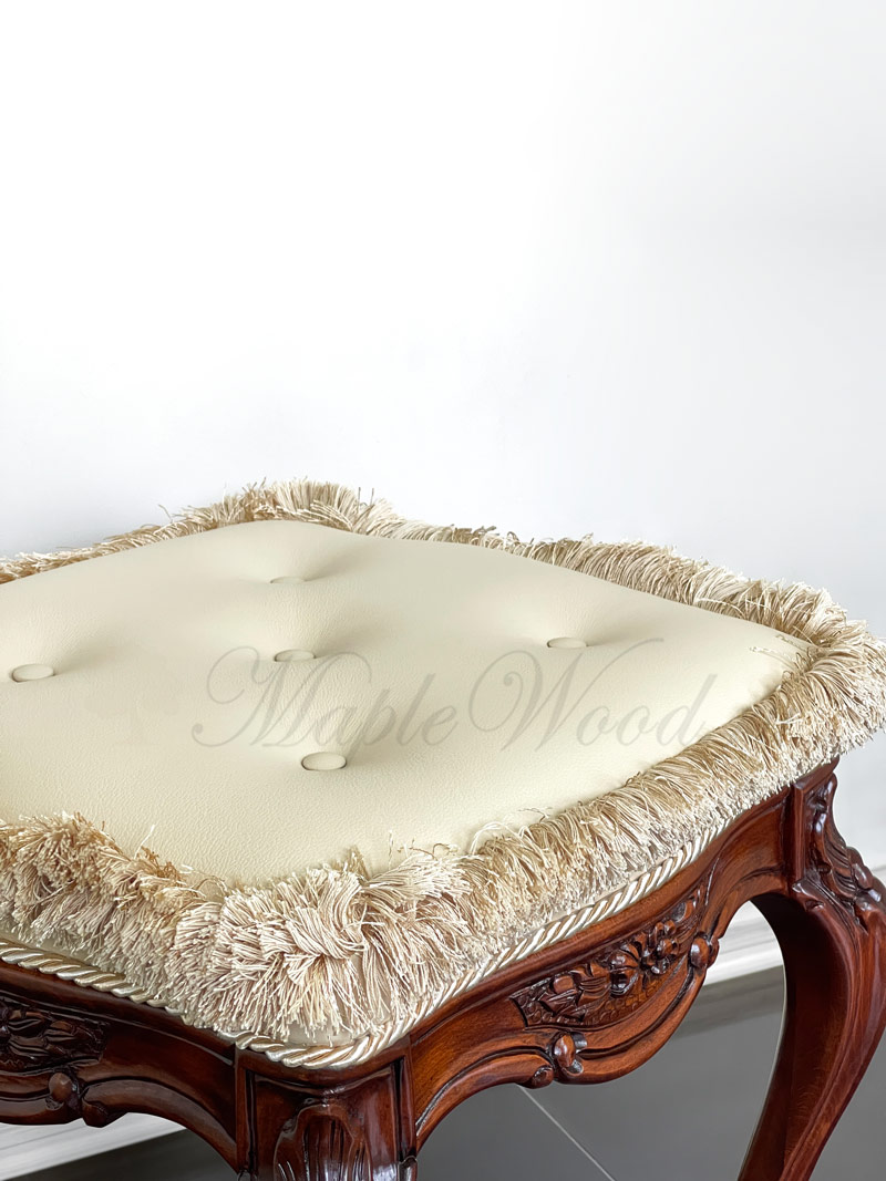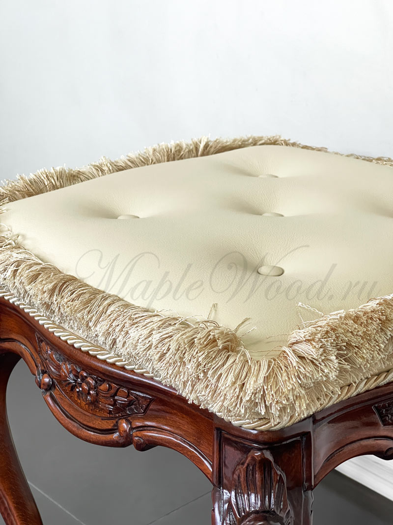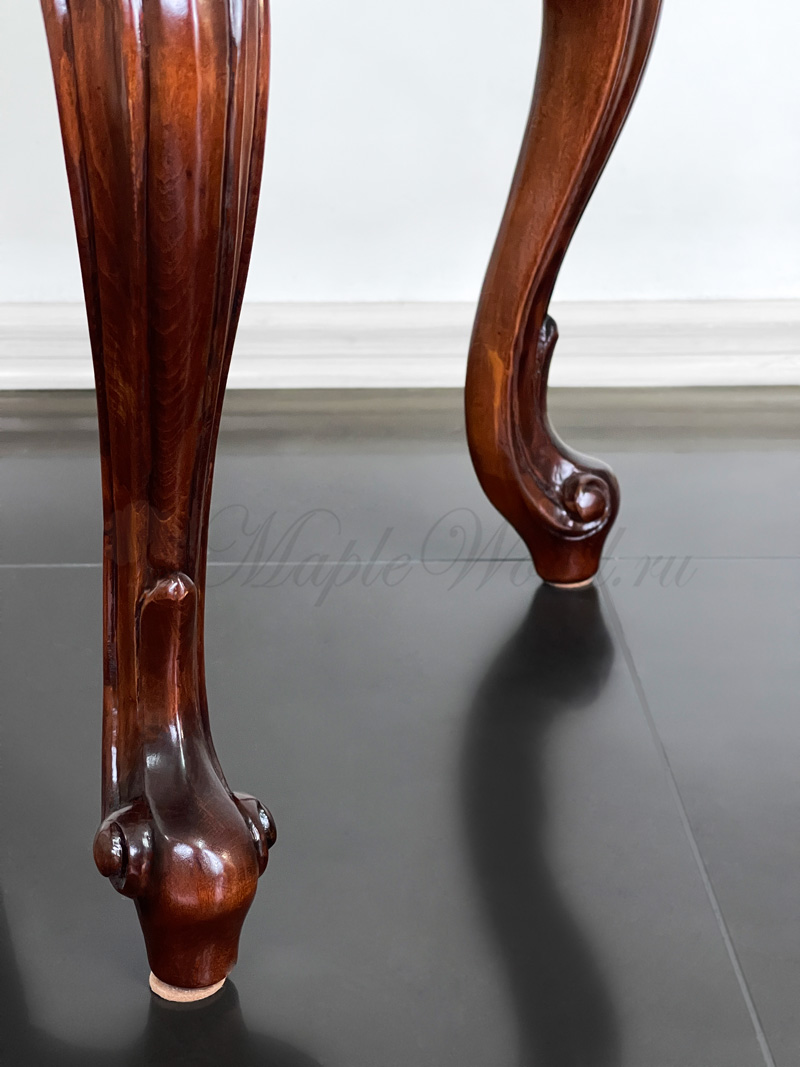 Каркас изделия выполнен из массива дерева и декорирован эффектной резьбой, а в качестве обивочного материала использована натуральная кожа.