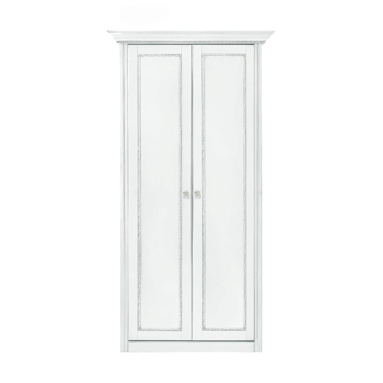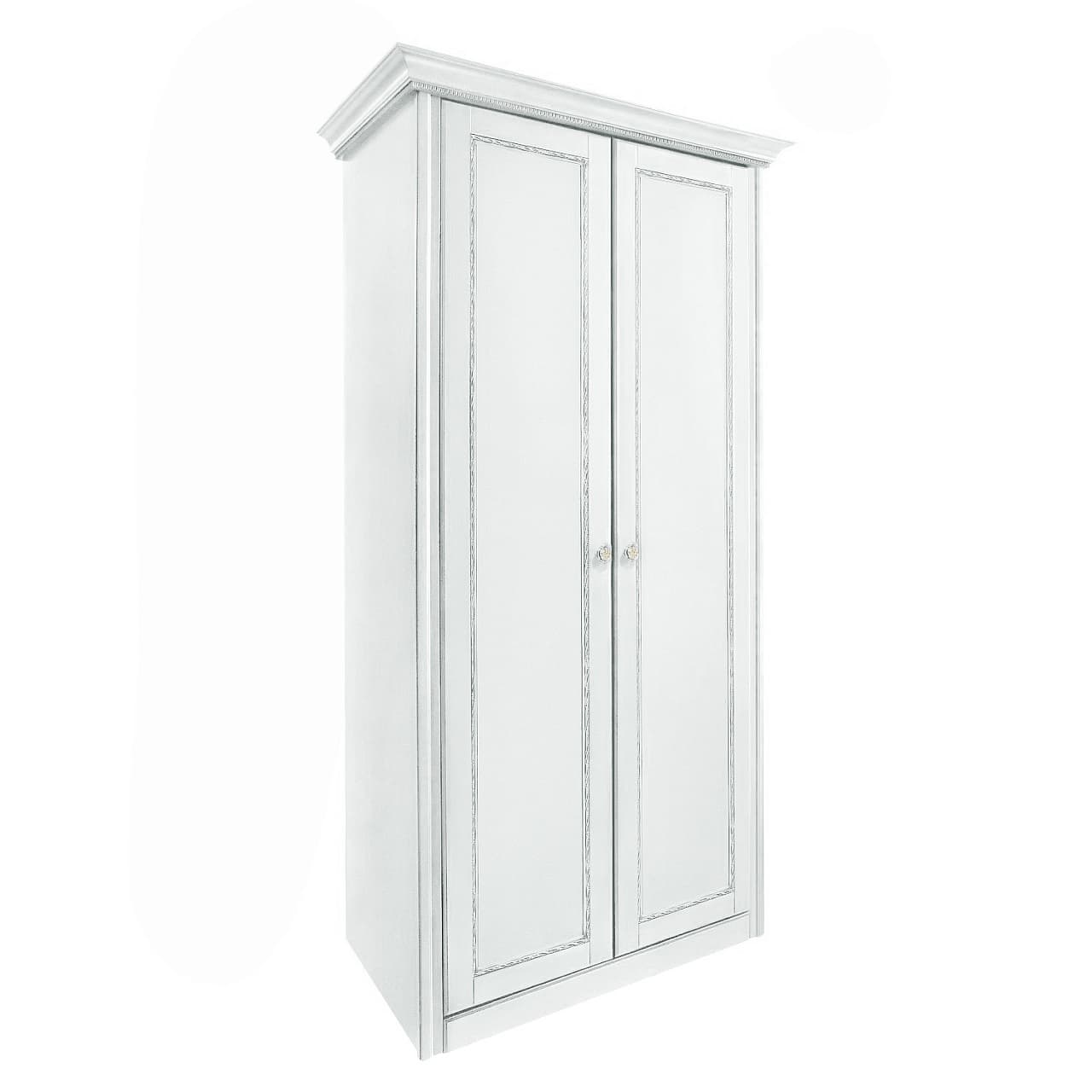 Распашной 2-х дверный шкаф для небольшой спальни из коллекции Палермо от фабрики Тимбер выполнен в белом оттенке из шпонированного МДФ с элементами из массива дерева и декорирован серебряной патиной, которая подчеркивает акцентные детали изделия.