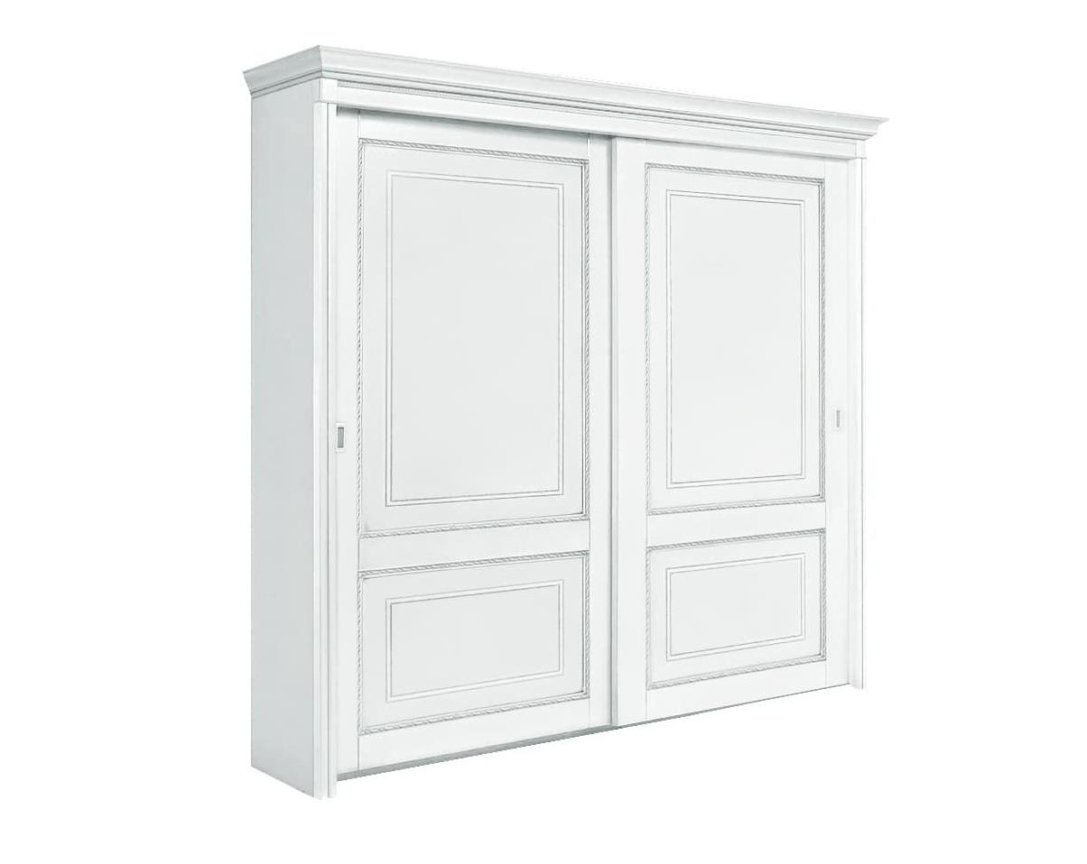Белый шкаф-купе из коллекции Неаполь от фабрики Тимбер выполнен в классическом дизайне из шпонированного МДФ с элементами из массива дерева и декорирован контрастной патиной, которая завершает дизайн изделия.