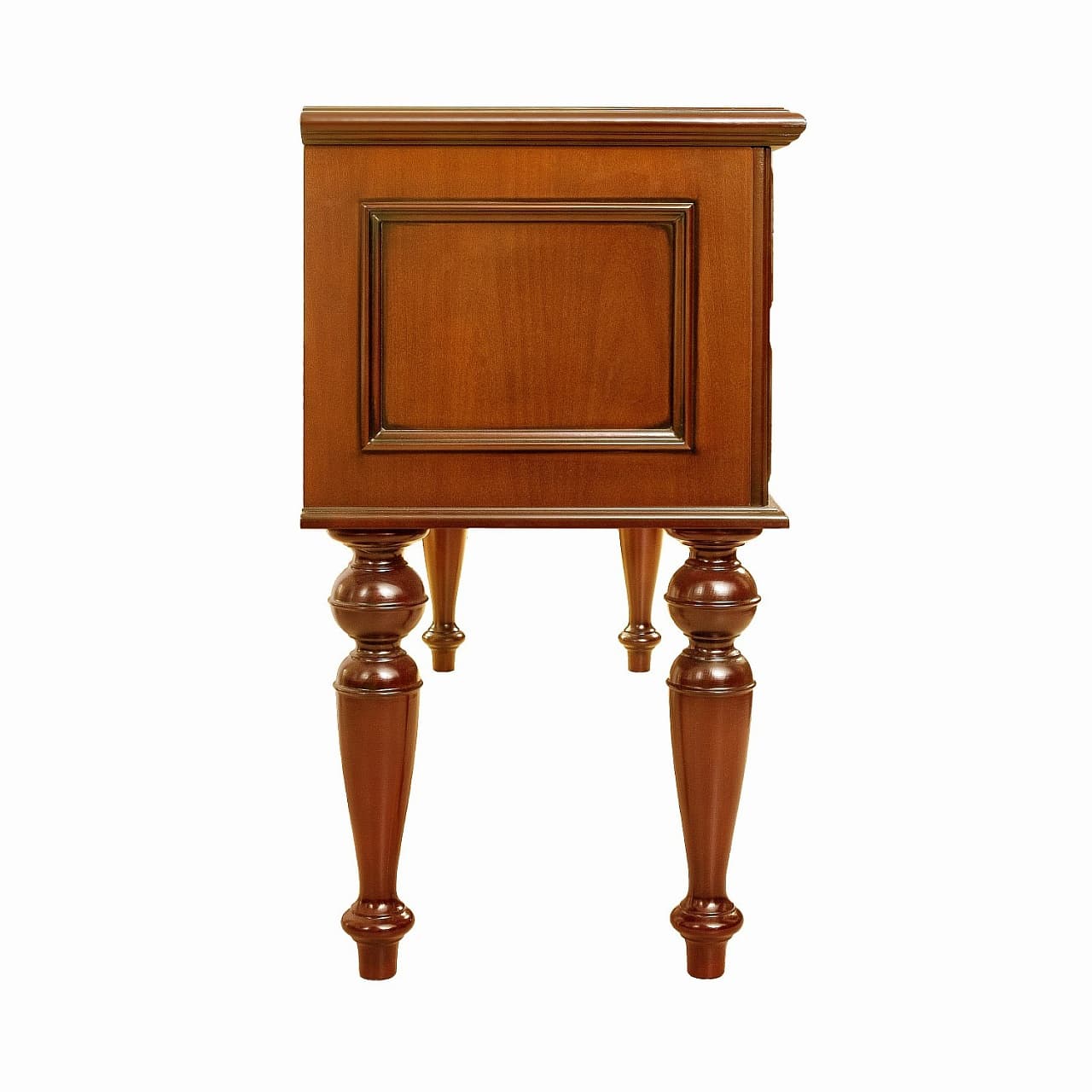 Изделие выполнено из шпонированного МДФ с элементами из массива дерева и декорировано контрастной патиной, которая завершает классический дизайн туалетного стола.