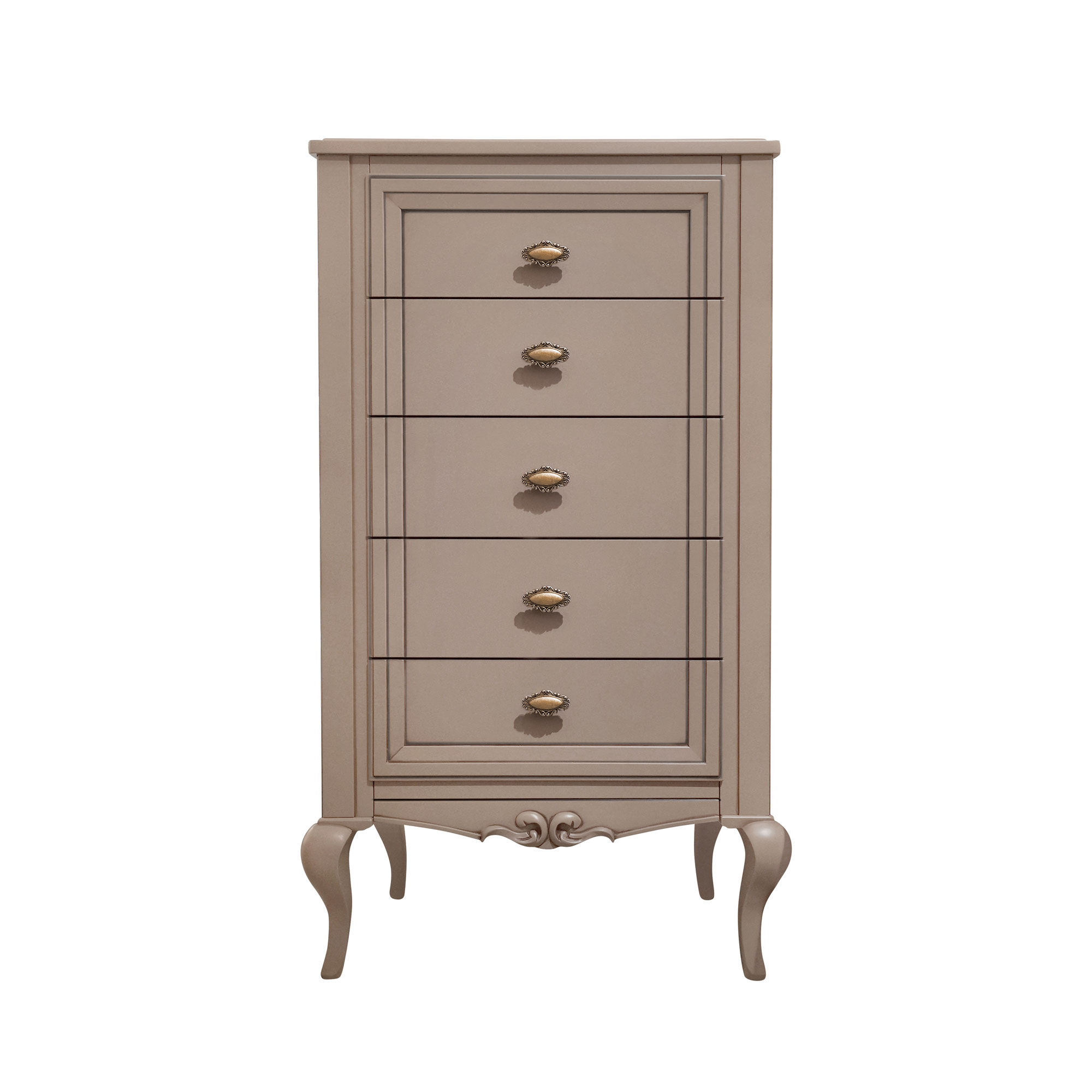 Высокий комод с четырьмя выдвижными ящиками из коллекции Портофино от фабрики Тимбер выглядит лёгким и воздушным за счет фигурных ножек и пастельного оттенка, поэтому изделие подойдет даже в небольшую спальню, зрительно облегчив интерьер.