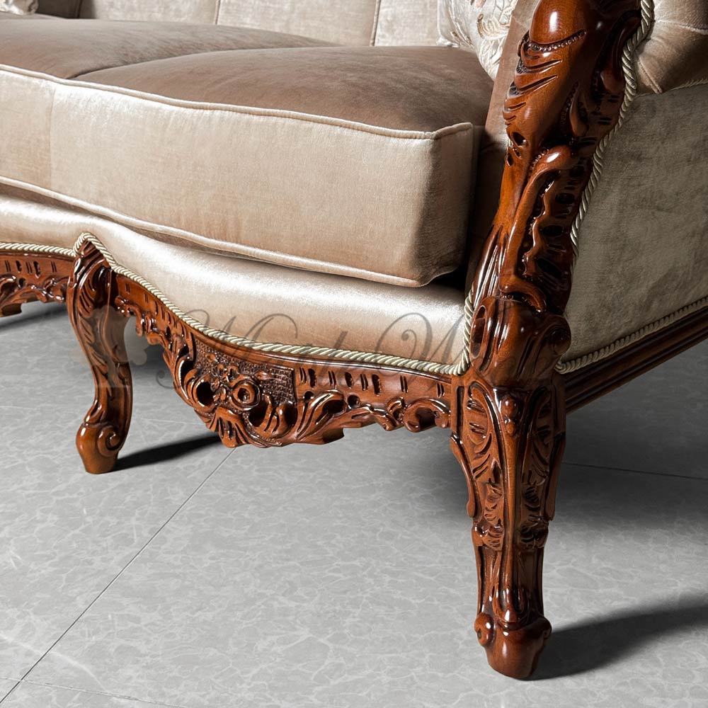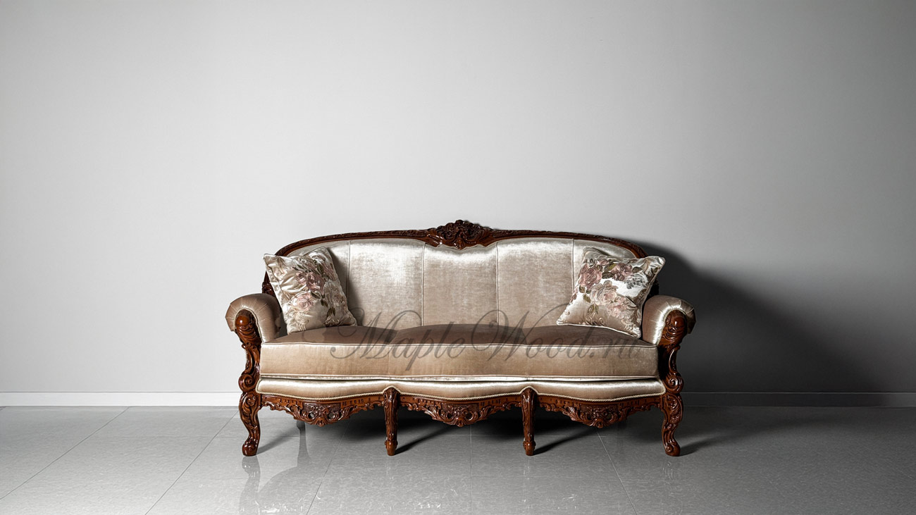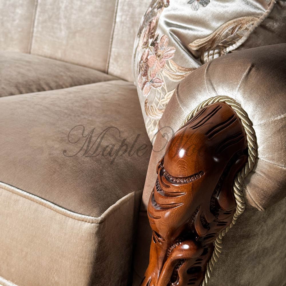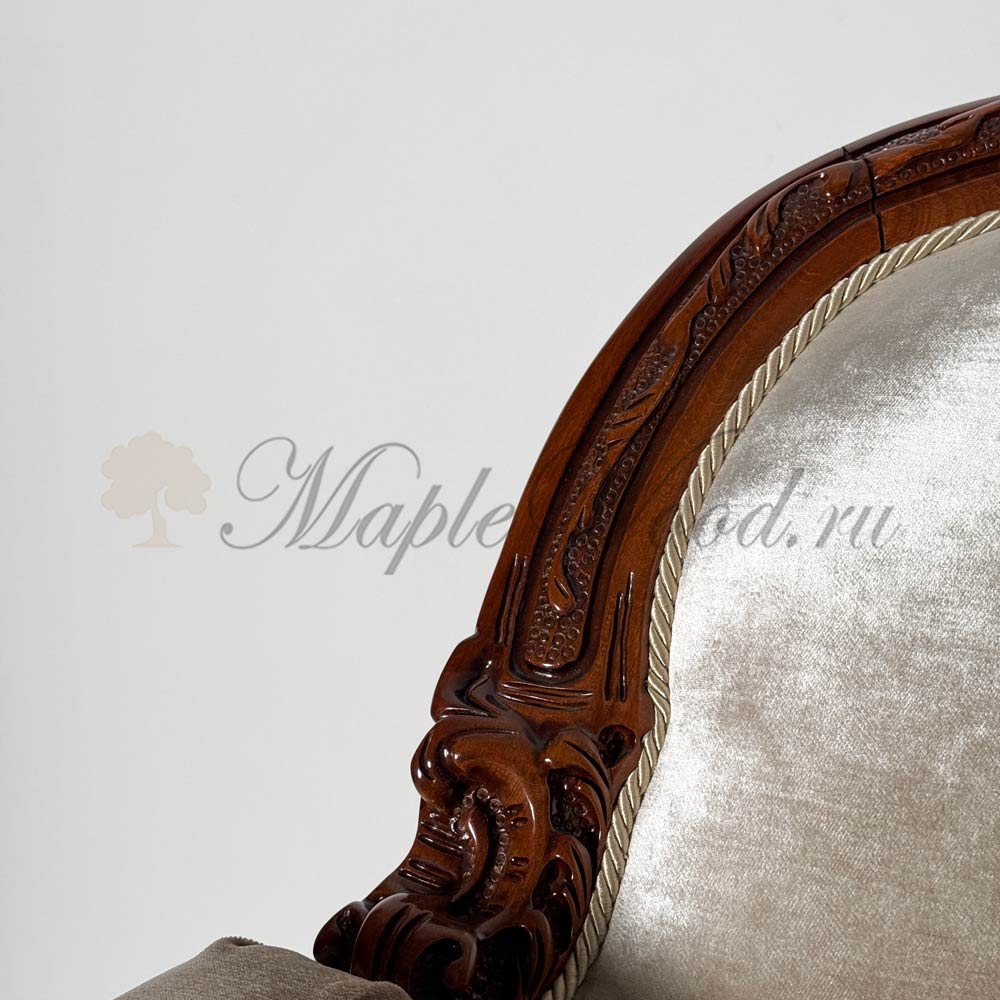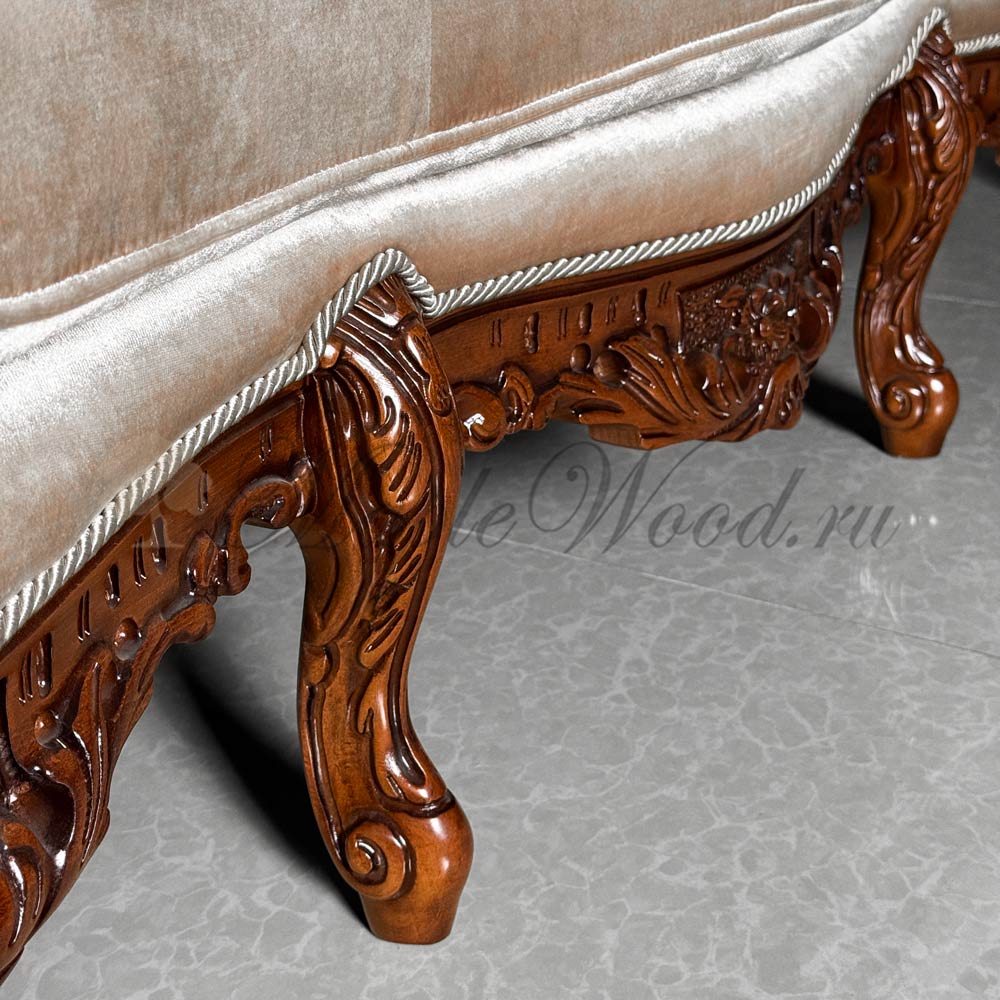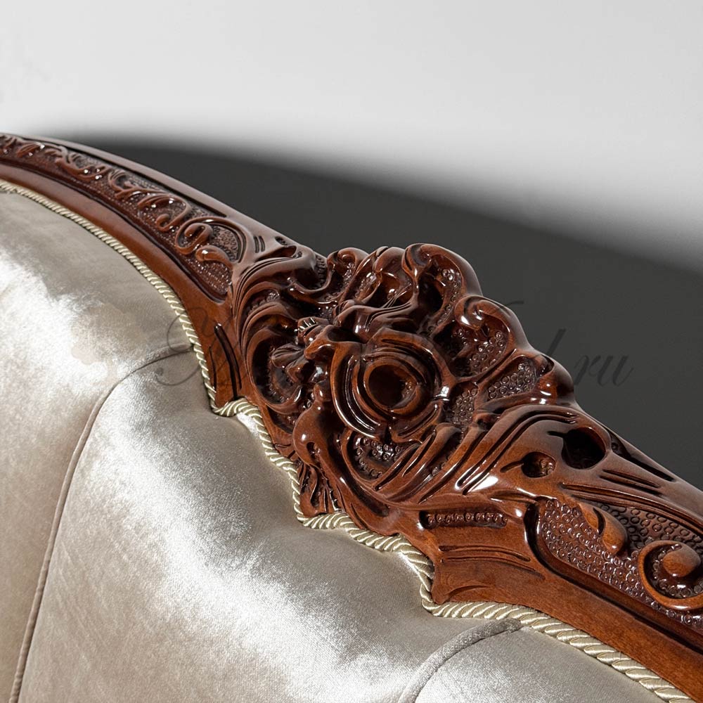 Каркас изделия выполнен из массива дерева и щедро декорирован художественной резьбой, а в качестве обивочного материала используется велюр премиального качества или натуральная кожа из каталога производителя.