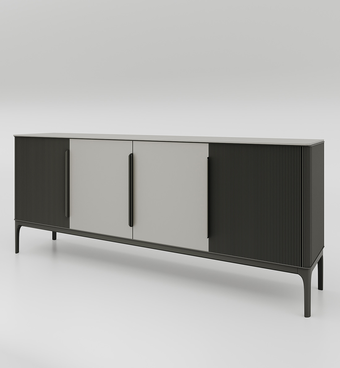 Дизайн комода объединяет минималистичные формы и разнообразные текстуры: гладкий МДФ придаёт современный вид, а фрезеровка добавляет интерес и визуальную привлекательность.
