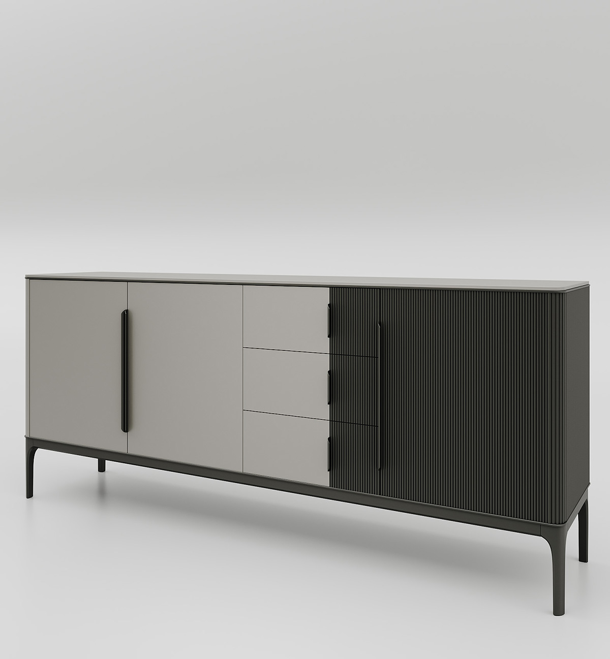 Дизайн комода объединяет минималистичные формы и разнообразные текстуры: гладкий МДФ придаёт современный вид, а фрезеровка добавляет интерес и визуальную привлекательность.