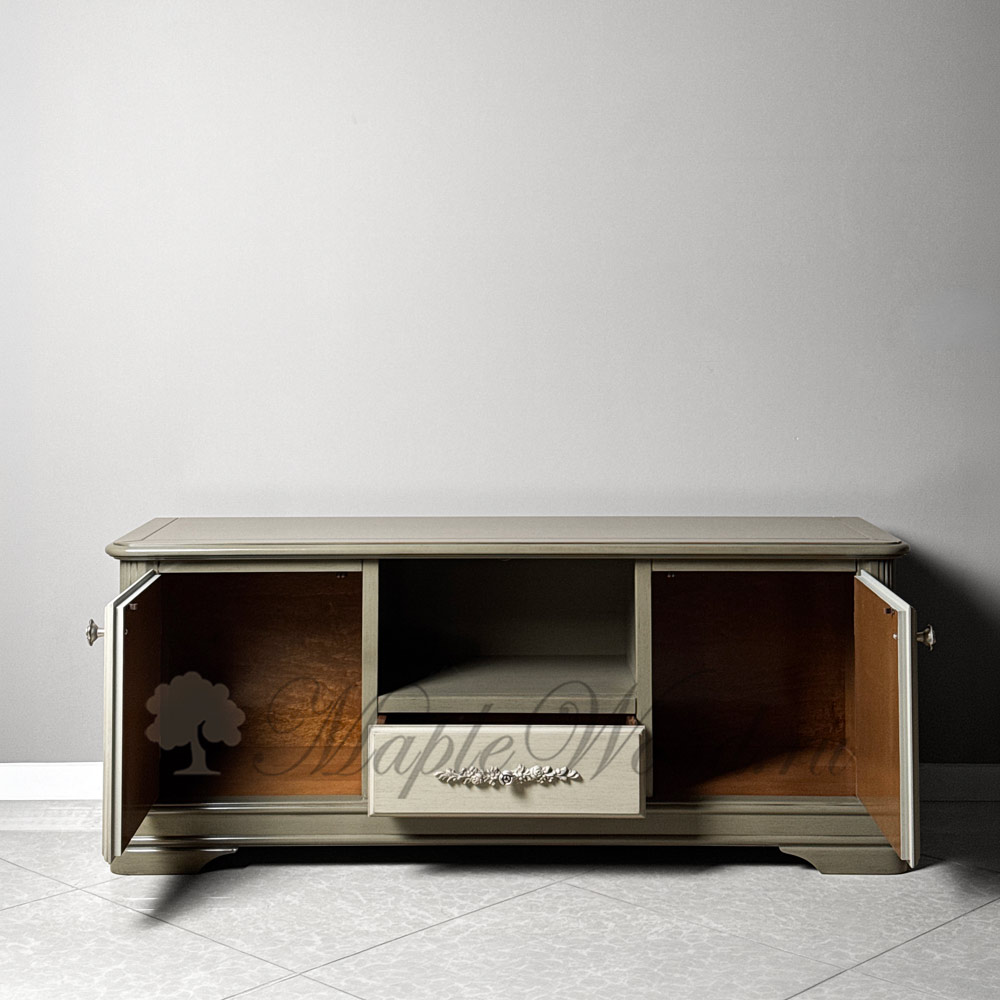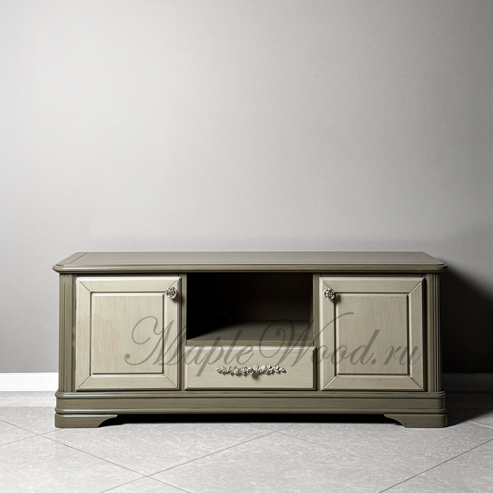 Тумба под ТВ из коллекции «Артемида» от фабрики Monte Cristo Mobili выполнена в неоклассическом стиле из натурального массива дерева в оригинальном оливковом оттенке.