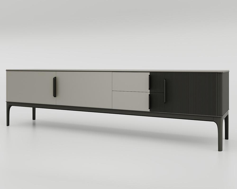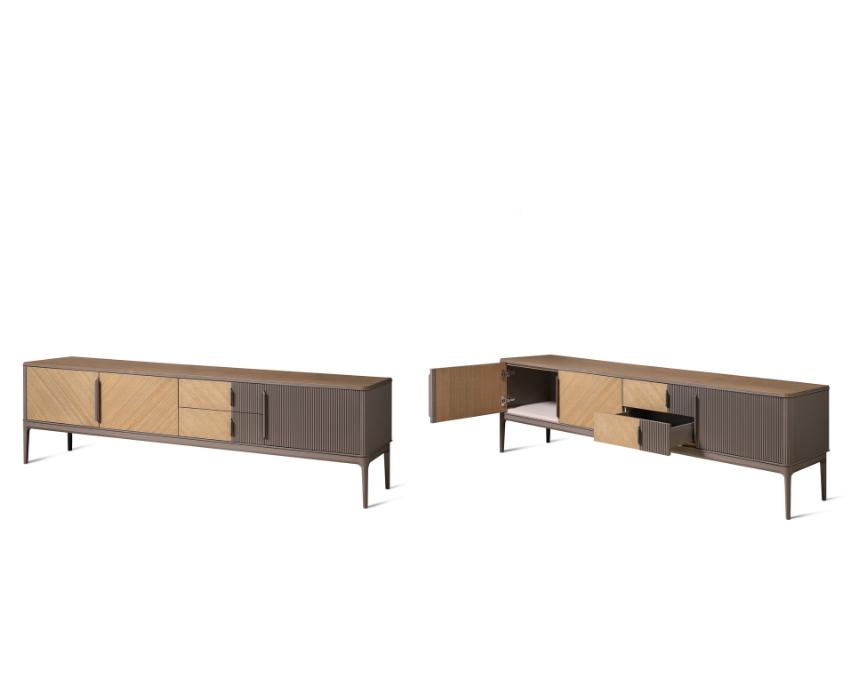 Тумба под ТВ из коллекции Модена от фабрики Тимбер — эта модель оснащена двумя отделениями за распашными дверцами и удобными выдвижными ящиками.