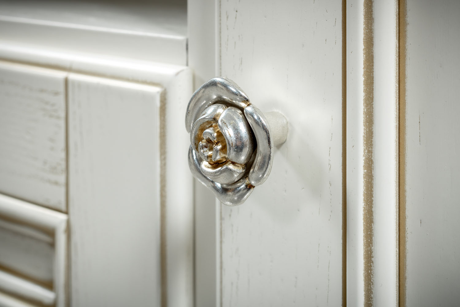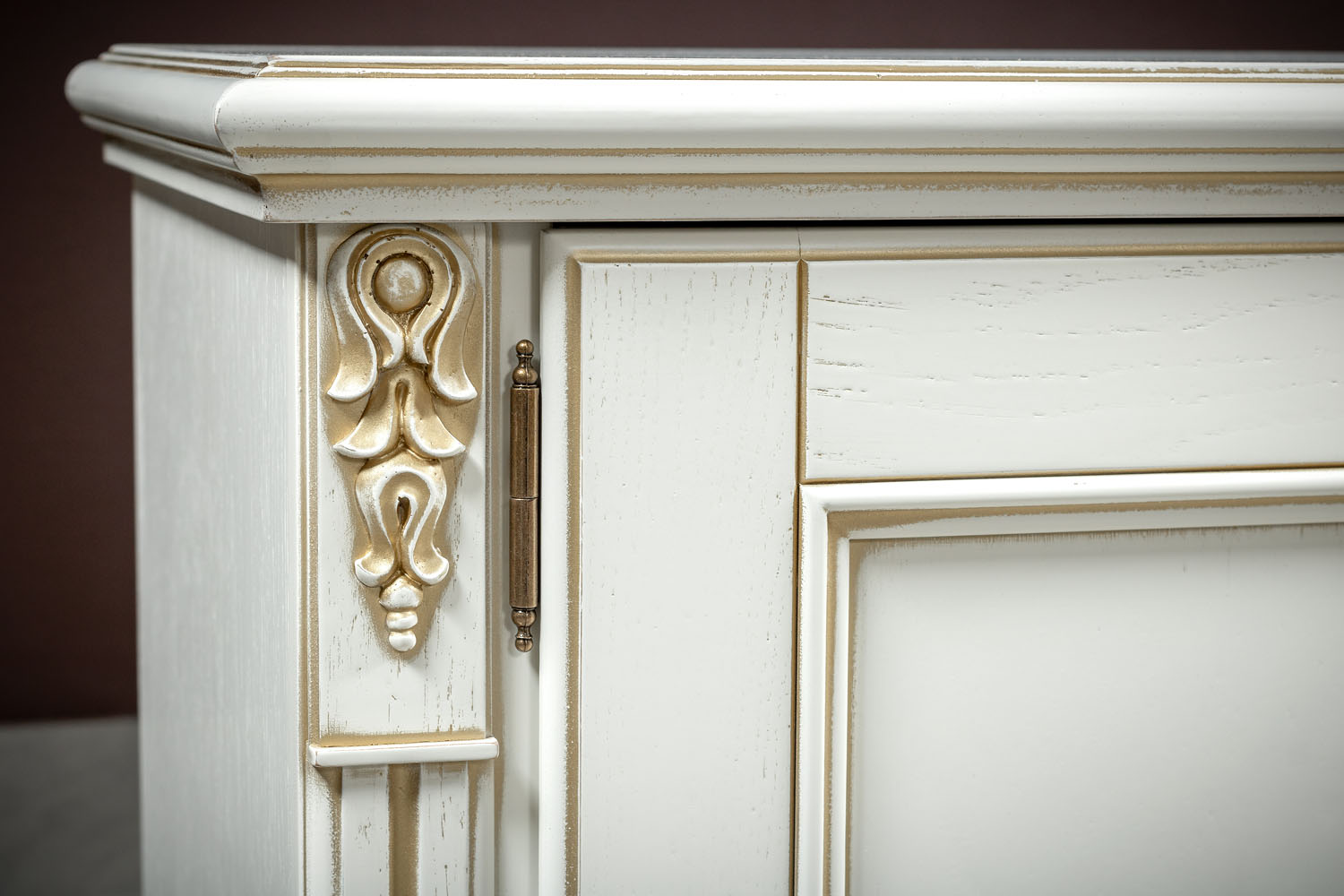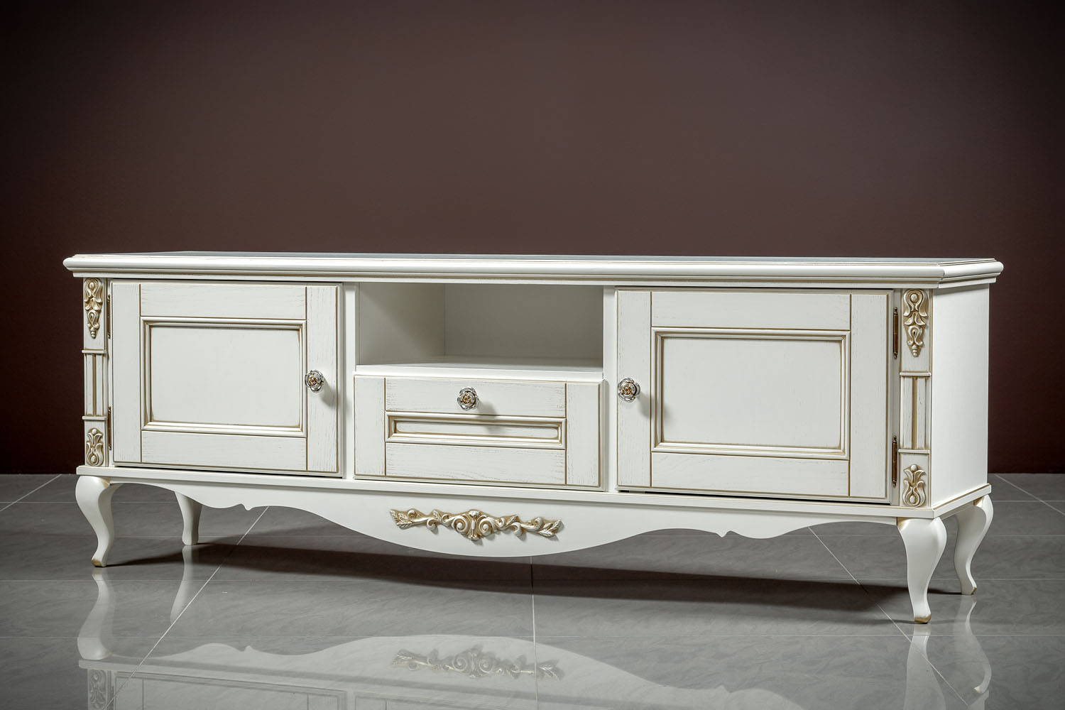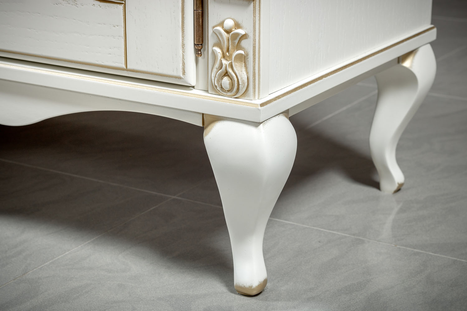 ТВ тумба выполнена в светлом оттенке из шпонированного МДФ с элементами из массива дерева и декорирована золотой патиной, которая подчеркивает классический дизайн изделия.