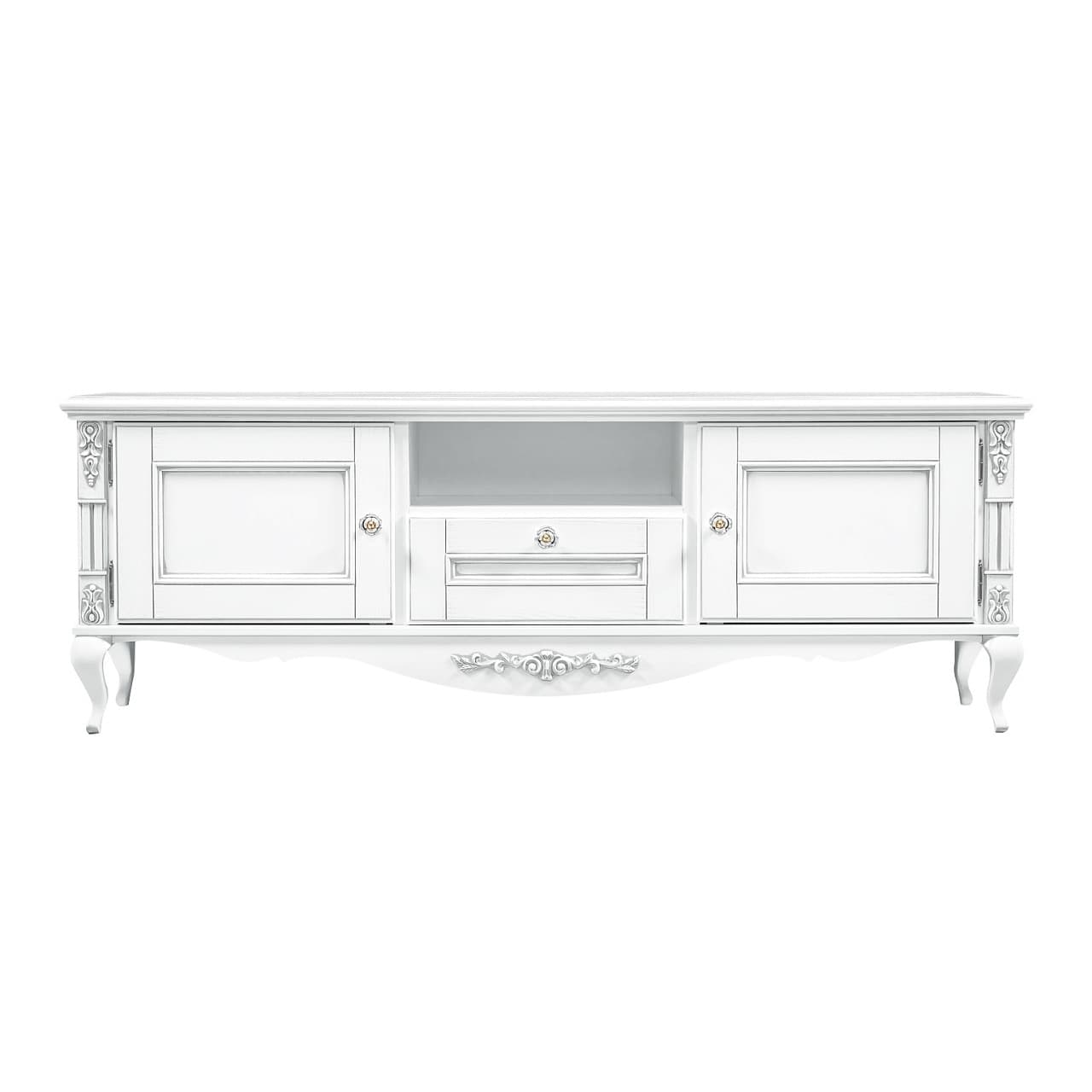 Белая тумба под ТВ из коллекции Неаполь от фабрики Тимбер выполнена в классическом стиле из шпонированного МДФ с элементами из массива дерева и декорирована контрастной патиной, которая завершает дизайн изделия.
