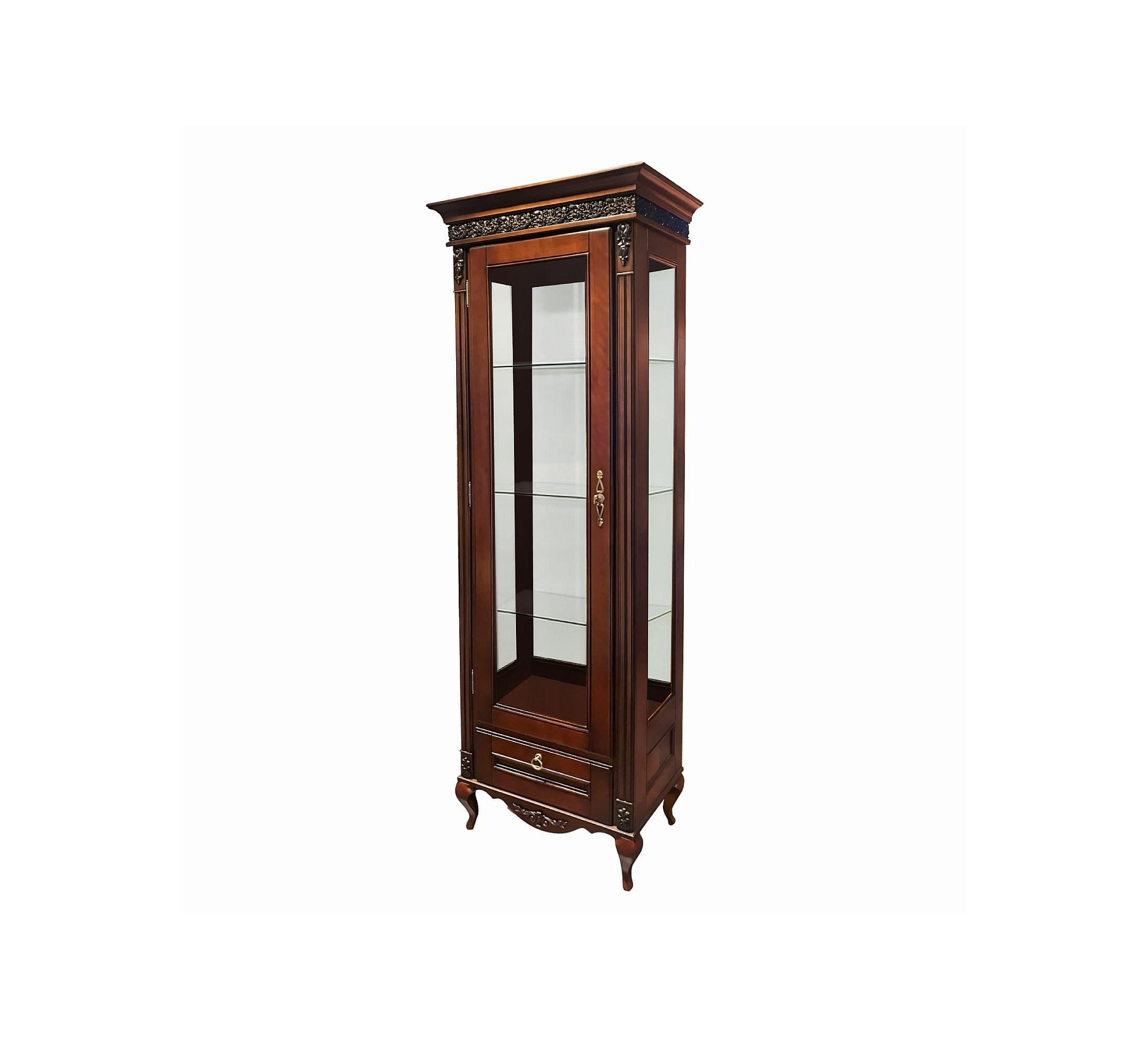 Витрина оборудована выдвижным ящиком и тремя стеклянными полками на которых можно разместить посуду или другие предметы декора.