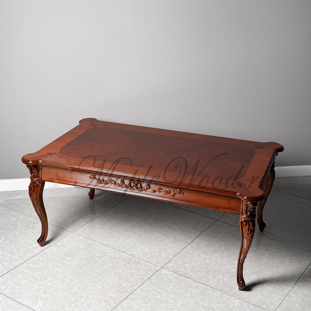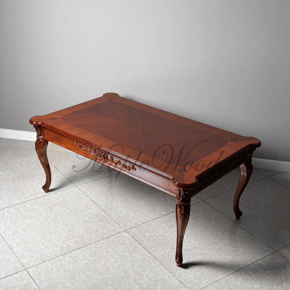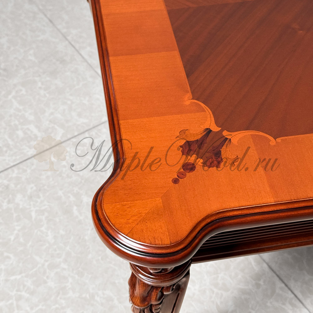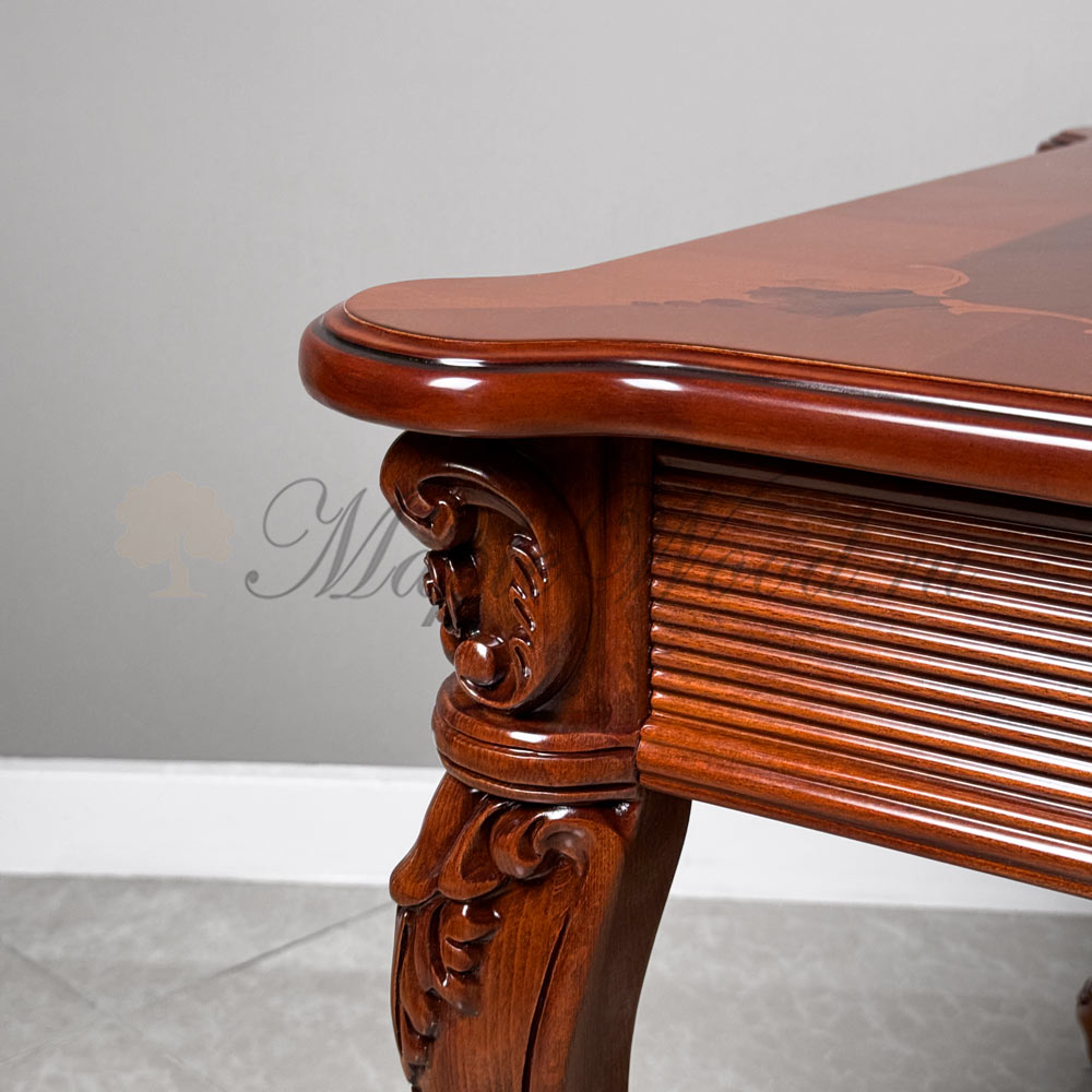 Стол выполнен из массива дерева ореха и декорирован эффектной резьбой и инкрустацией из шпона.