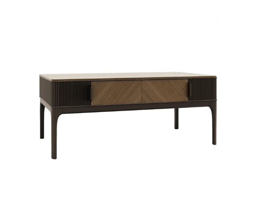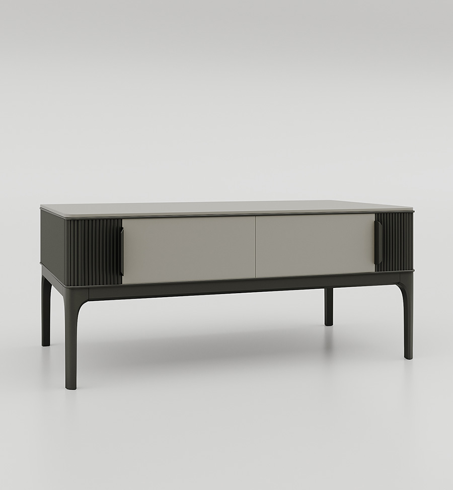Отделка стола привлекает внимание своим интересным сочетанием двух цветов и текстур: гладкая поверхность создает эффект современности, а фрезеровка добавляет глубину и характер.