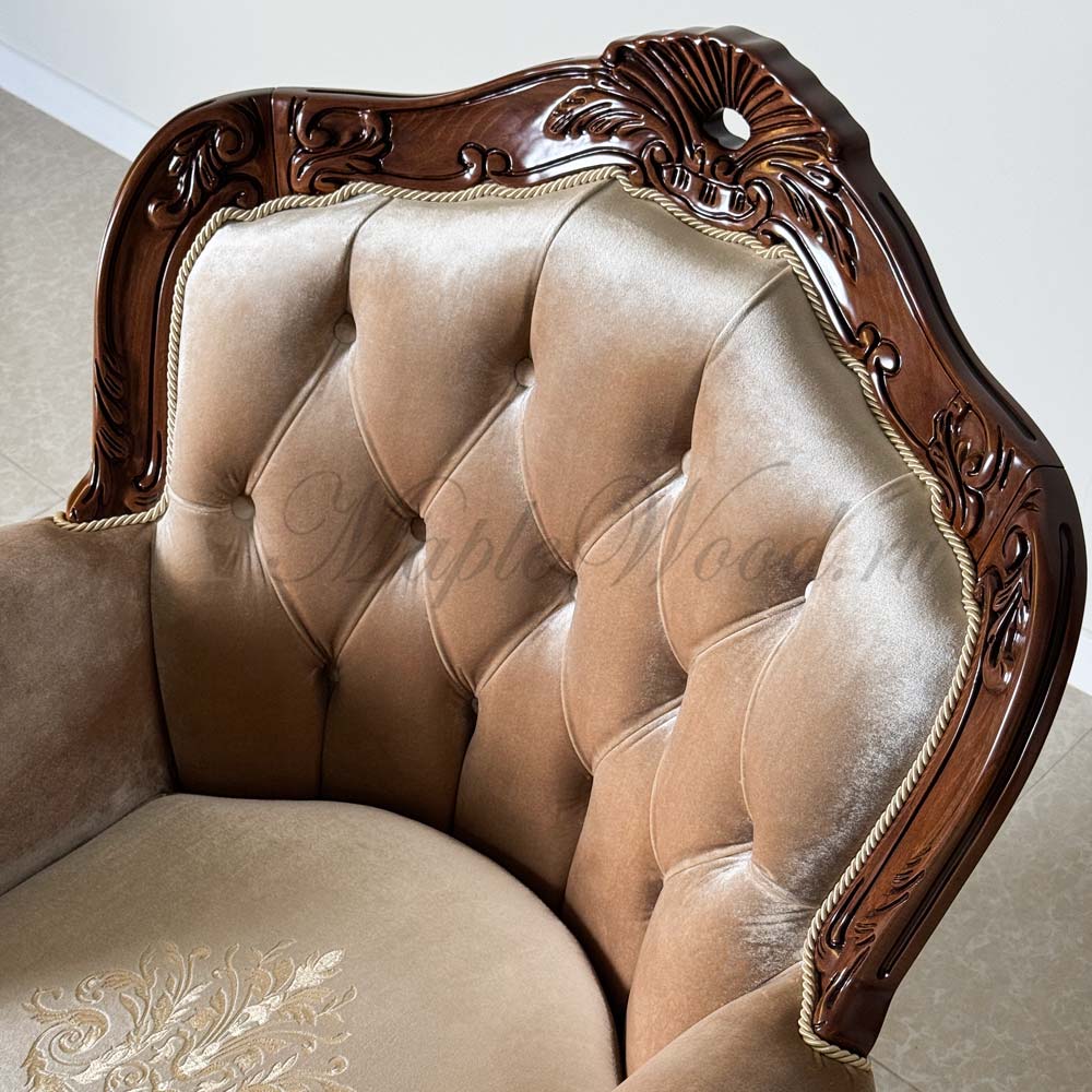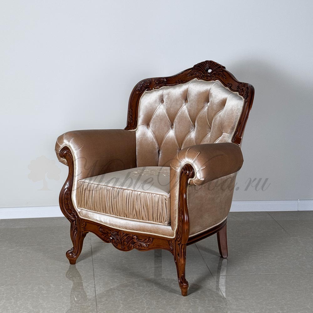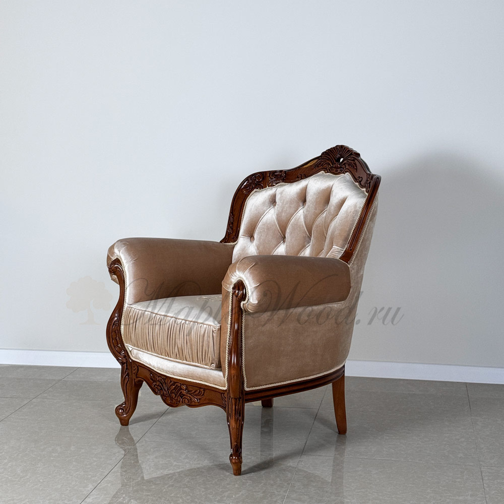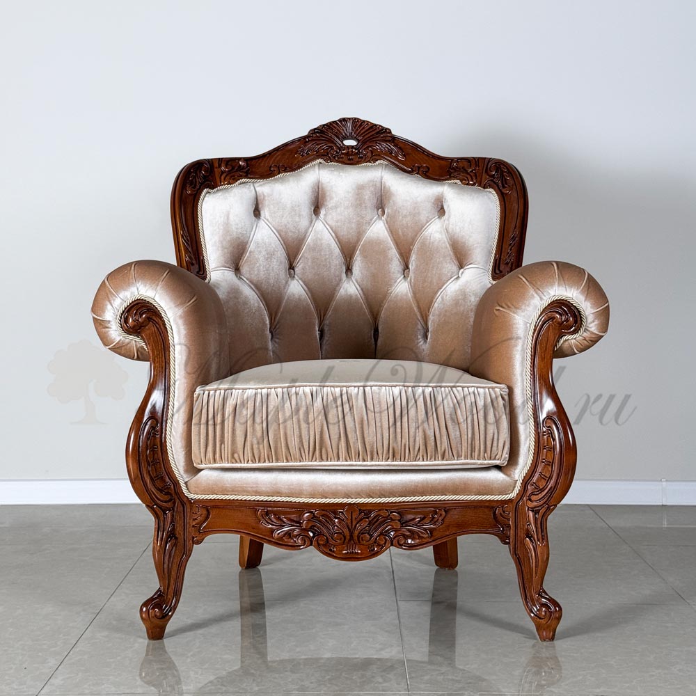 Кресло на фигурных ножках от бренда Prokess из коллекции Моцарт является визуально легкой моделью в каталоге производителя, благодаря своей лаконичной резьбе, которая не перегружает дизайн изделия, а расставляет акценты на деревянном каркасе, подчеркивая сдержанный стиль классики.