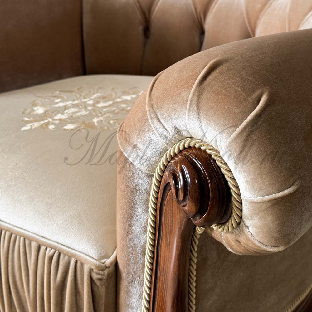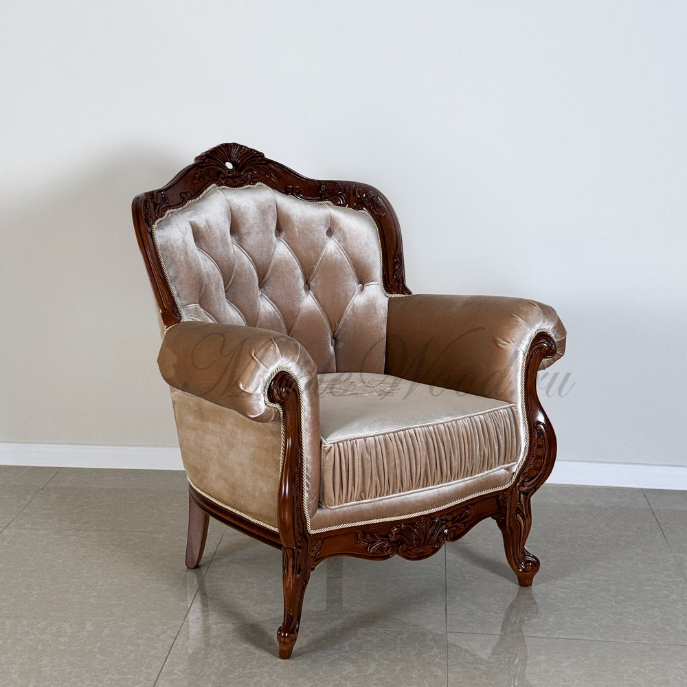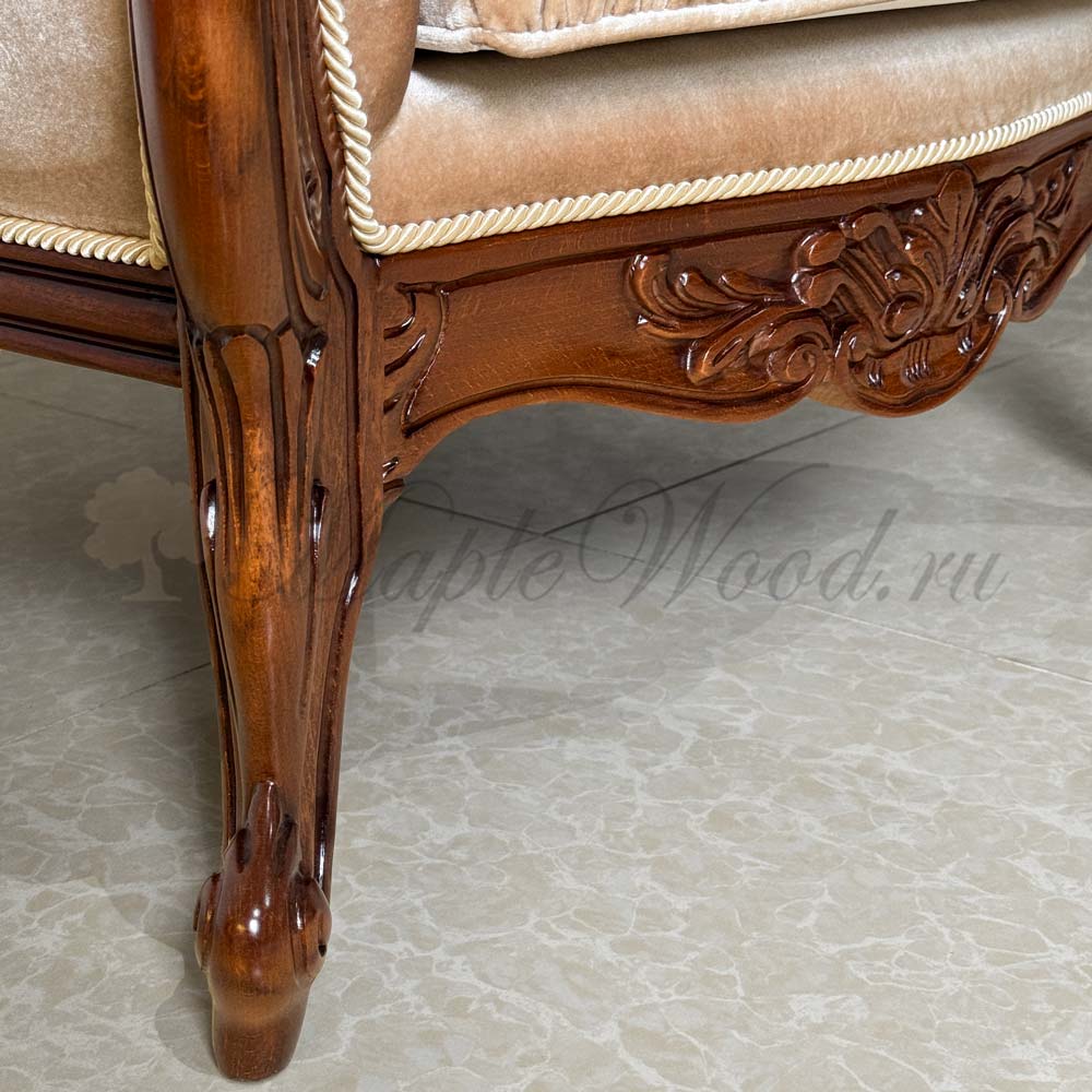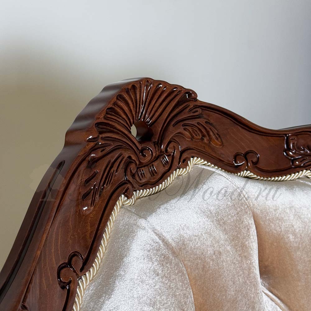 Кресло на фигурных ножках от бренда Prokess из коллекции Моцарт является визуально легкой моделью в каталоге производителя, благодаря своей лаконичной резьбе, которая не перегружает дизайн изделия, а расставляет акценты на деревянном каркасе, подчеркивая сдержанный стиль классики.