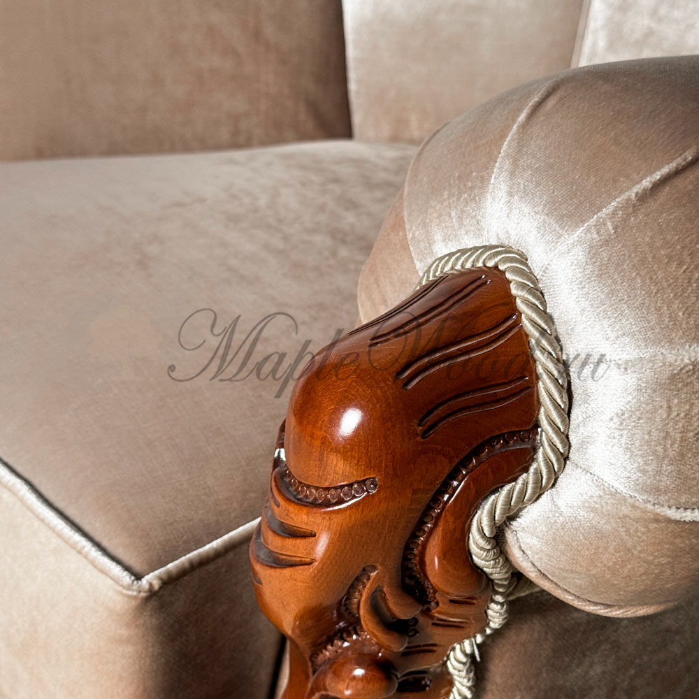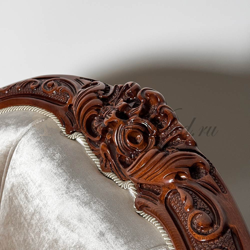 Каркас изделия выполнен из массива дерева и щедро декорирован художественной резьбой, а в качестве обивочного материала предлагается велюр премиального качества или натуральная кожа из каталога производителя.