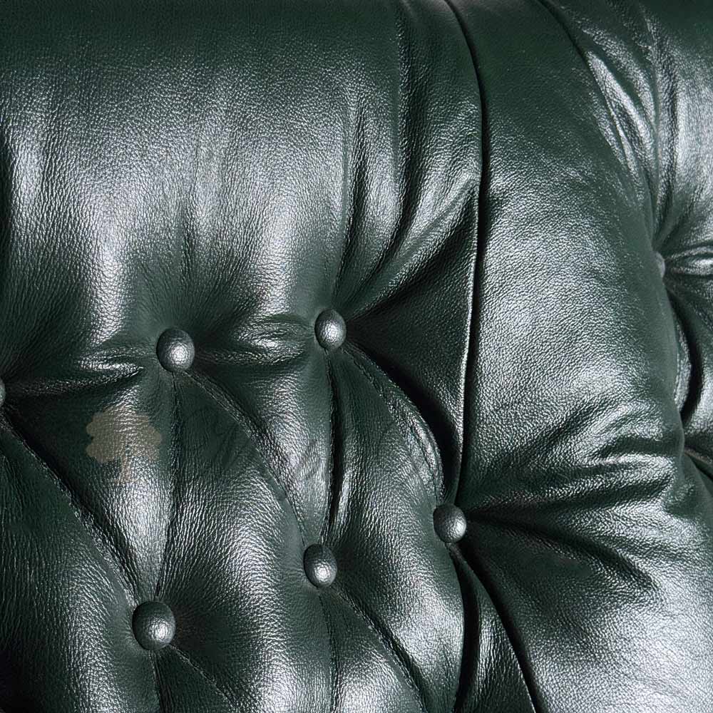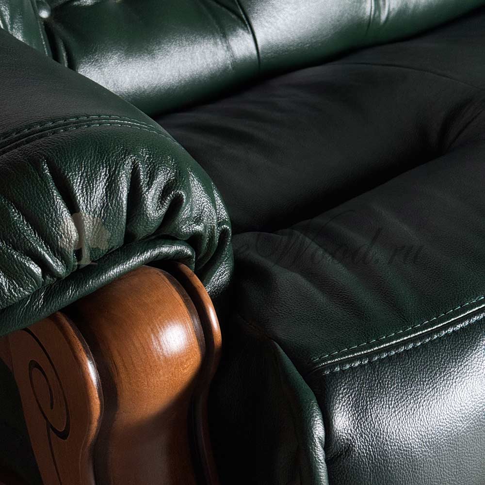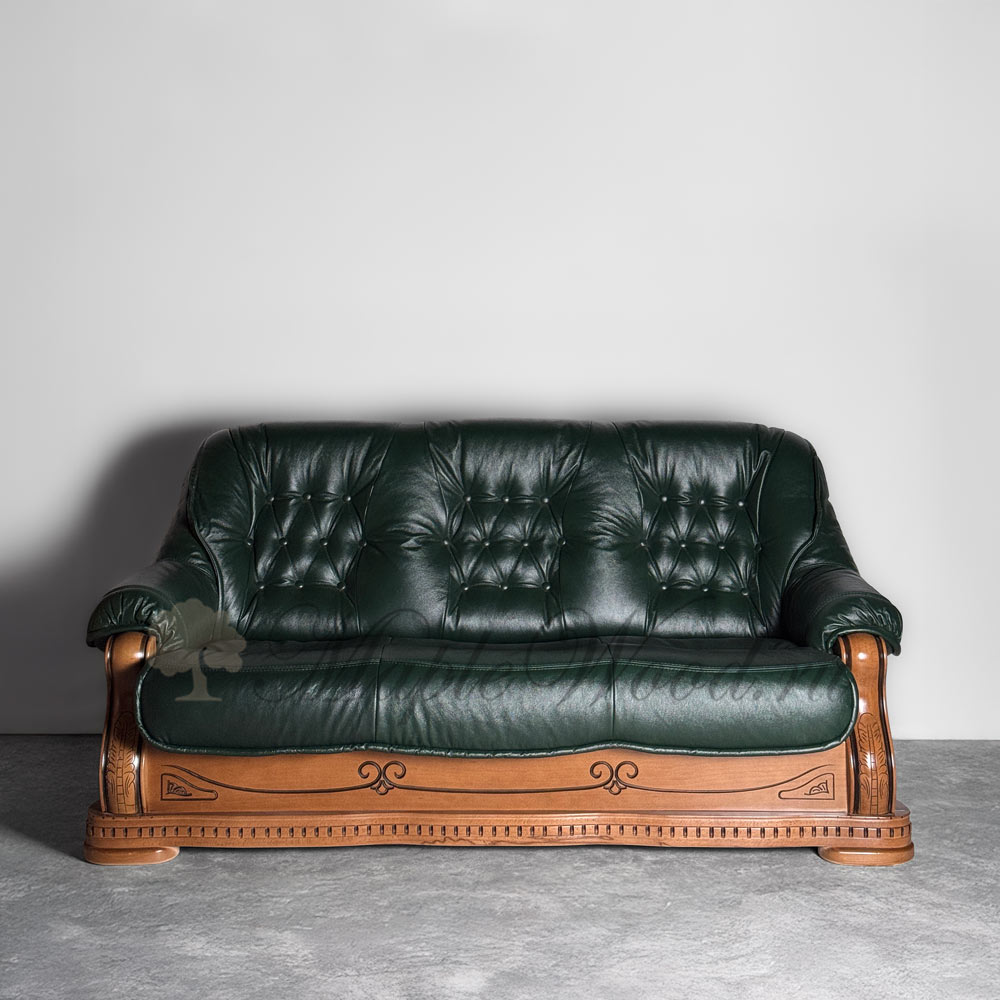 Каркас дивана выполнен из массива дерева, а в качестве обивочного материала использована натуральная кожа в зелёном оттенке.