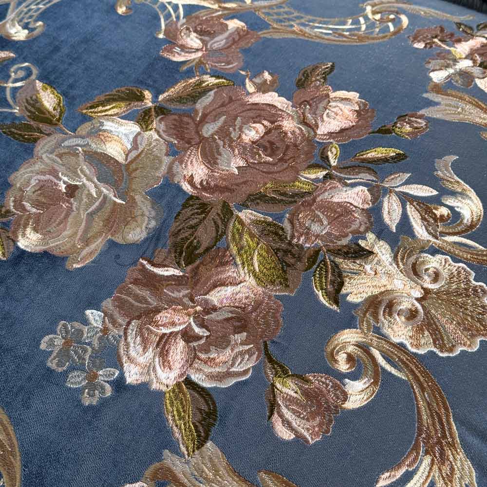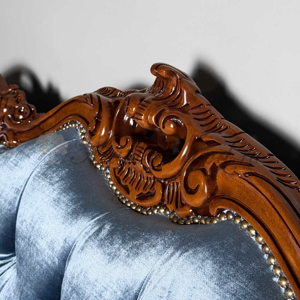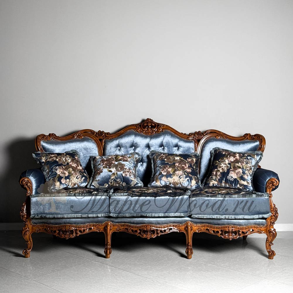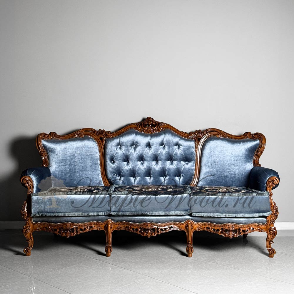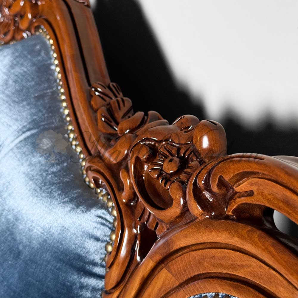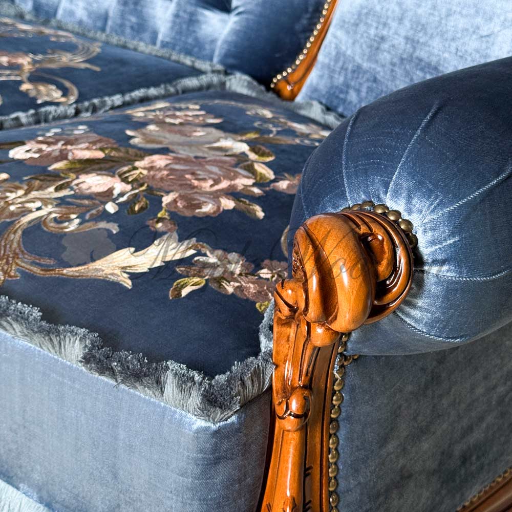 Резной каркас выполнен из массива дерева в оттенке «орех», а в качестве обивочного материала использован велюр в голубом оттенке, дополненный вышивкой на сиденье.