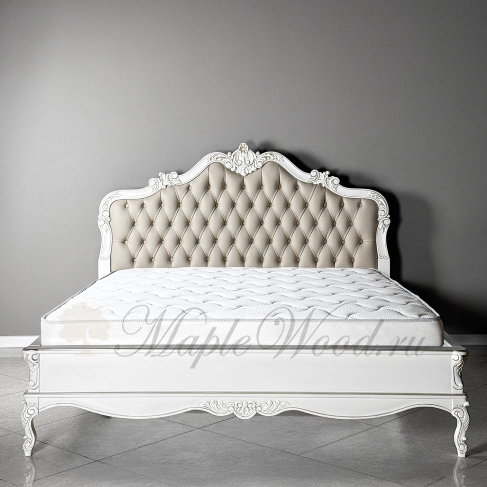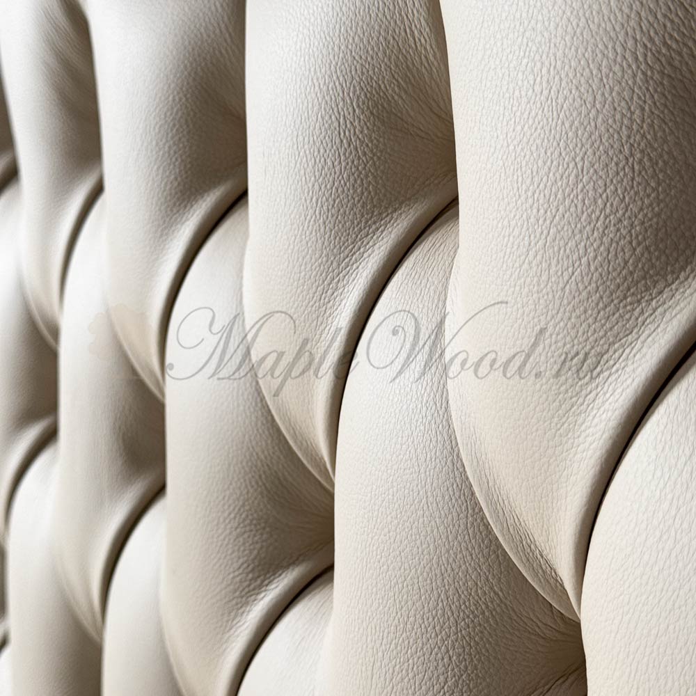 Особенность модели — большое изголовье, обтянутое натуральной кожей с декоративными пуговицами (каретная стяжка), что придаёт кровати благородный объём и классический стиль.